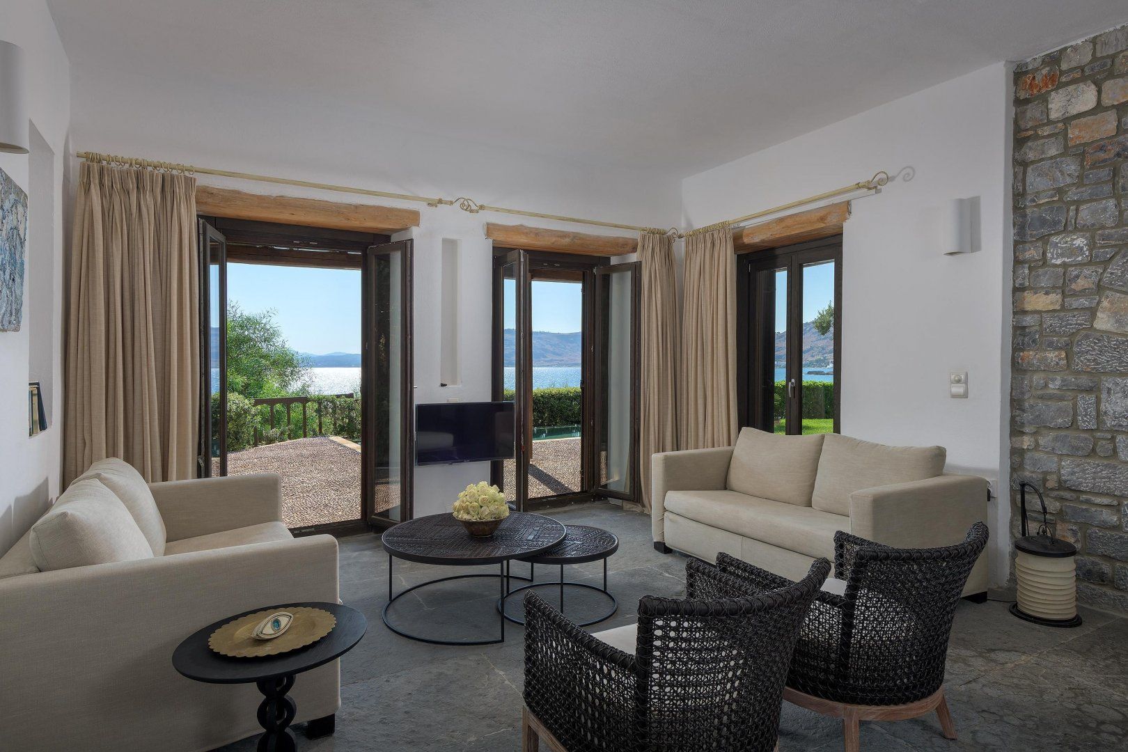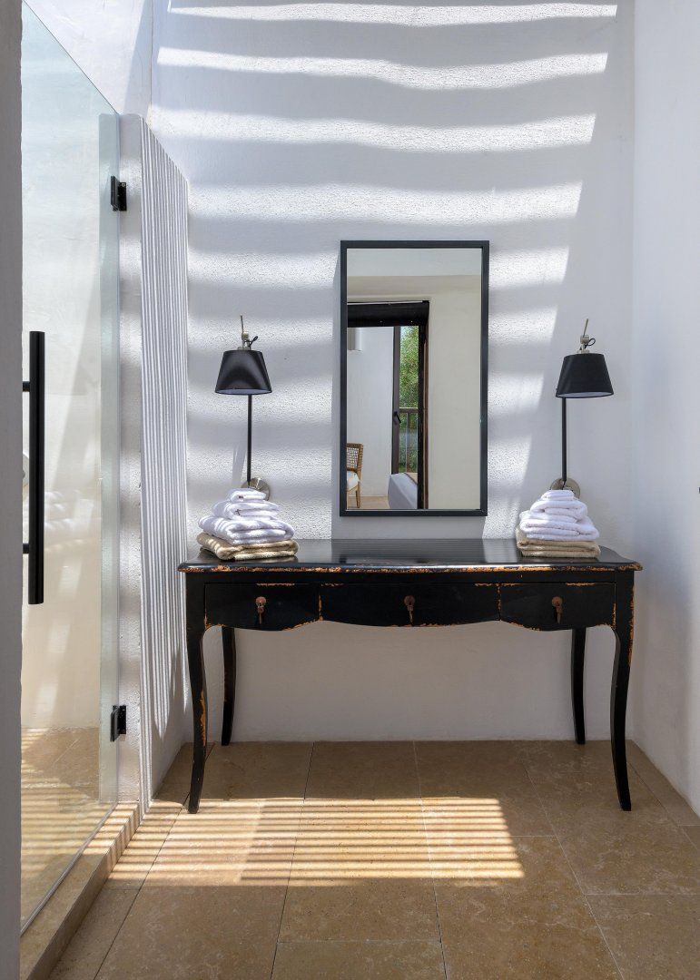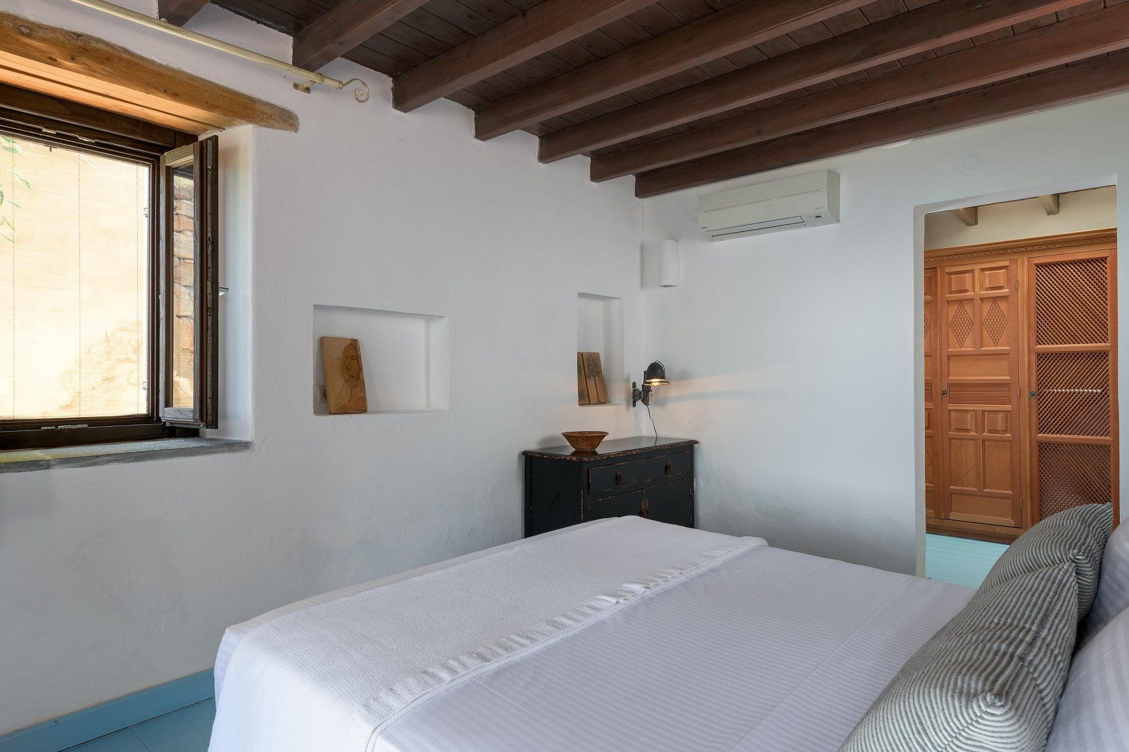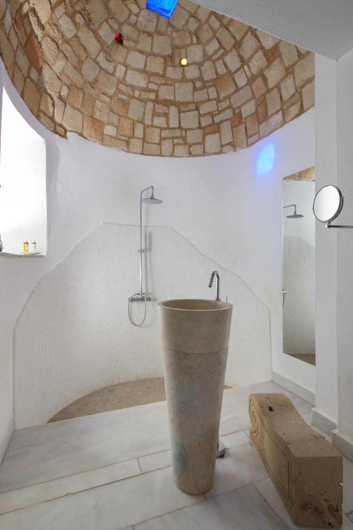 The villa’s interior combined contemporary minimalism and Dodecanese tradition with vibrant works of modern art adorning white stone walls. Each piece of furniture feels as though it’s been picked from an interior design magazine, with a Southeast Asian feel to hand-carved wardrobes and lacquered desks. Slate floors keep things cool underfoot and exposed stone archways and fireplaces are a nod to tradition.