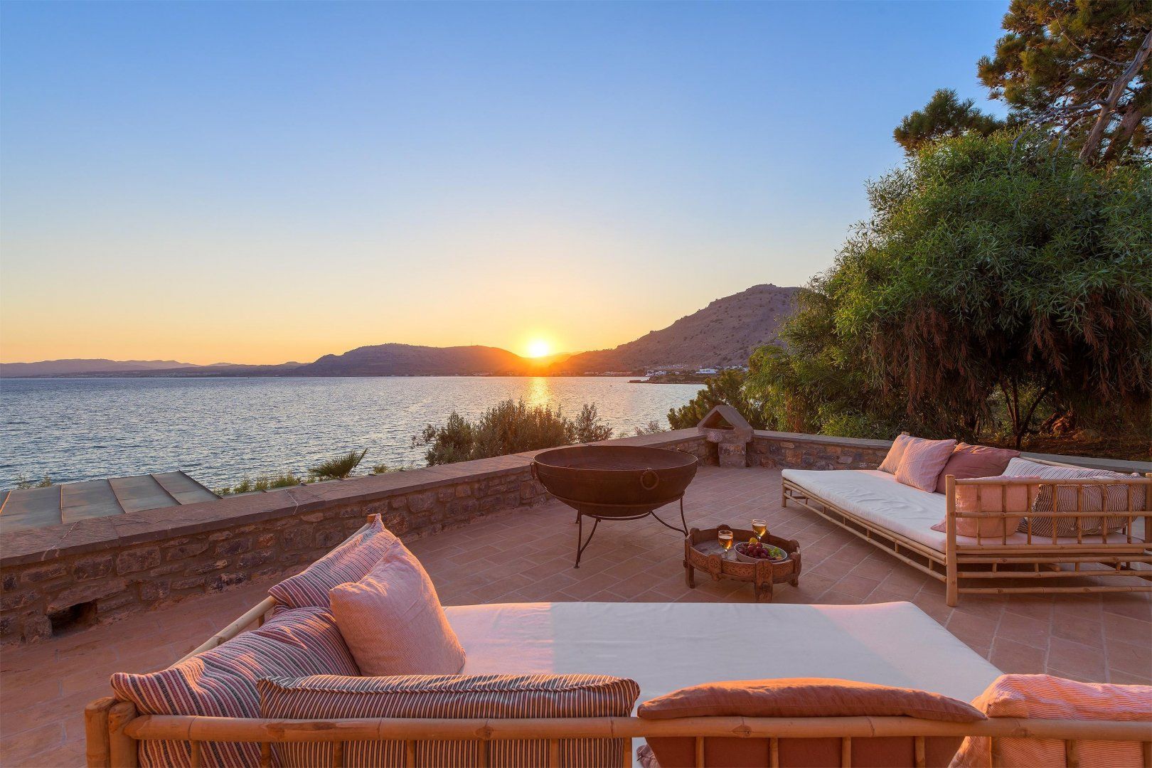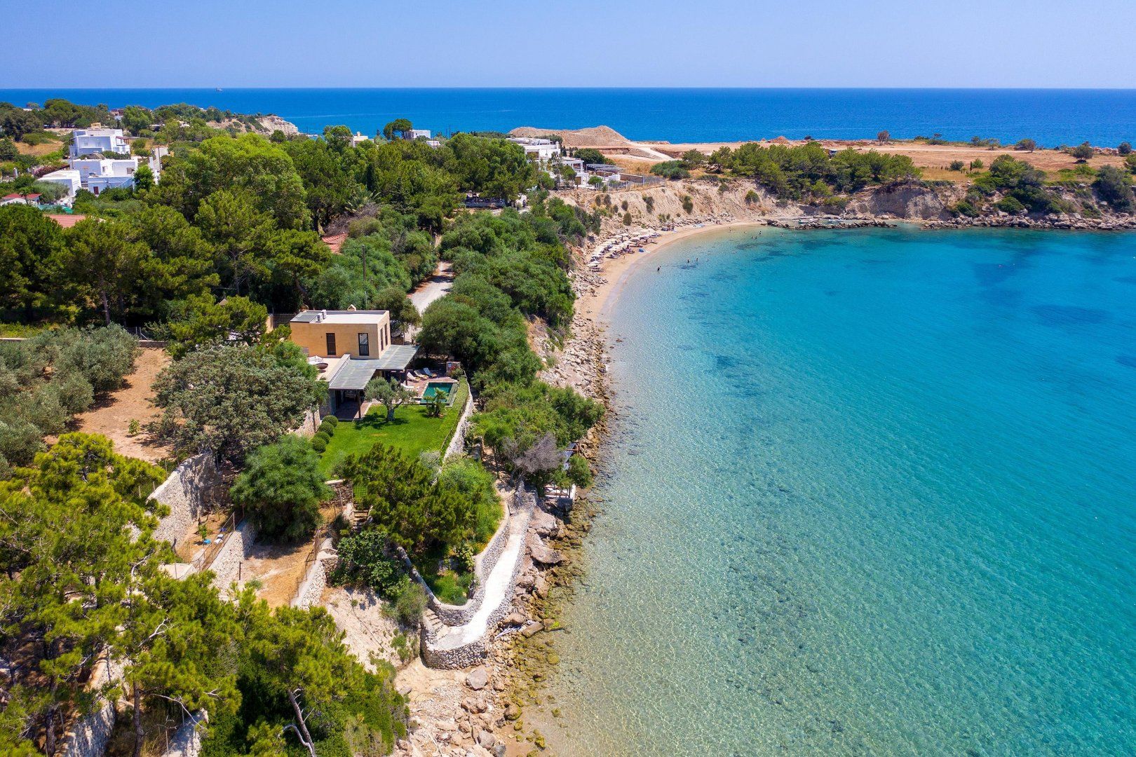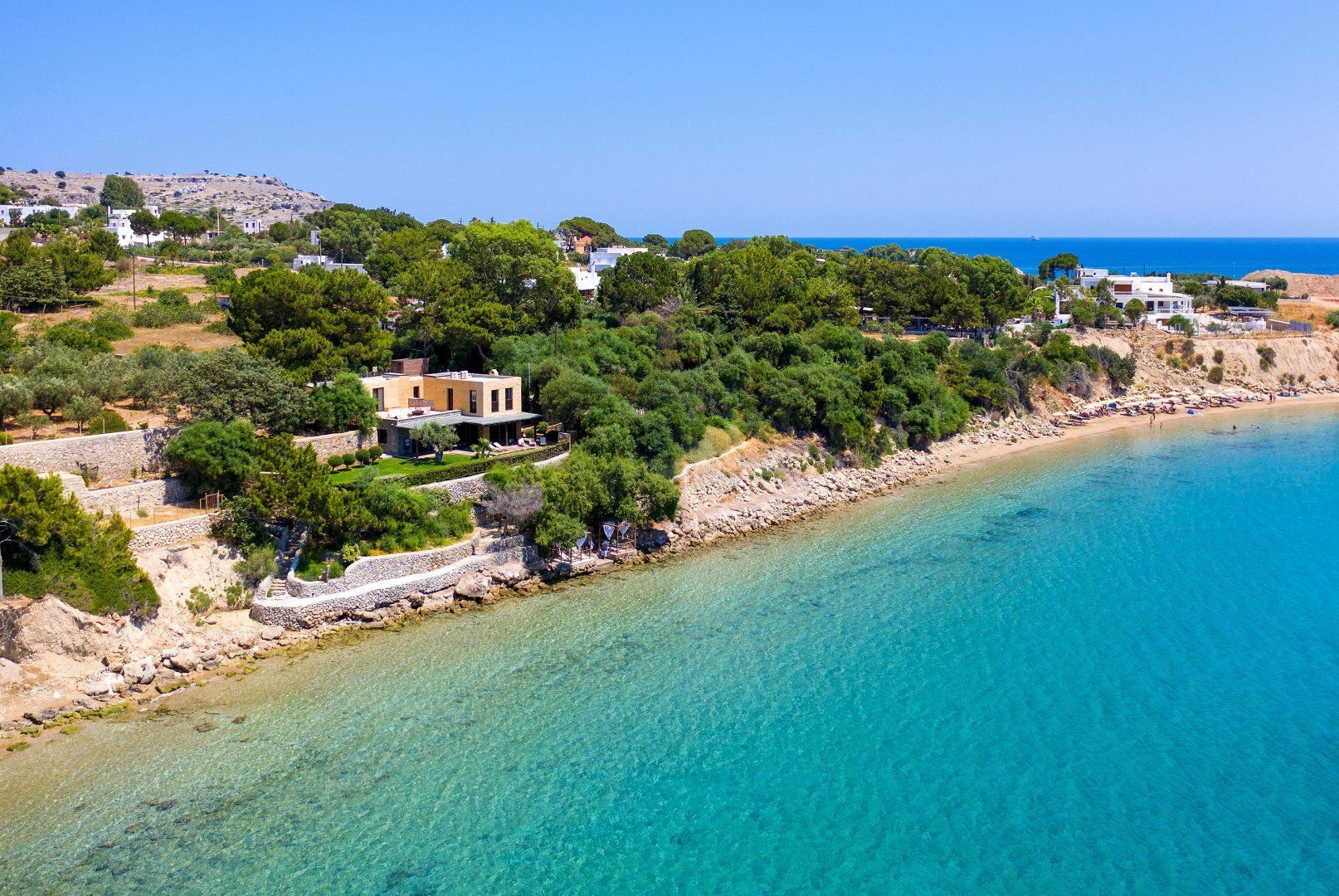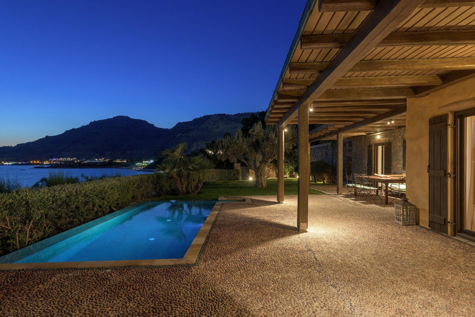 Sandwiched between the soft sand of Kavos and Pefki beaches, this oceanfront villa puts the crystal shallows of Rhodes’ southern shore approximately twenty paces from your swimming pool terrace. Heading barefoot down the private path, you’ll find two wooden decks right on the waterfront, furnished with loungers and swathed with white billowing curtains. A sheltered bay makes this the perfect swim spot. Watch boats cut across the crystal-clear sea from here, or up on the first-floor terrace where a fire pit makes for the perfect accompaniment to a stunning island sunset. As well as a swimming pool, the main terrace has a manicured lawn with an ancient olive tree at its centre and dining for the whole group on the shaded patio.