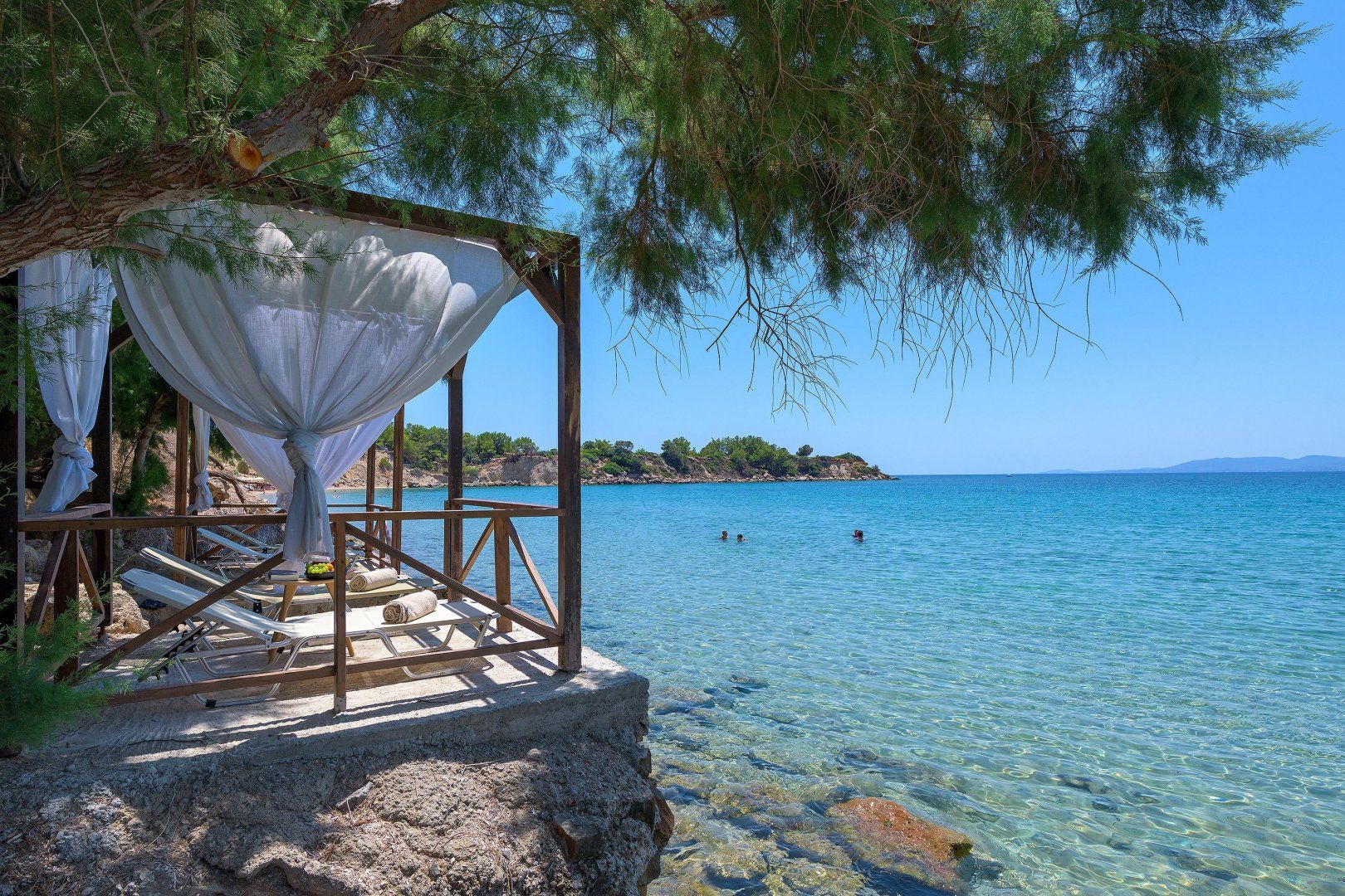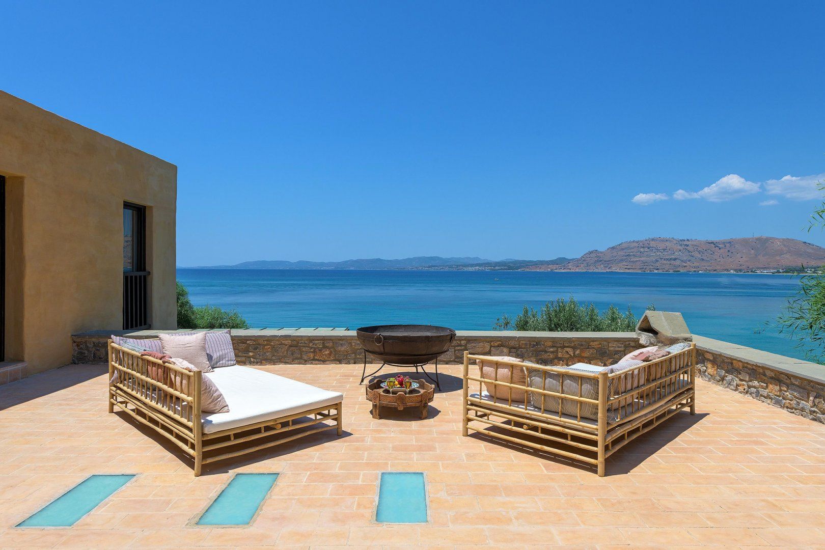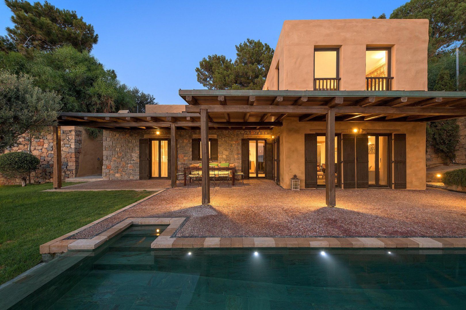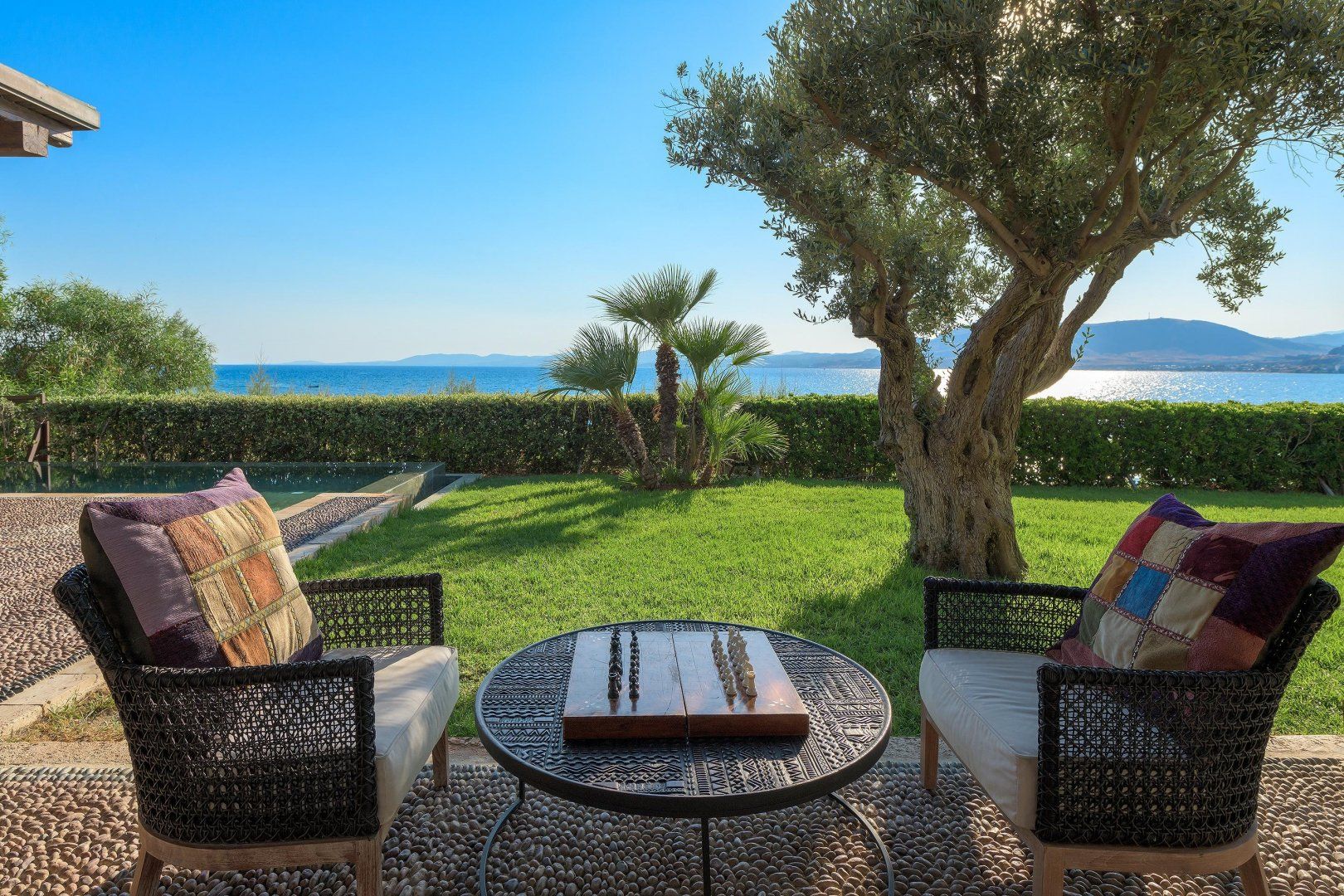 Sandwiched between the soft sand of Kavos and Pefki beaches, this oceanfront villa puts the crystal shallows of Rhodes’ southern shore approximately twenty paces from your swimming pool terrace. Heading barefoot down the private path, you’ll find two wooden decks right on the waterfront, furnished with loungers and swathed with white billowing curtains. A sheltered bay makes this the perfect swim spot. Watch boats cut across the crystal-clear sea from here, or up on the first-floor terrace where a fire pit makes for the perfect accompaniment to a stunning island sunset. As well as a swimming pool, the main terrace has a manicured lawn with an ancient olive tree at its centre and dining for the whole group on the shaded patio.