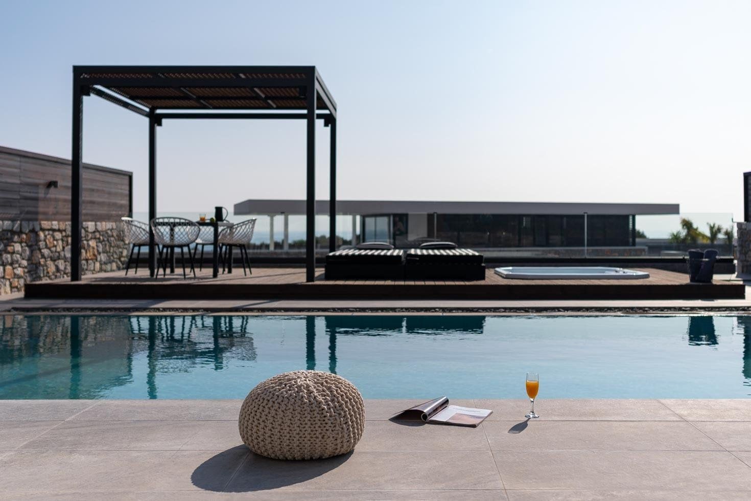 n the southern coast of Rhodes, near the peaceful village of Lachania, this modern villa is thoughtfully designed and stylishly executed. A sultry living room with dark tiled walls is the perfect place to spend cooler evenings, where you can browse on the iPad, fire up the bluetooth speaker, or play on the PS4. The bright, modern kitchen is well-equipped for making everything from quick breakfasts to family dinners. All three bedrooms have comfy king size beds and TVs, and the top floor bedroom leads out onto a peaceful balcony. There are two decadent design-led bathrooms with statement light fixtures and a large walk in shower.