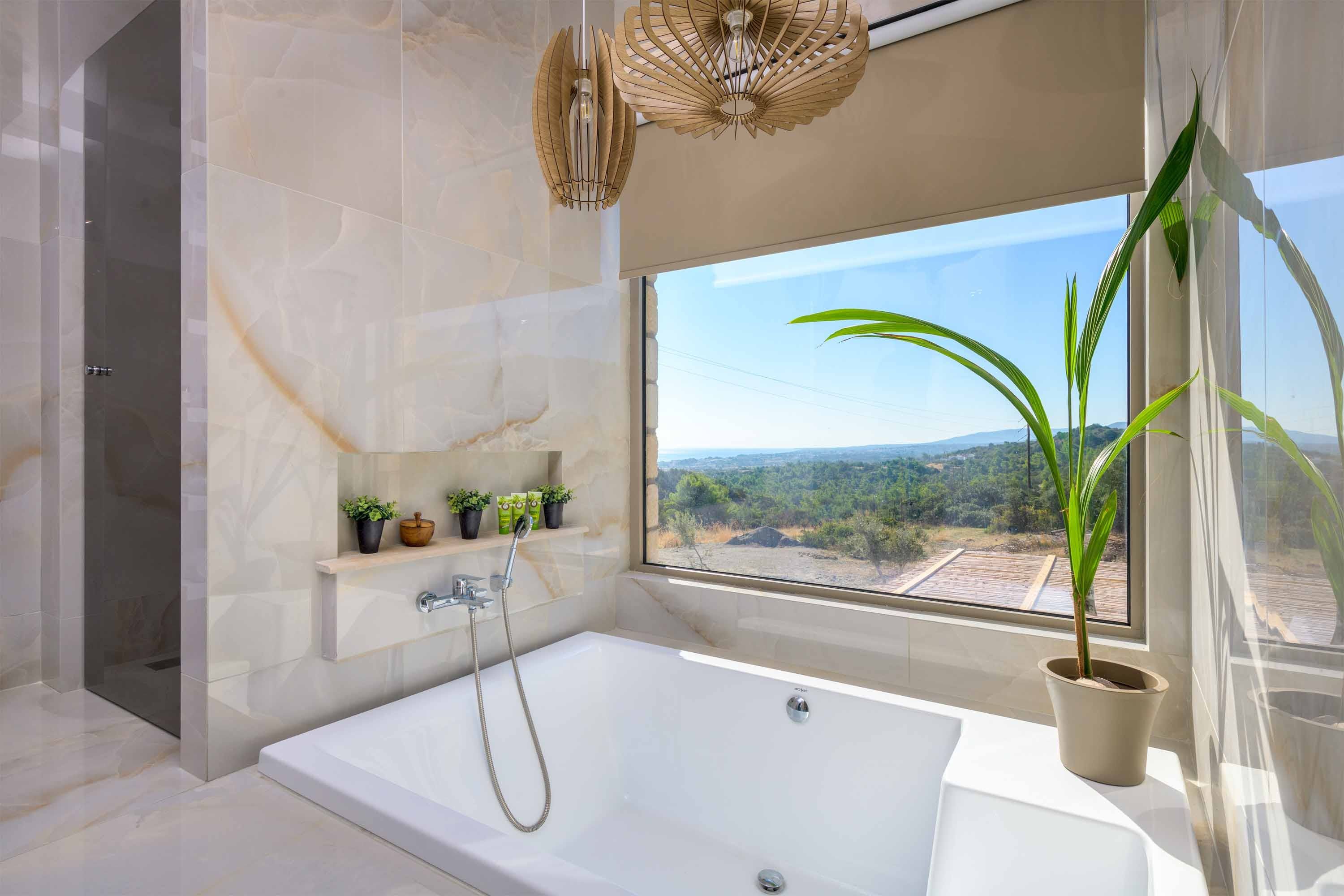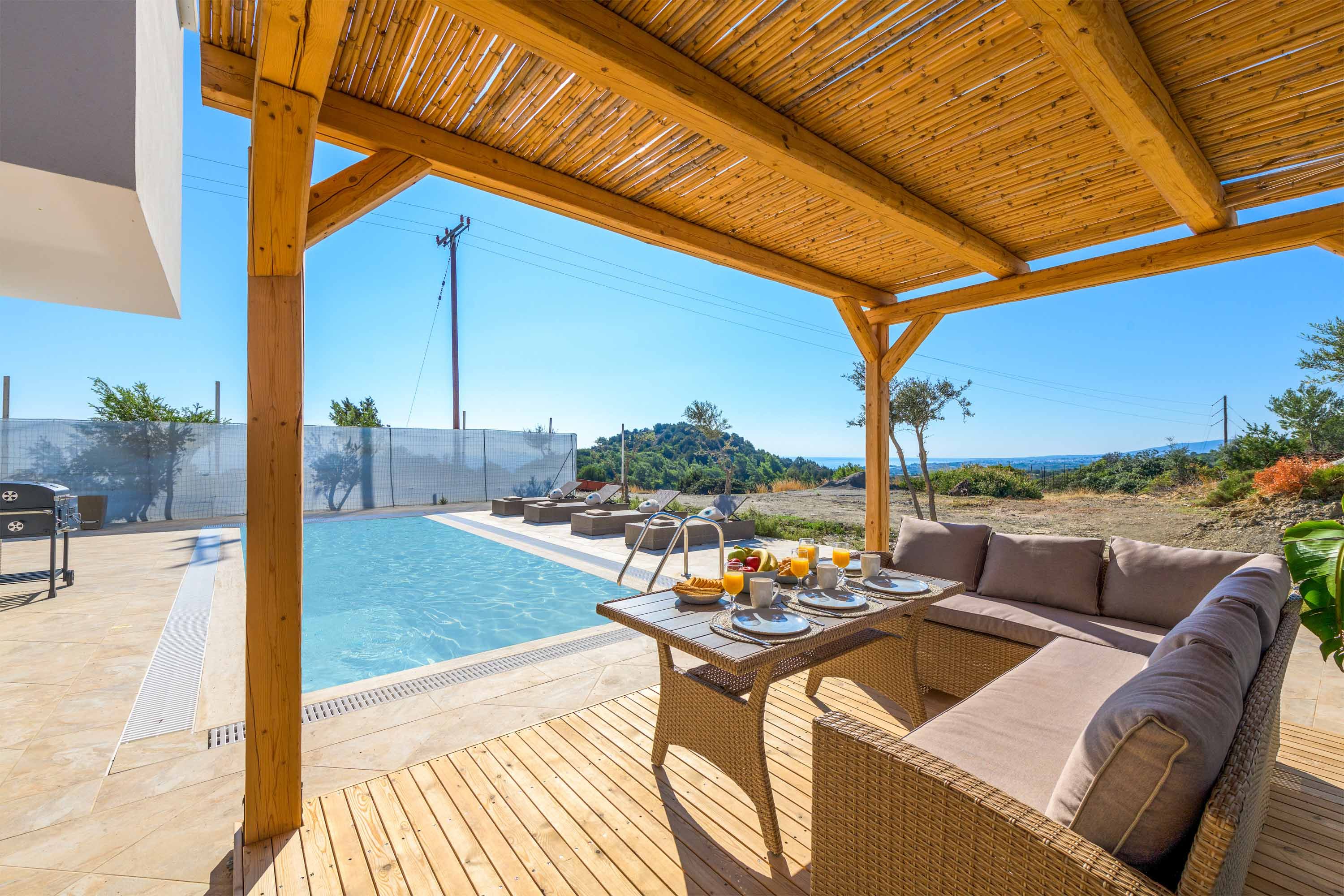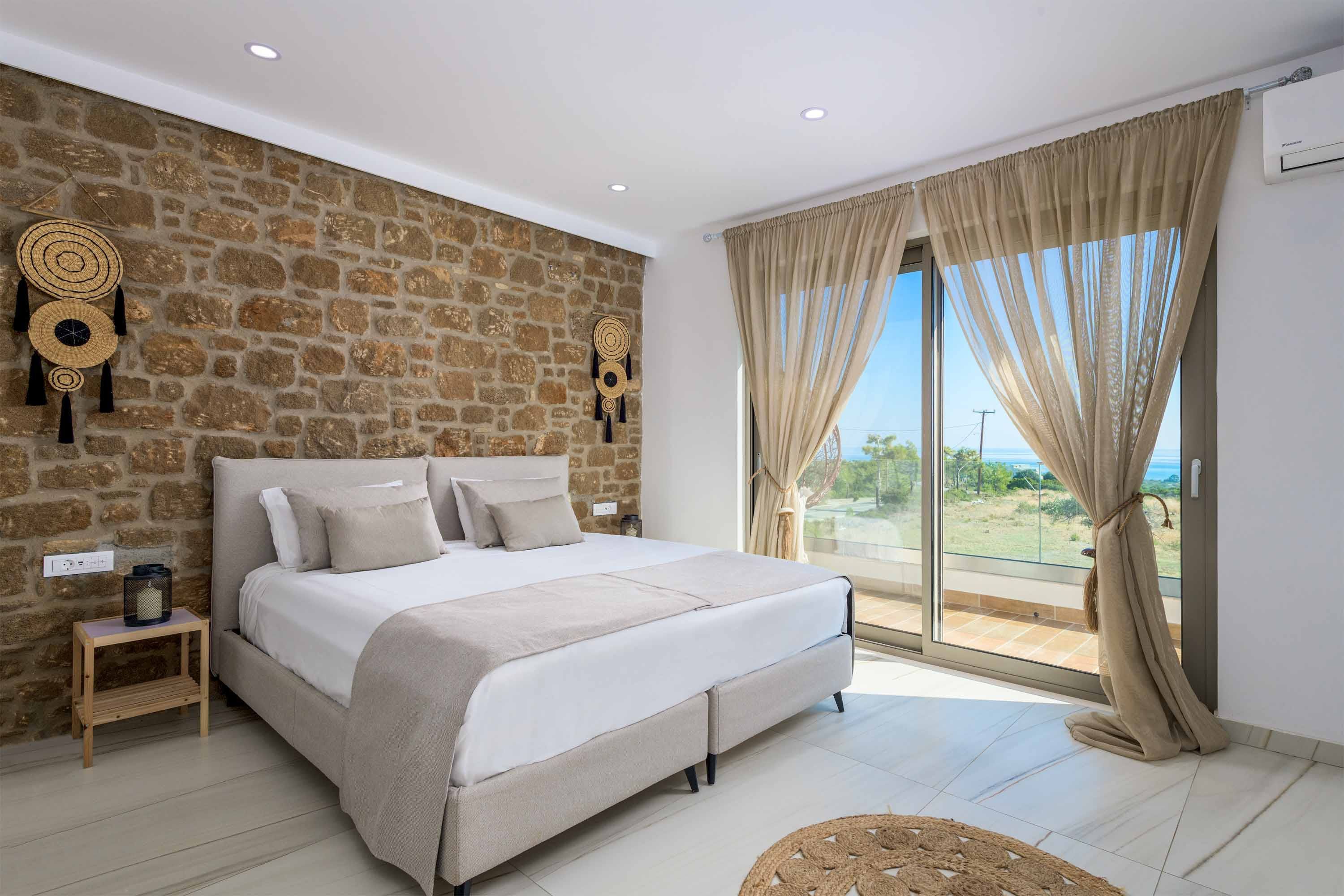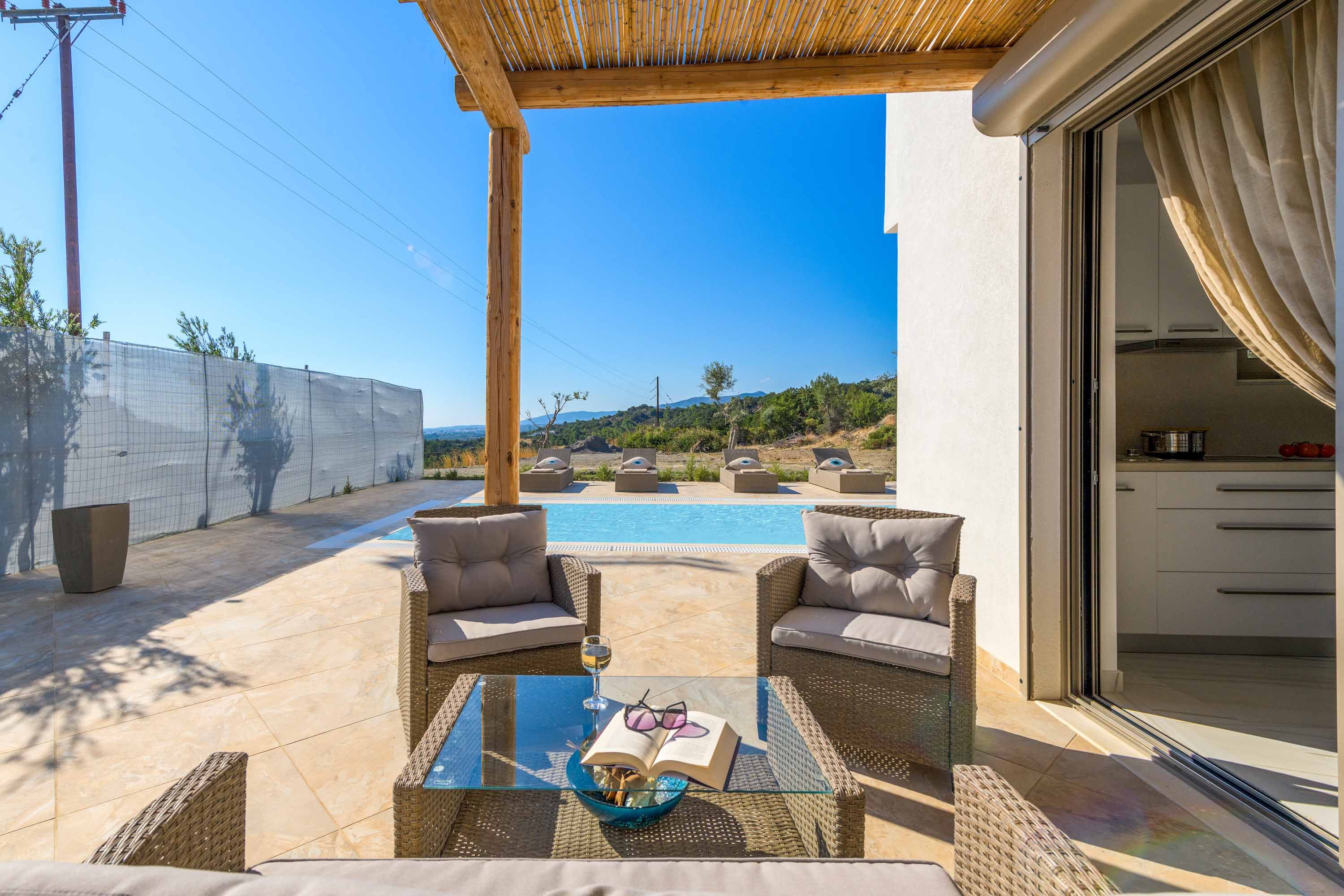 Nestled on a hillside above the beautiful coastline that runs between Lardos and Gennadi, this stylish villa offers spectacular ocean and countryside views. Surrounded by traditional villages and pretty beaches, you can have an authentic Rhodes experience – we highly recommend making the very short drive to the golden sands of Kiotari. There’s a study here if you’re staying for a while and need to work remotely, which also contains a single sofa bed which would be ideal for a child. The garden is the heart of this home, featuring a private pool, portable barbecue and sun loungers for relaxing in the sun.