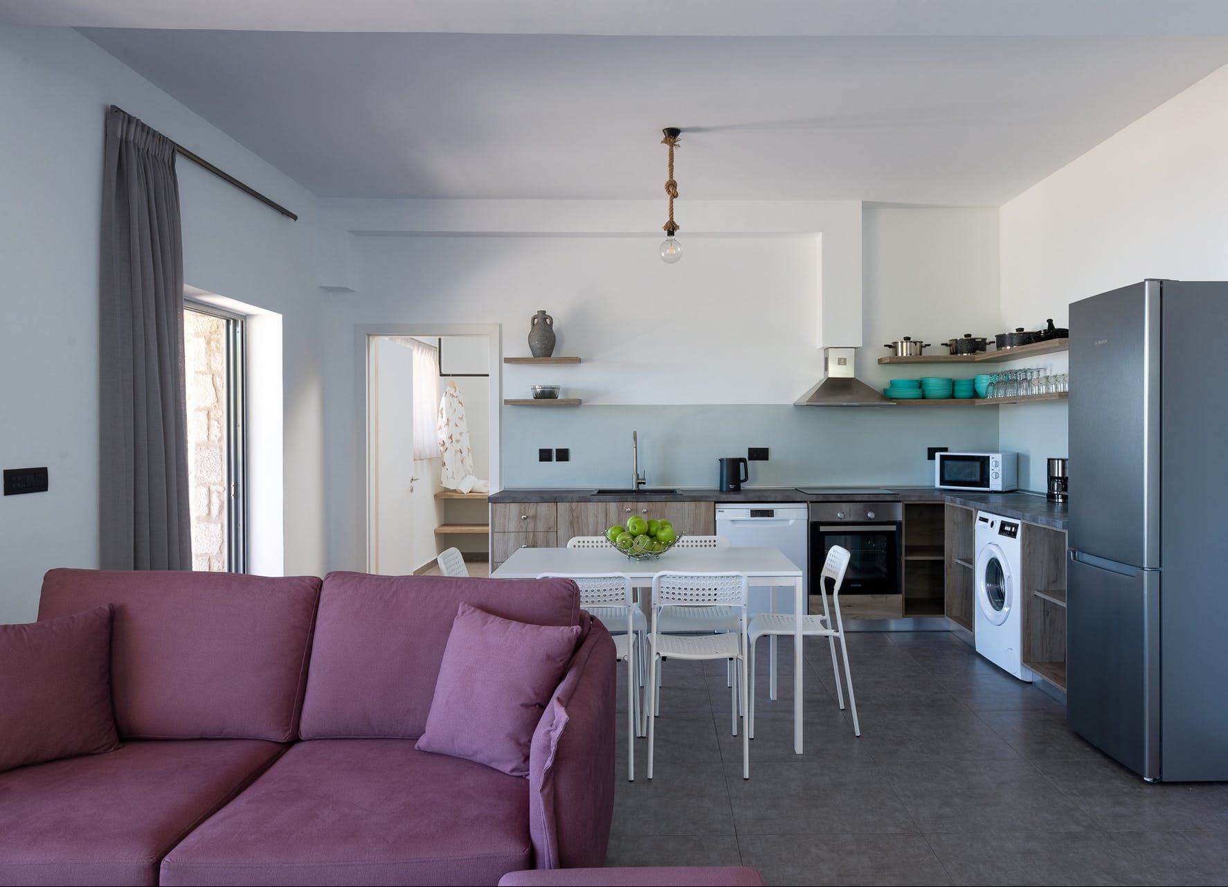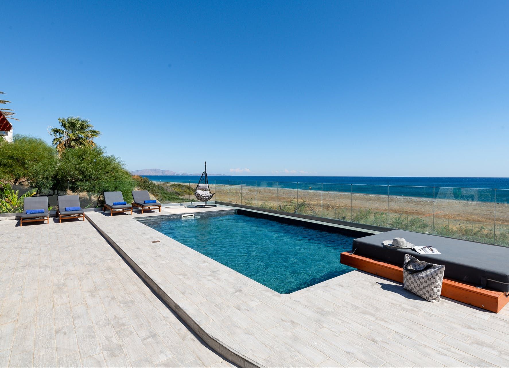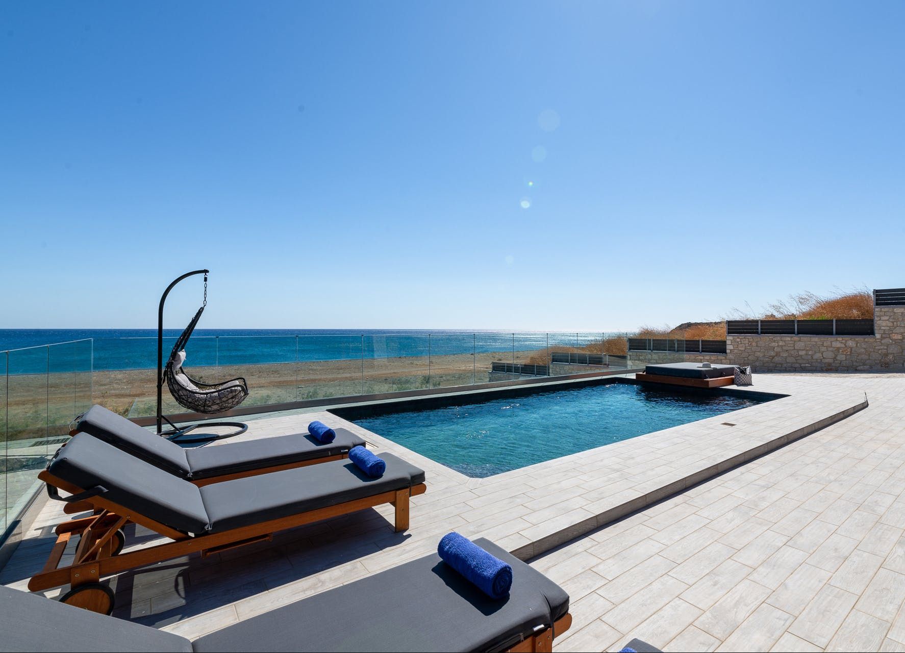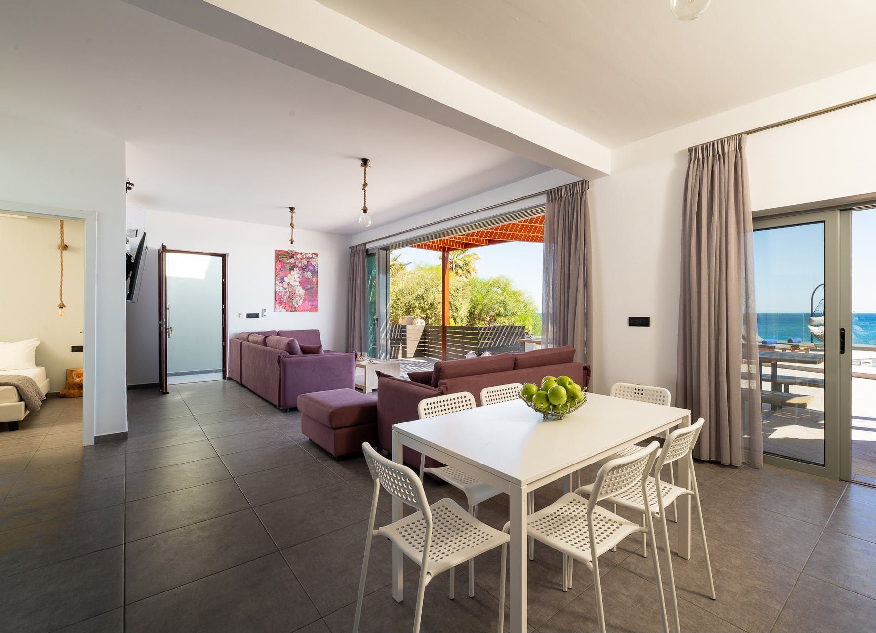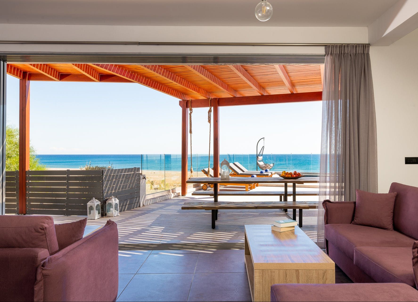 Looking out at the Mediterranean sea from the terrace of this enchanting villa is just what you need to start making memories that will last a lifetime. This home is a short stroll from Lachania beach, where you can listen to the sounds of the waves crashing against the shore as you sip your morning coffee by the pool or work on that perfect holiday tan on the sun loungers. Even if you're inside getting some last-minute work done remotely or whipping up something tasty in the well-equipped kitchen, just slide open the expansive glass doorway and open up almost the entire side of the house to let the sunshine and sounds of the sea in.