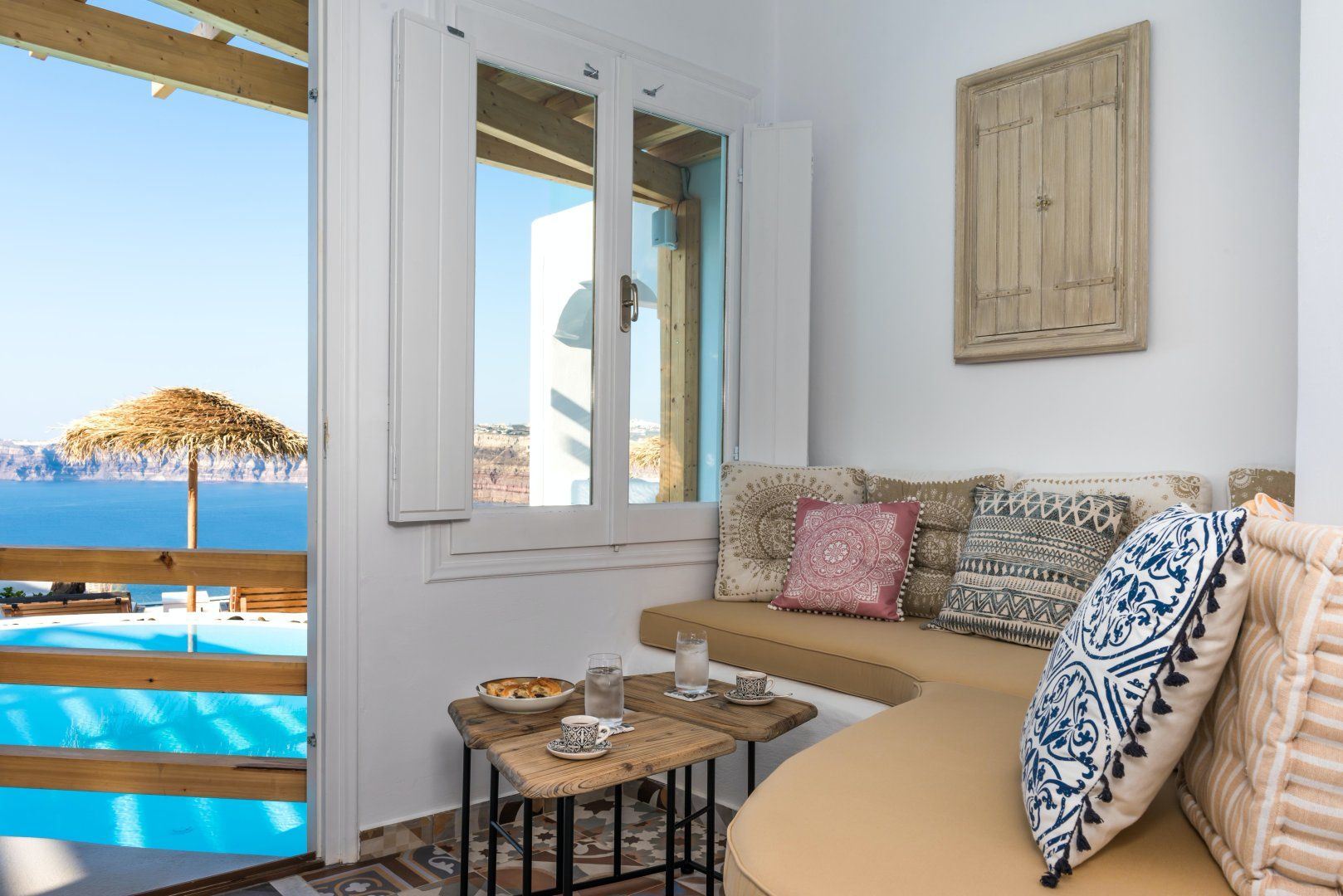 Slip into the Santorini state of mind at this peaceful villa with expansive ocean views. The traditional white-washed home is cool, calm and considered, rich in Cycladic curves that contribute to the restful island ambience.