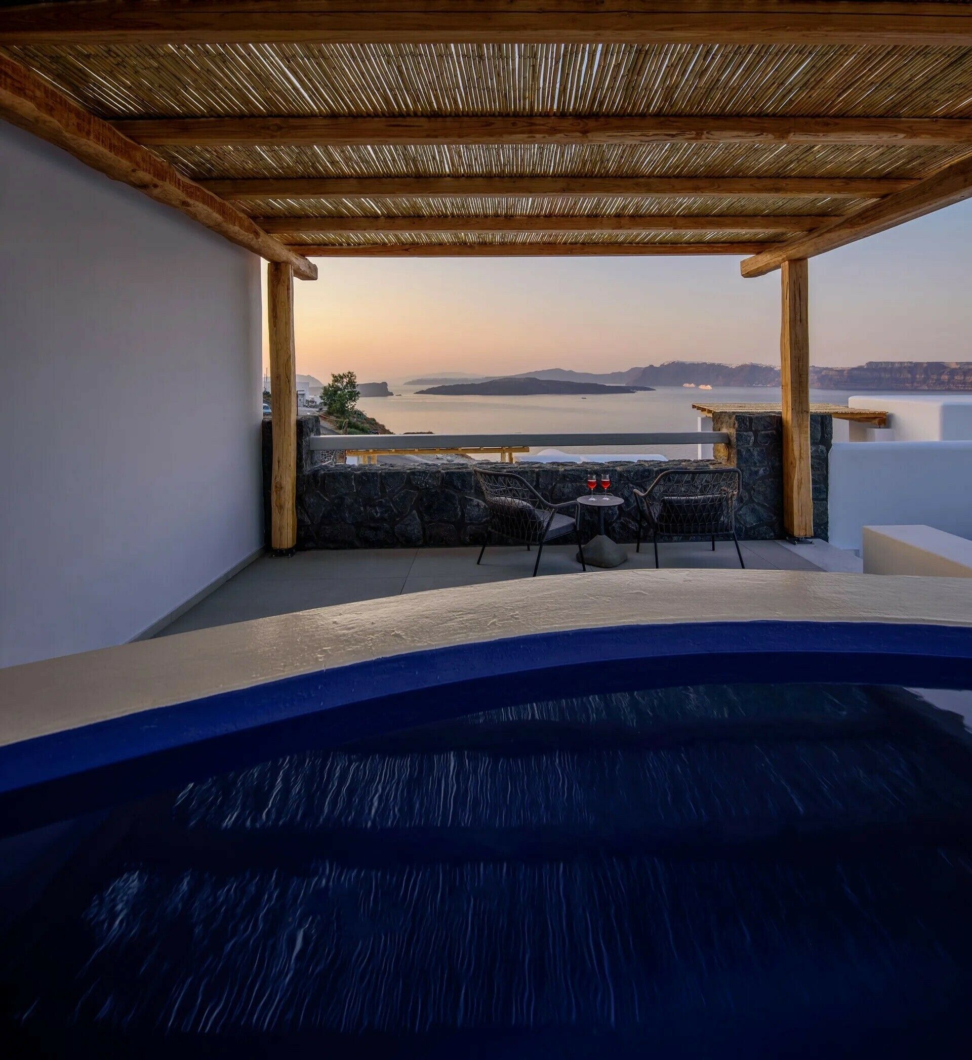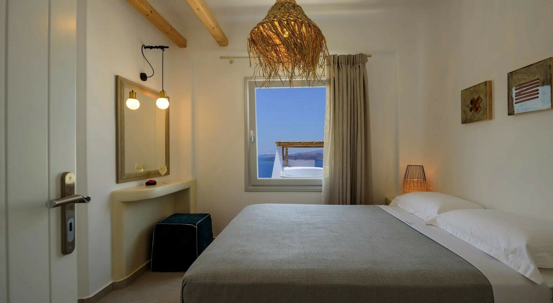 The views of the Akrotiri Caldera from this Santorini home are incredible. You can enjoy them from the terrace and small pool with its waterfall, and from the balcony with its Jacuzzi. Another highlight is the complimentary homemade Mediterranean breakfast, served next to the pool or at the dining table in the open-plan living space. Location-wise, this villa is a short stroll from the sleepy village of Akrotiri and in walking distance of Caldera beach. Or visit Fira, the island's main town, which is just over 10 kilometres away.