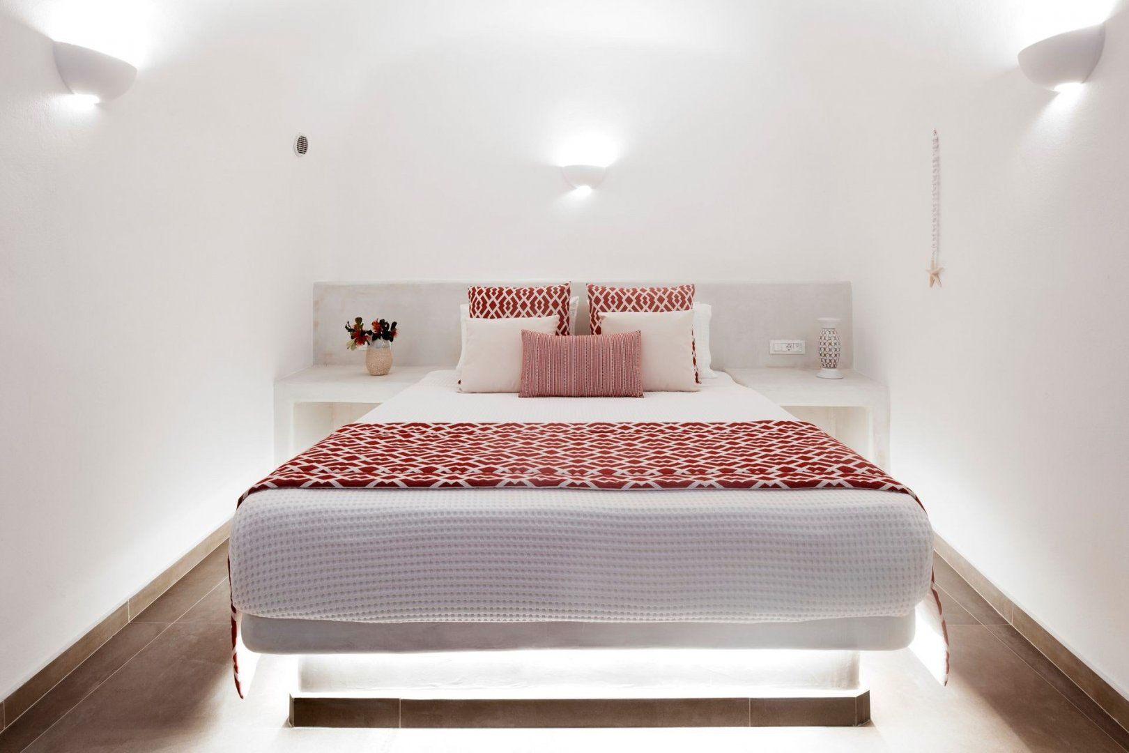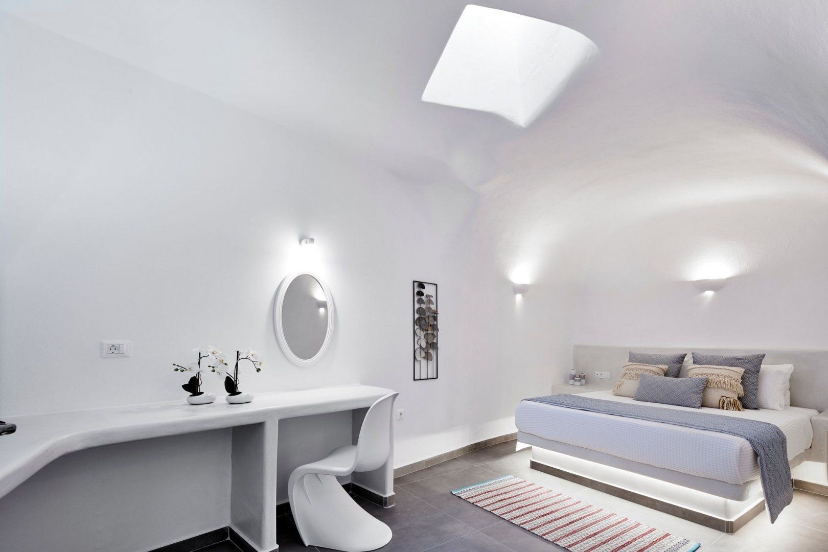 Cave-like rooms inside are a nod to the island’s tradition, and thick walls keep things naturally cool. The vaulted living room is a refreshingly crisp white and its wall of windows is reminiscent of Santorini’s famous ancient churches. If you’re looking for a luxury spot that embraces Santorini’s ancient architecture, this is the place for you.