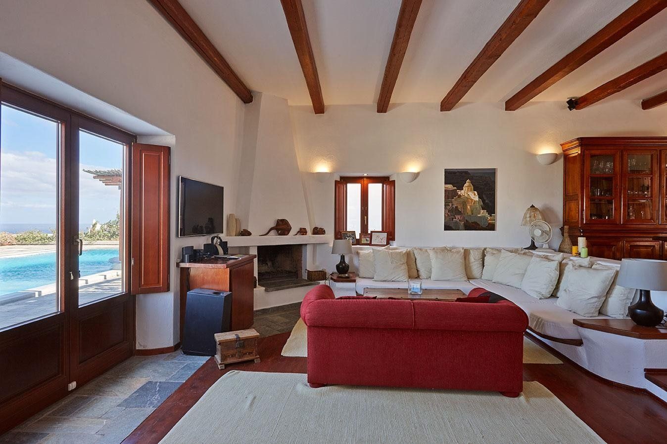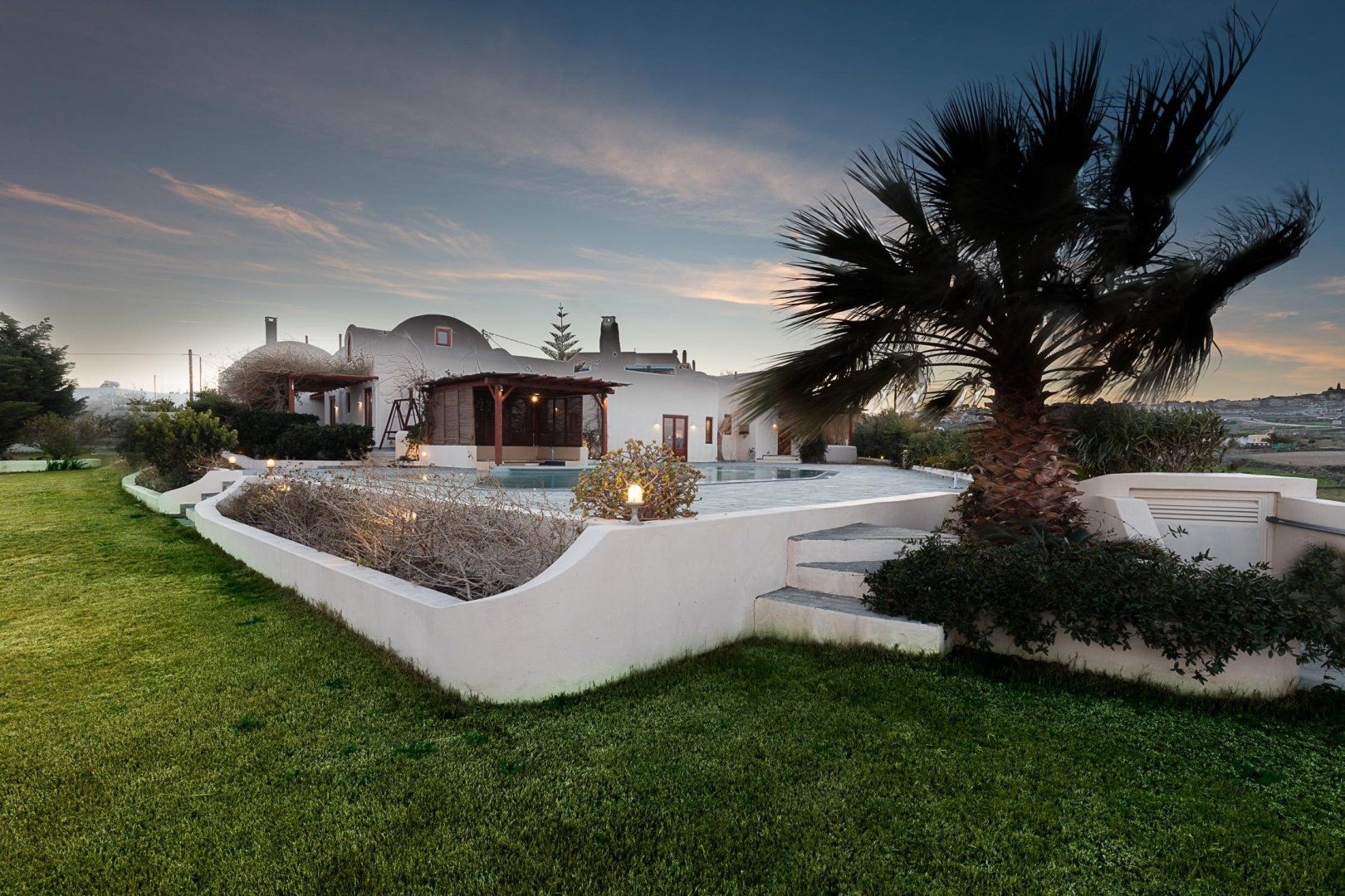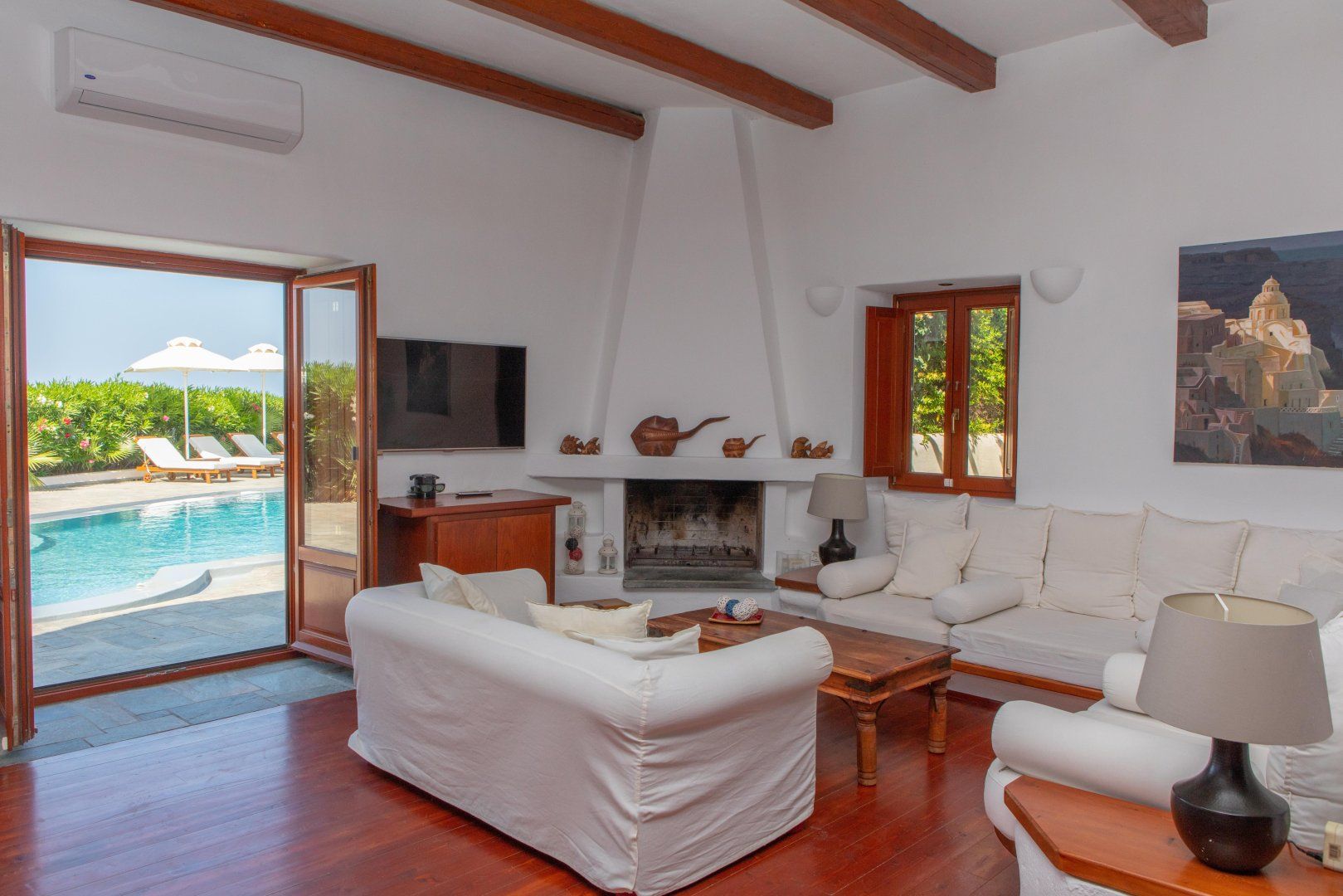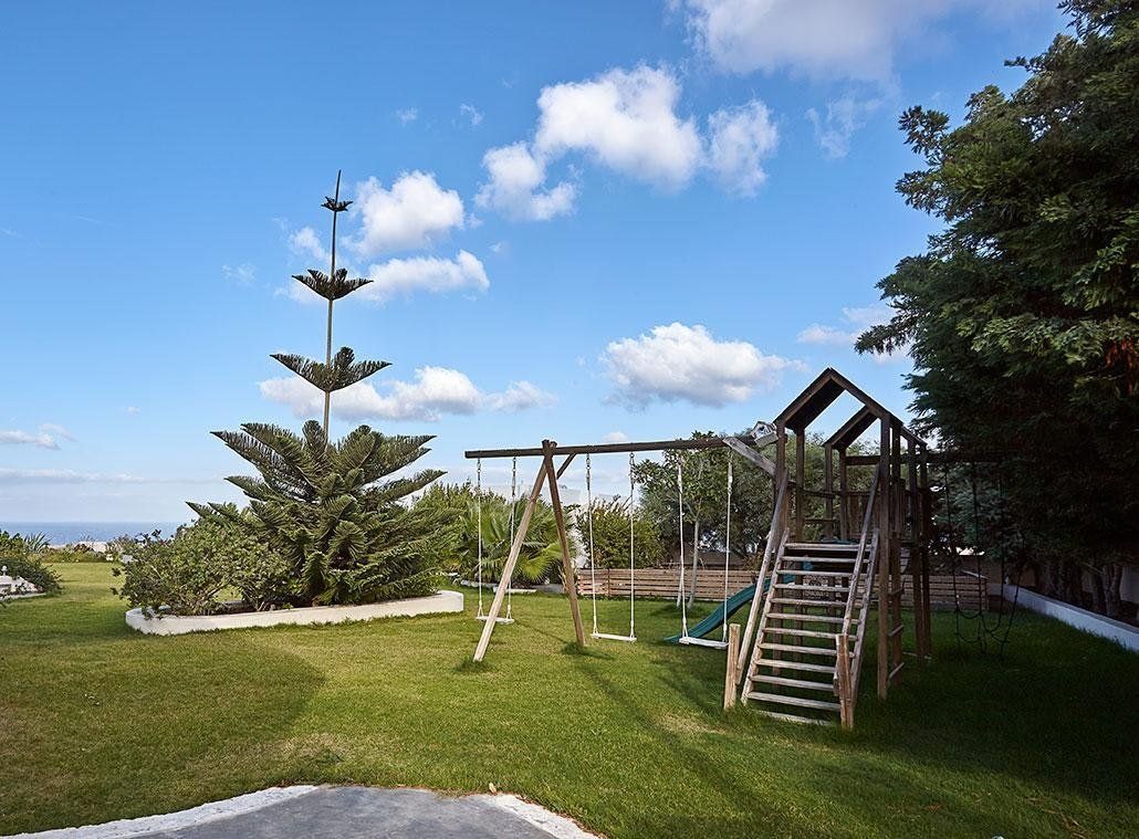 When it comes to settings for a party, there can't be many that are better than this. Starting with the exterior, there's a large freshwater swimming pool surrounded by loungers and covered terraces, which all enjoy a gorgeous view of a Cycladic hillside. Moving around the side of the address, guests also get the run of a massive lawn with children's play equipment on it.
