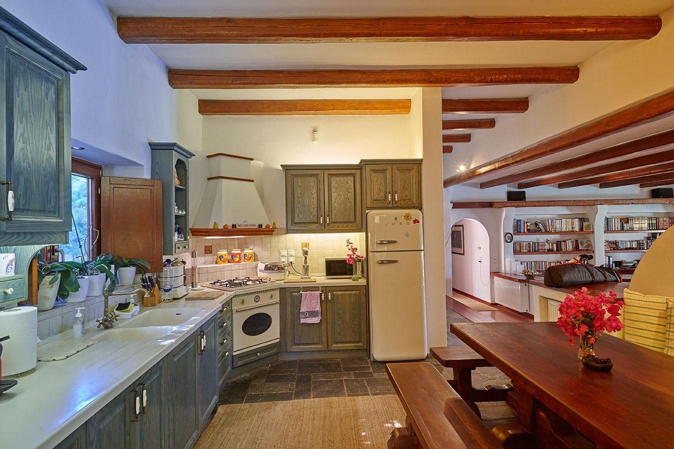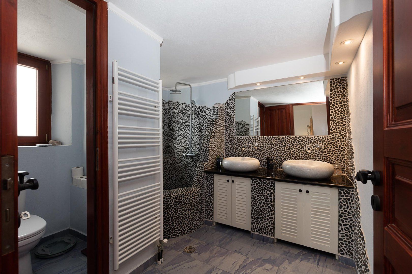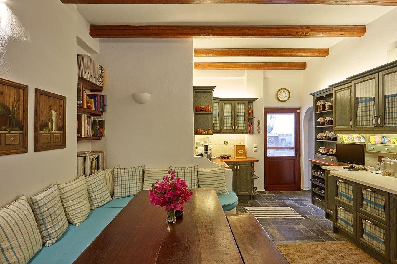 Inside, the home has been appointed in traditional Santorinian style, with cooling white walls, wooden ceiling beams and bare floorboards. Oddly enough, the only rooms that veer away from this script are the bathrooms, which all have been treated to a quirky range of tiling.