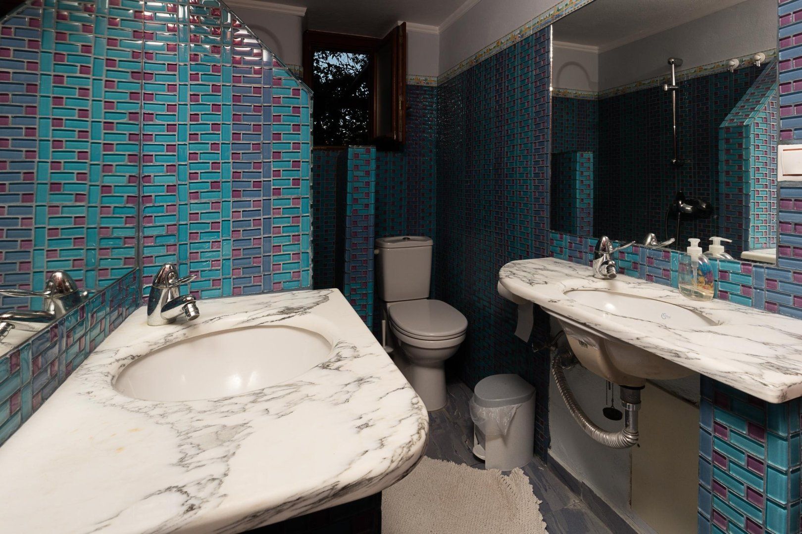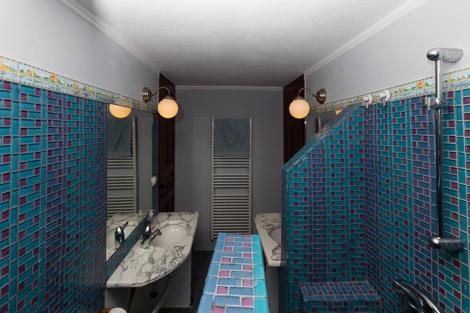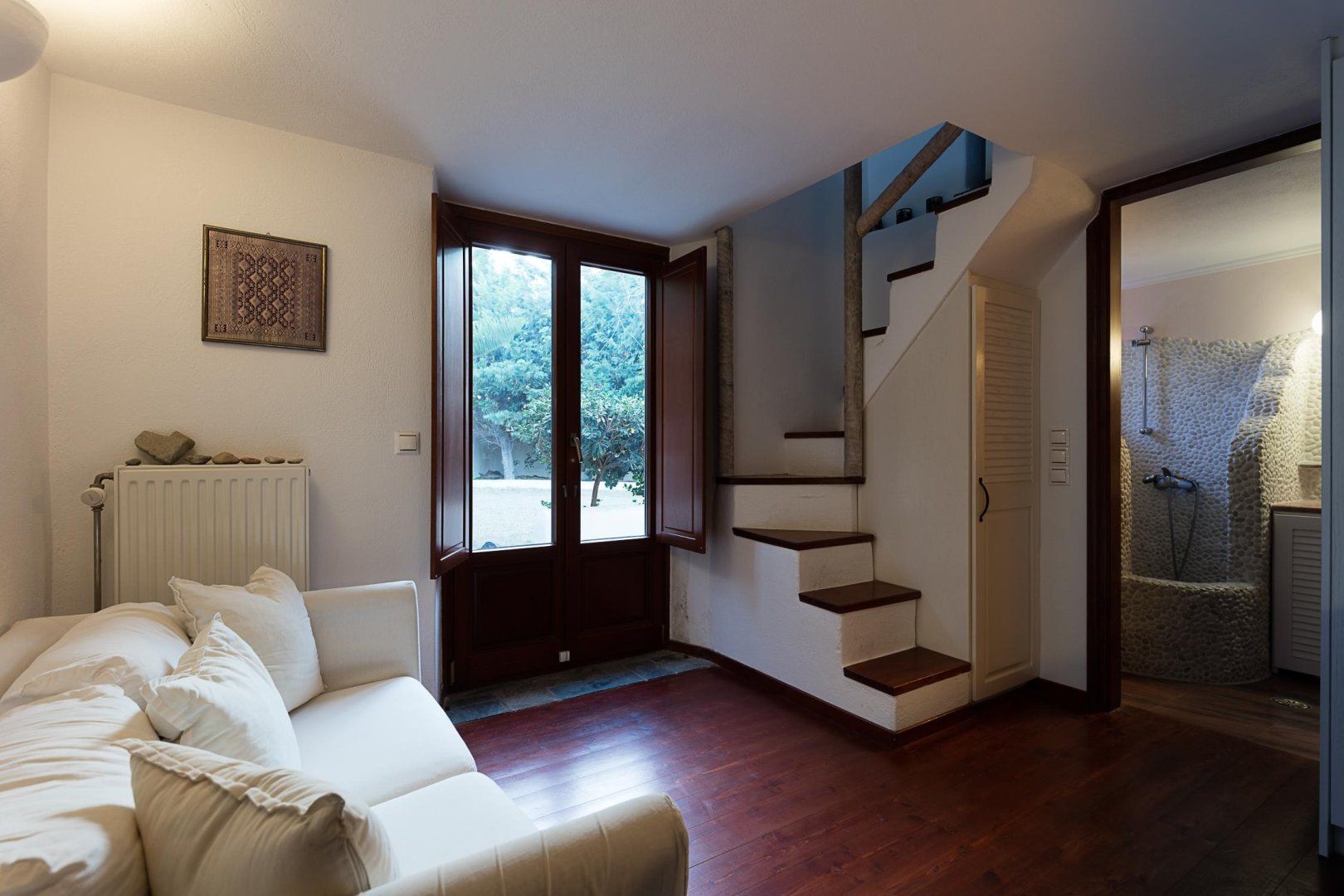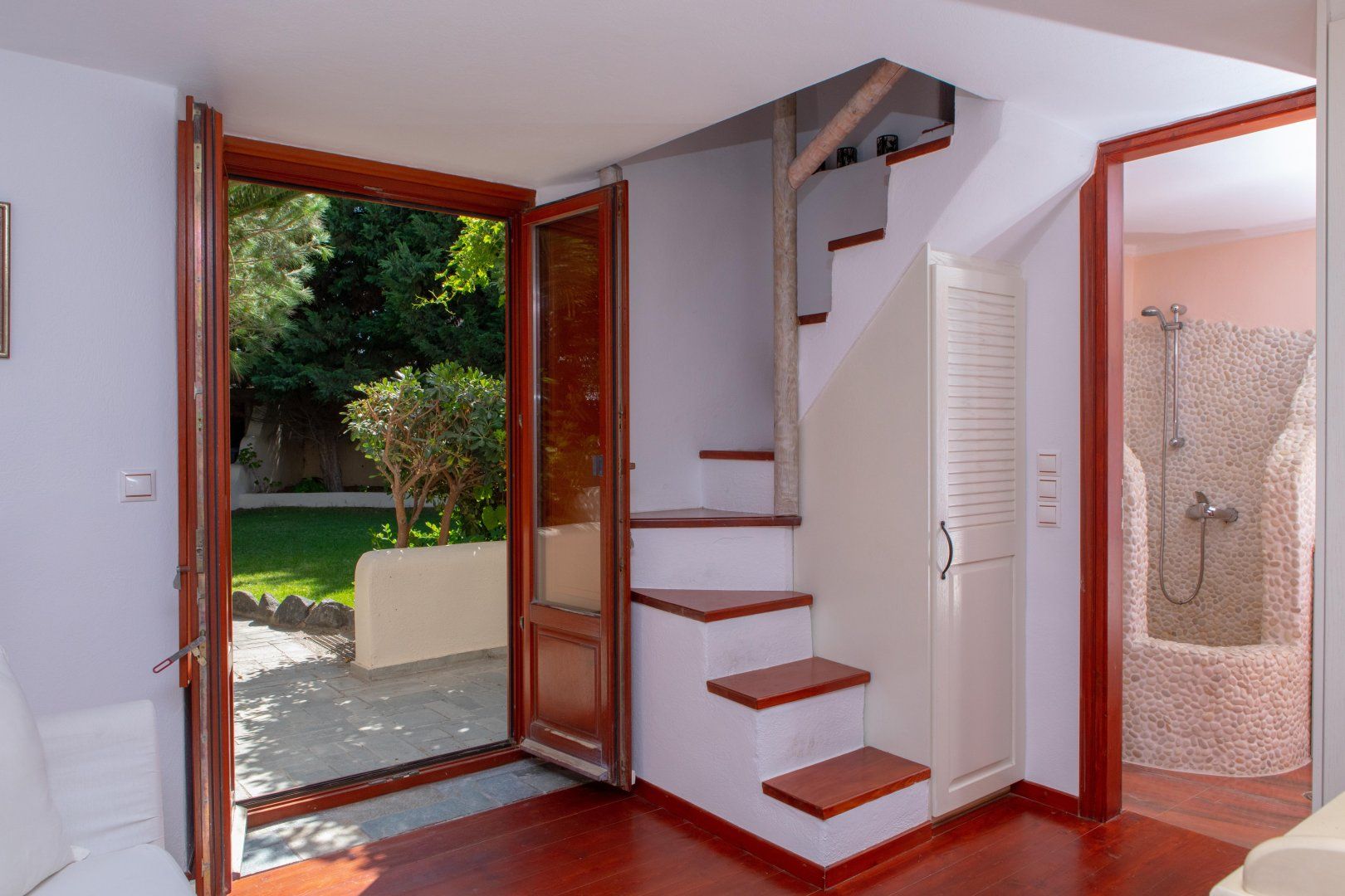 Inside, the home has been appointed in traditional Santorinian style, with cooling white walls, wooden ceiling beams and bare floorboards. Oddly enough, the only rooms that veer away from this script are the bathrooms, which all have been treated to a quirky range of tiling.