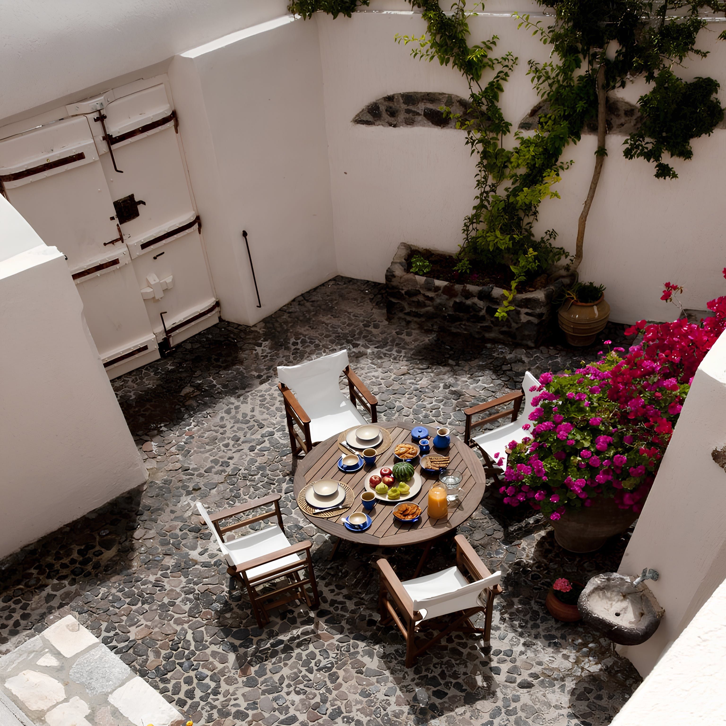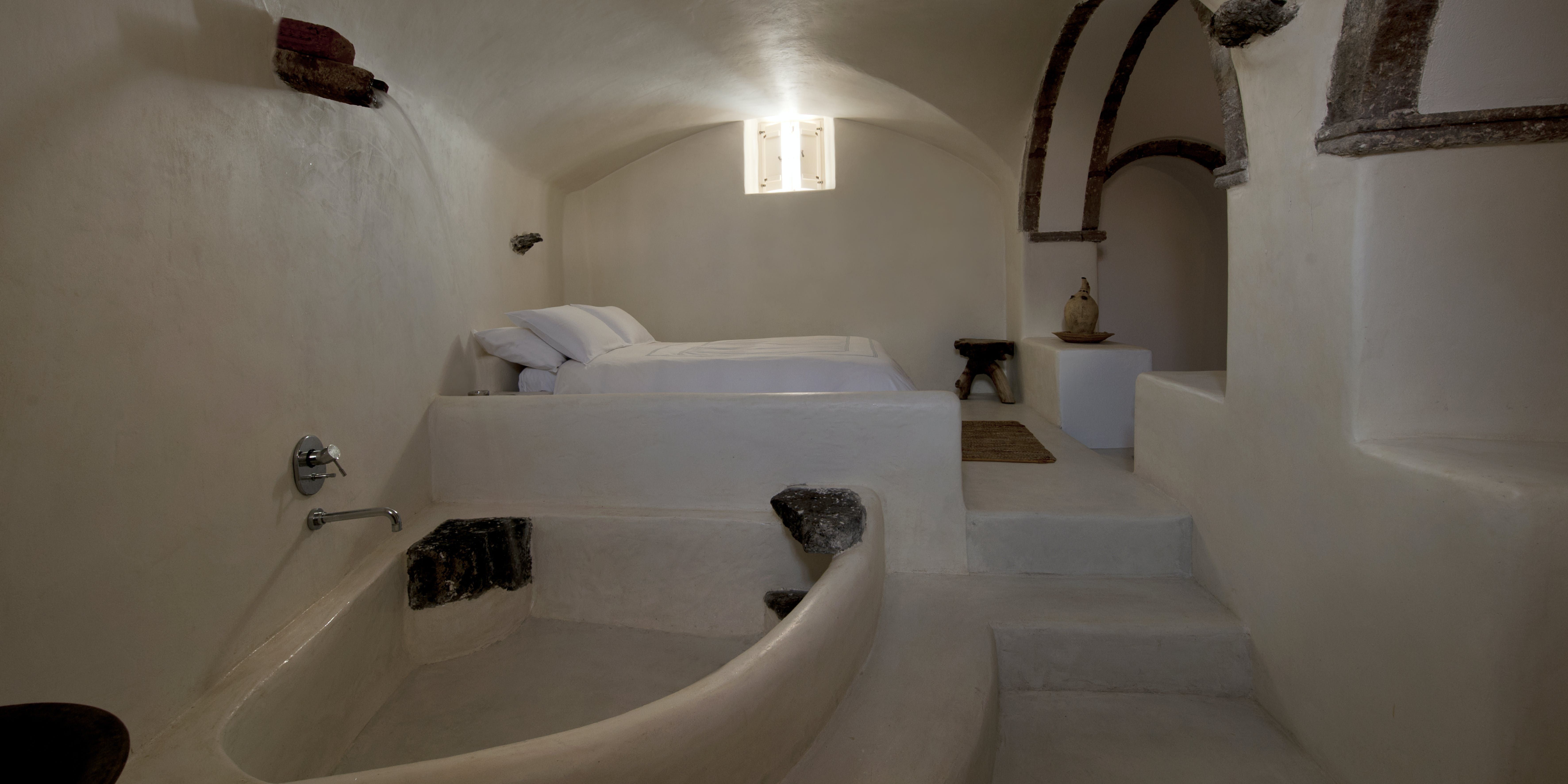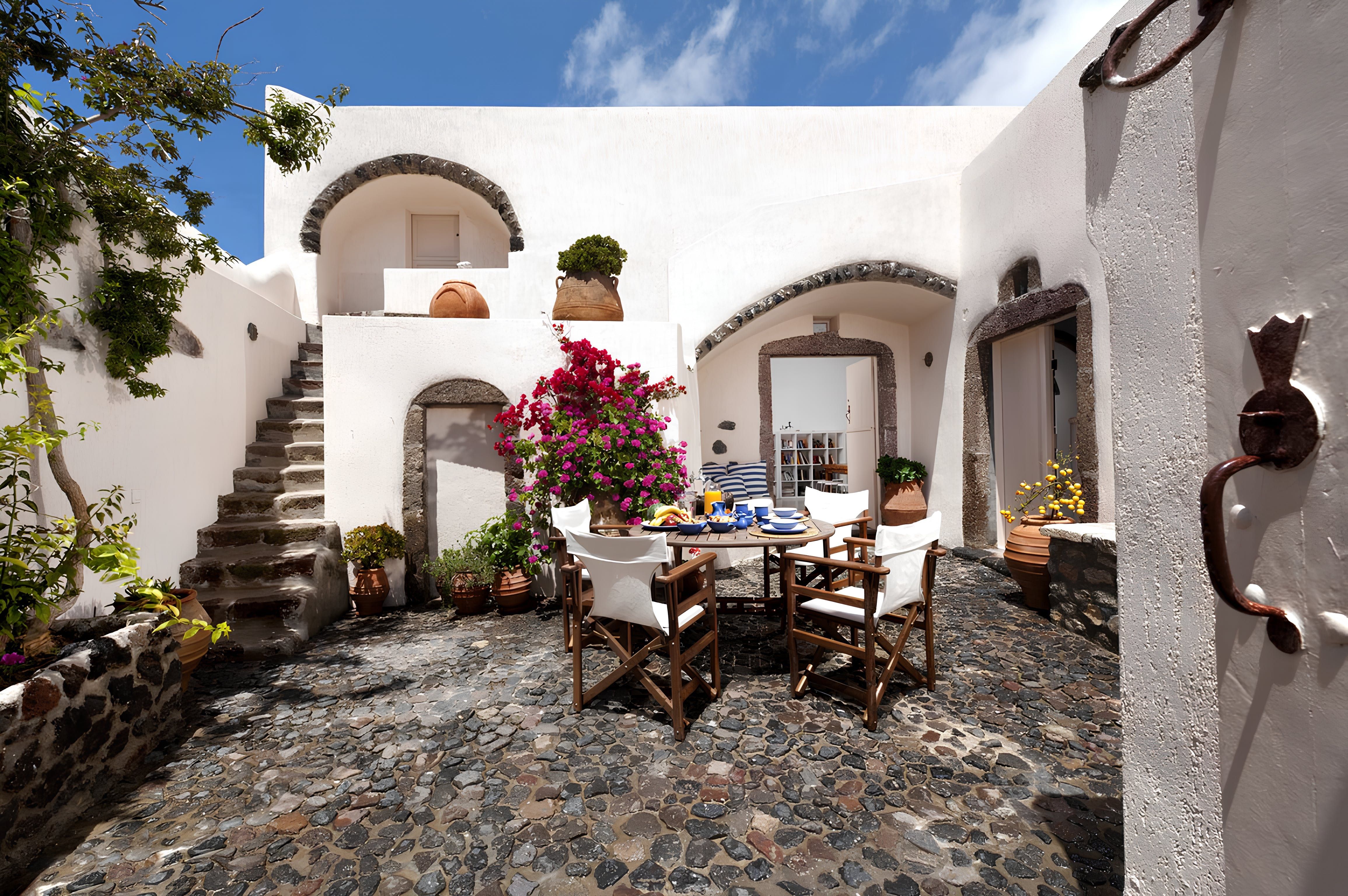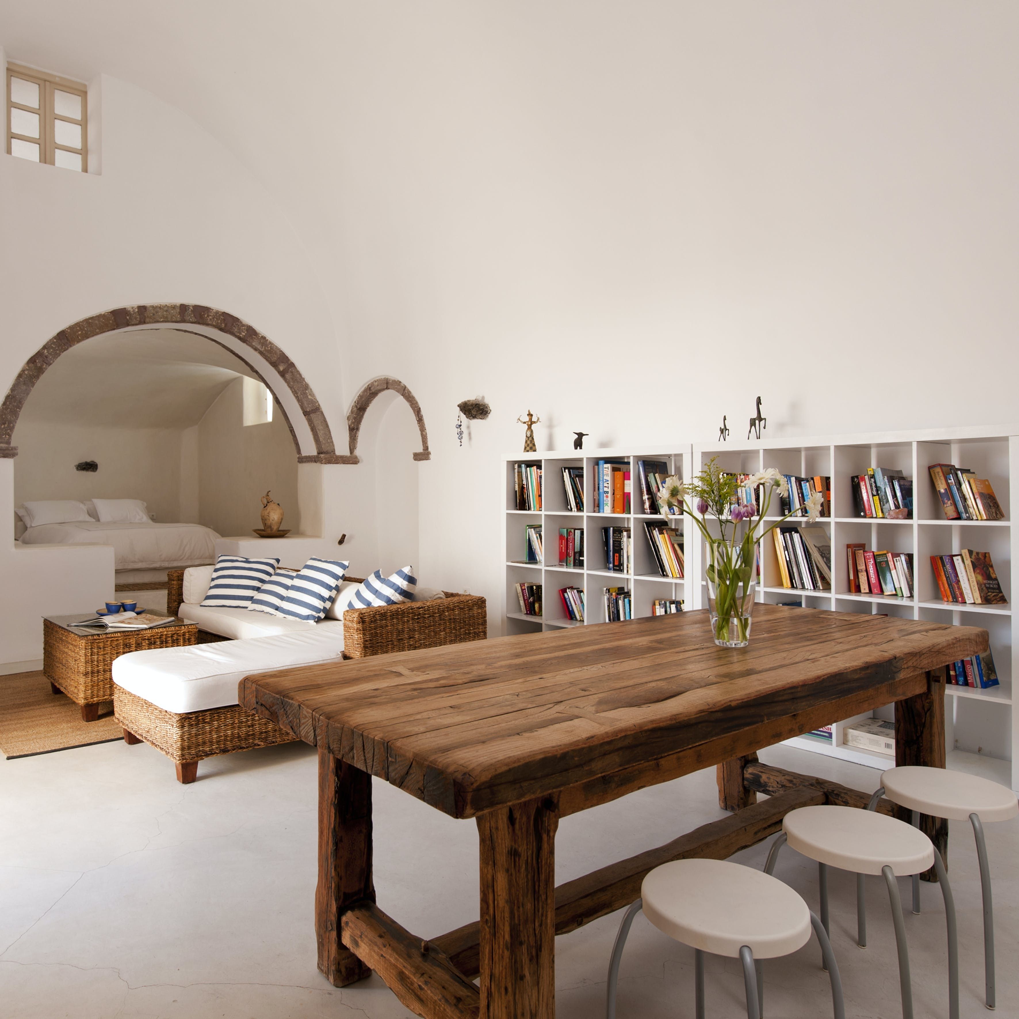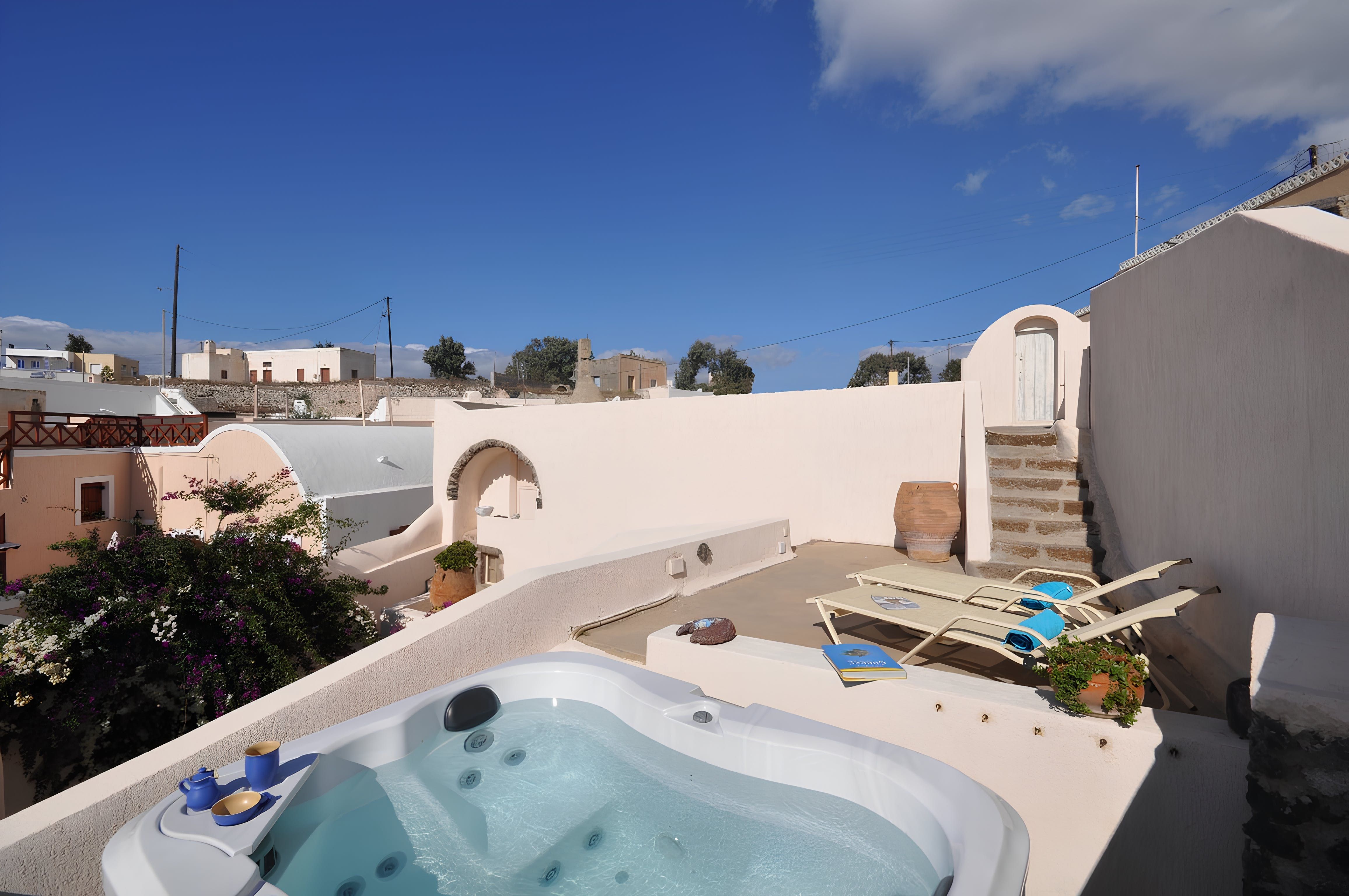 Soak up the Aegean rays from this 18th-century cave house on Santorini’s west coast. You’ll need to climb the hill to reach this home, but once you’re up, you’ll find a pretty courtyard, a rooftop complete with a hot tub and loungers and a charming interior. This home is best suited to a family or comfortable group who don’t mind a lack of privacy – the master bedroom opens out onto the main living area here. That said, with ocean vistas and a sun-soaked terrace to sip locally-produced wine, much of your time will be spent outdoors. Perfectly placed to explore the village of Megalochori, so why not spend the afternoon wine tasting at the nearby winery?