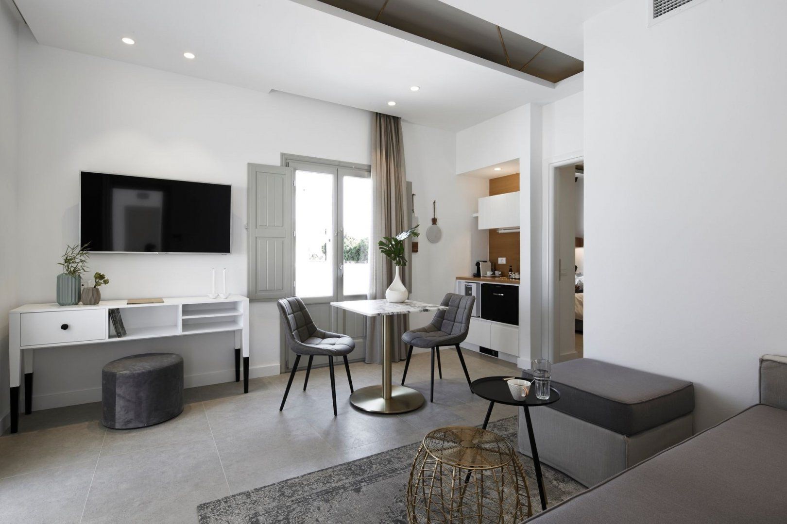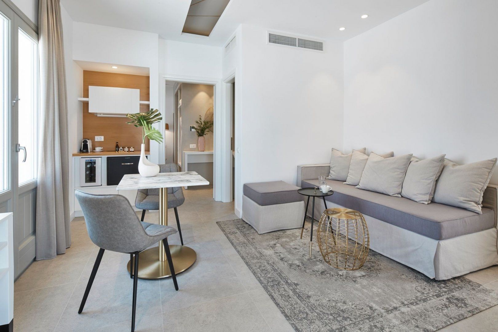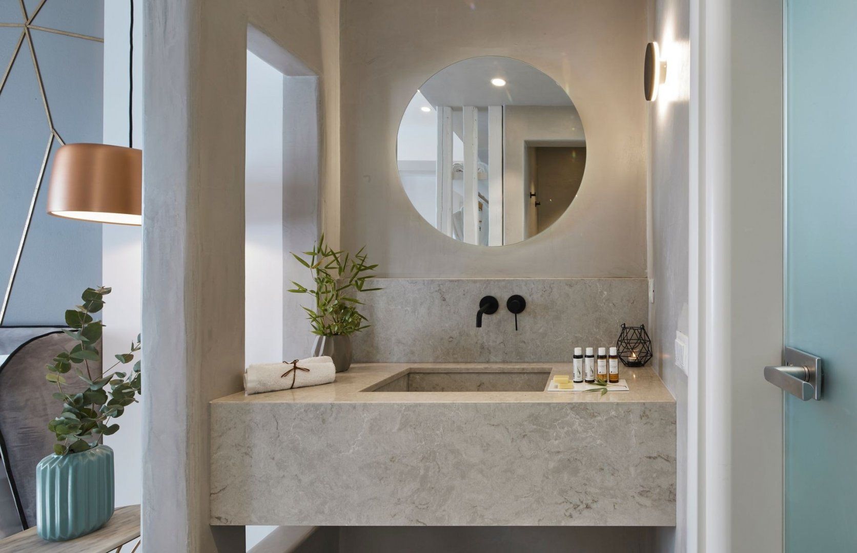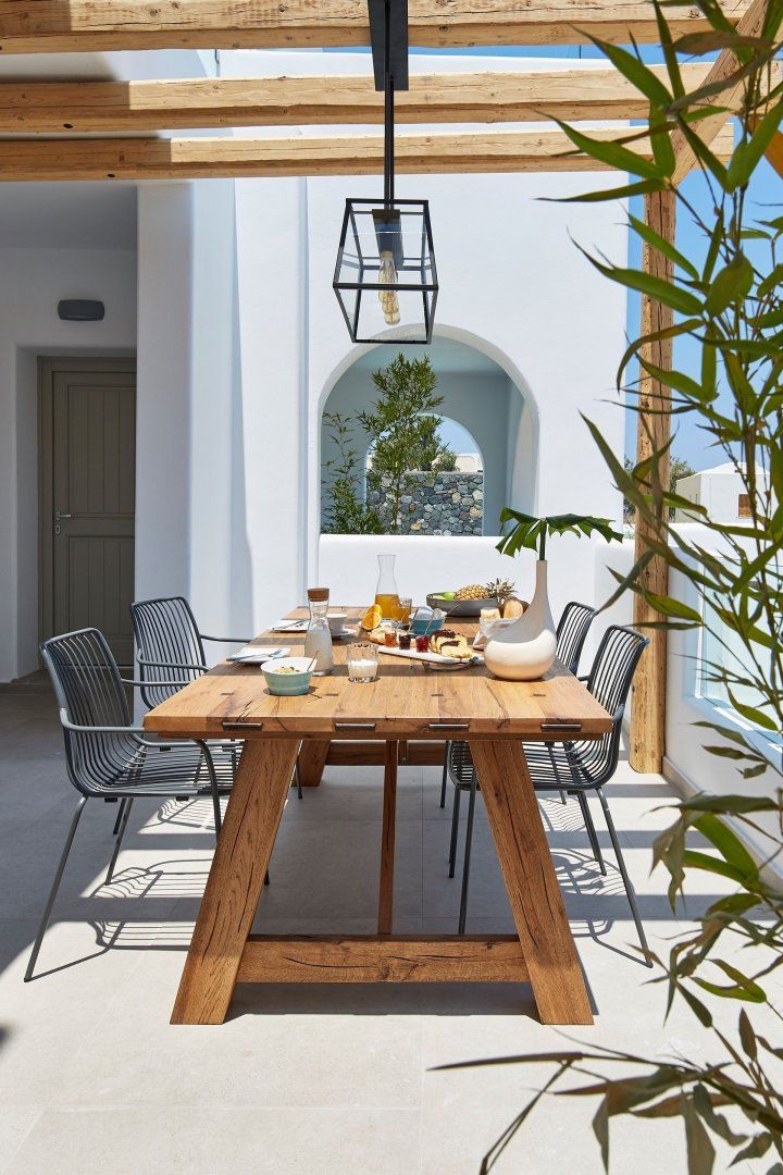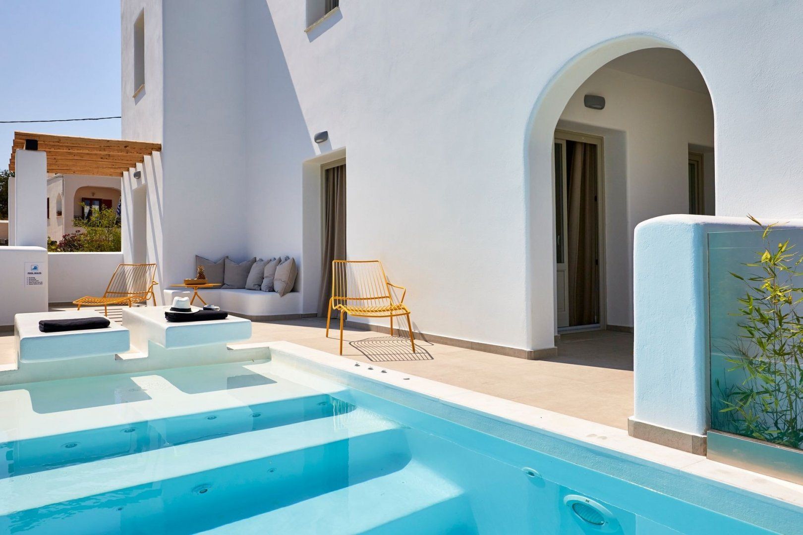 Located centrally in Mesaria, this white-washed and minimal home is ideal for a relaxing stay in Santorini away from the tourist hot spots. The communal space inside the apartment is pretty limited, and there isn’t a full kitchen – while the home can sleep up to four guests, we think this is best suited to a couple looking to explore the island. The private outdoor dining area is perfect for socialising and enjoying a couple of sundowners, while the terrace and heated plunge pool make for the ultimate sun-worshipping location.