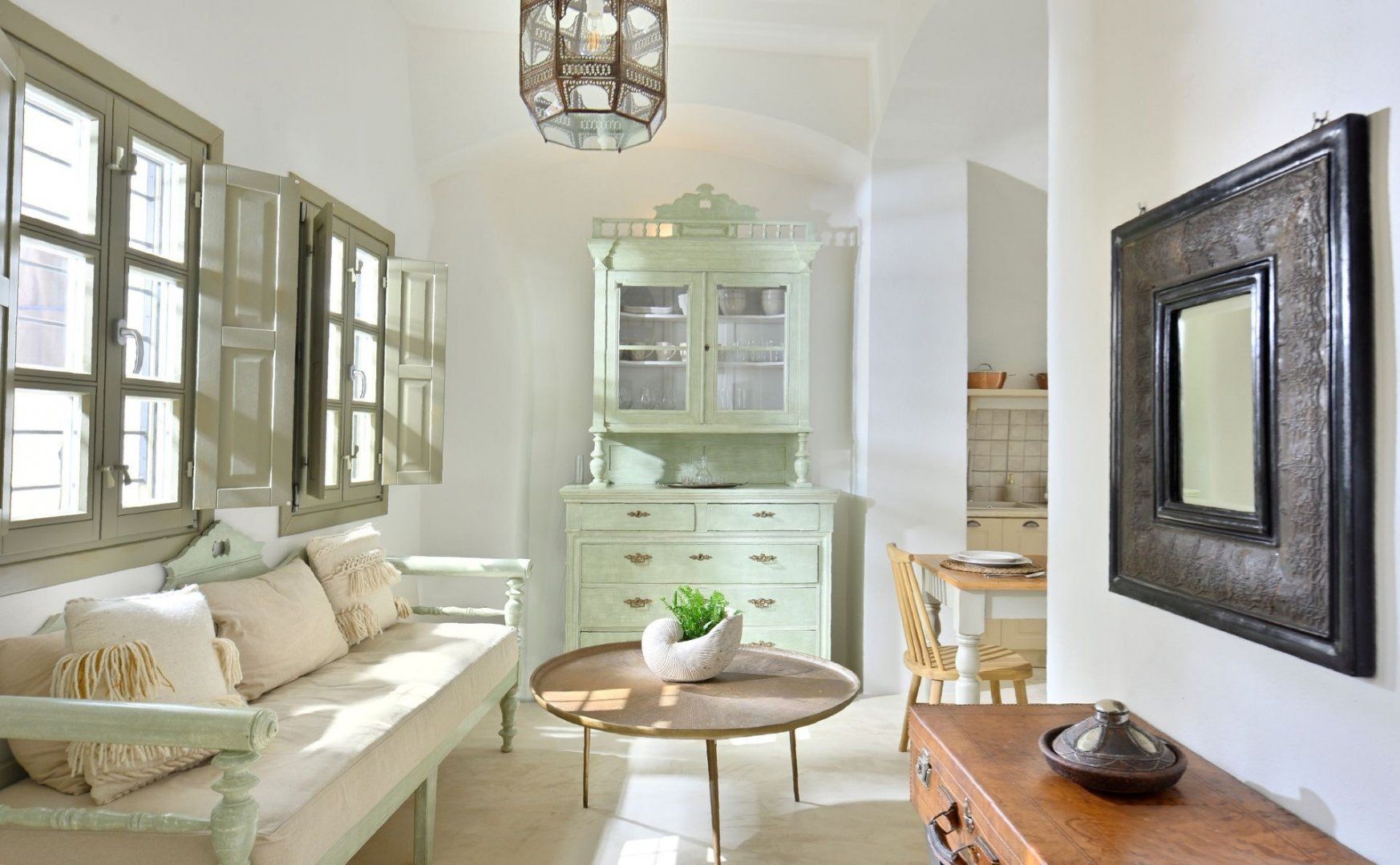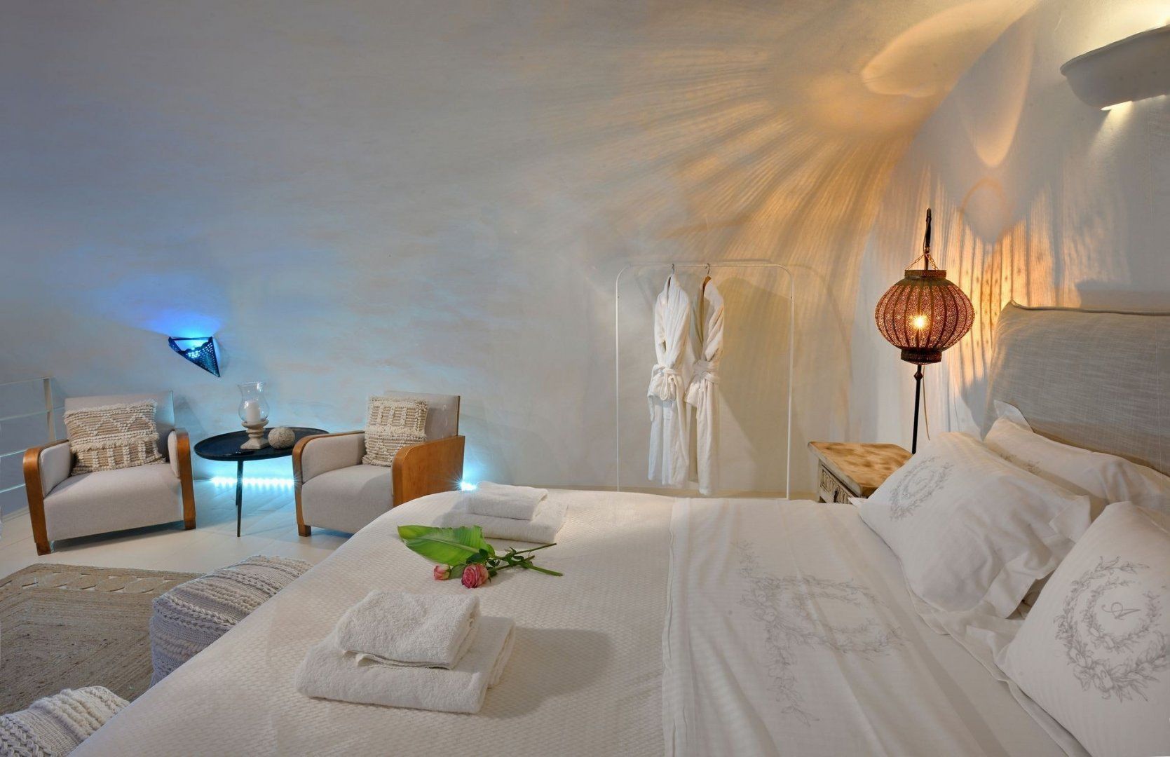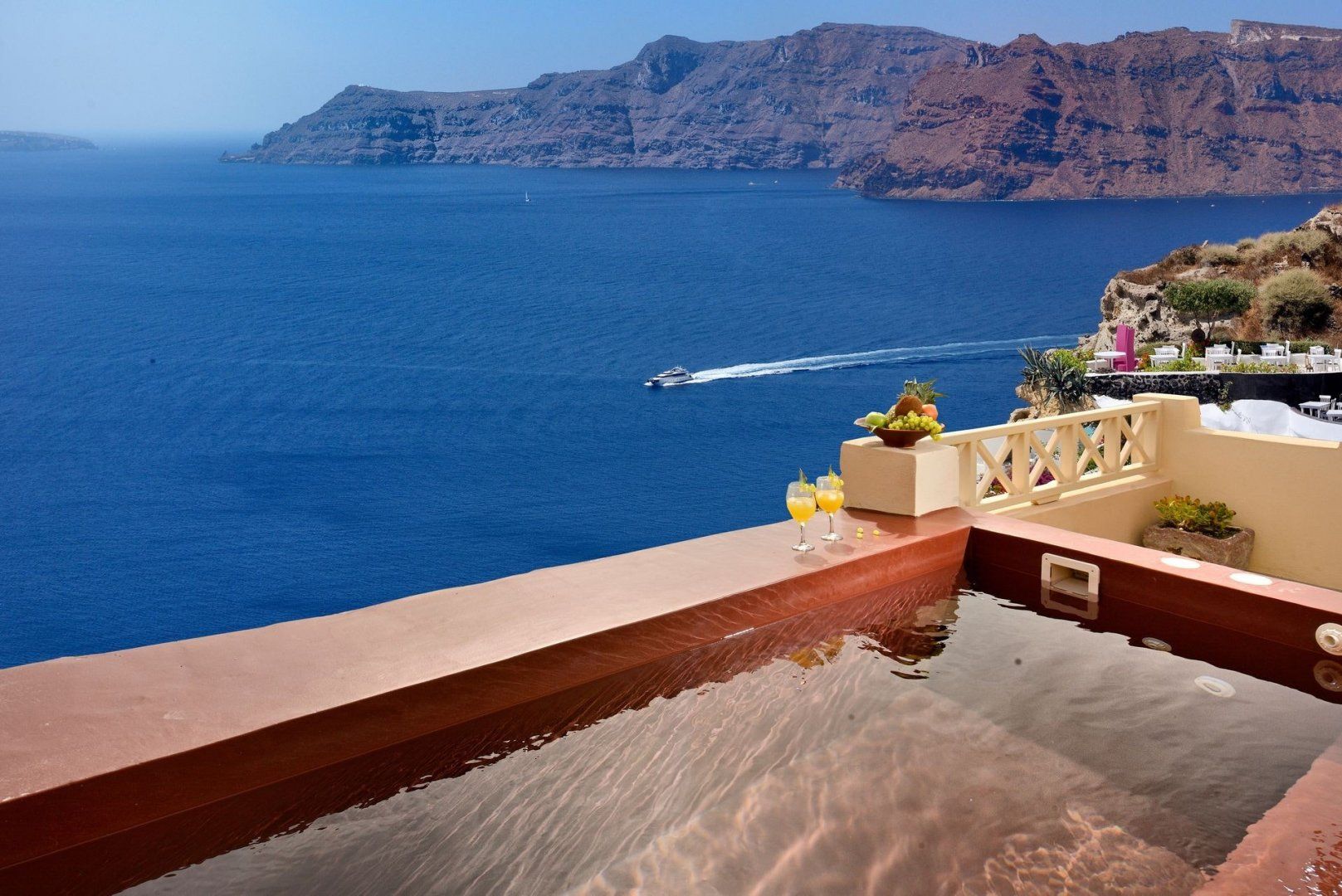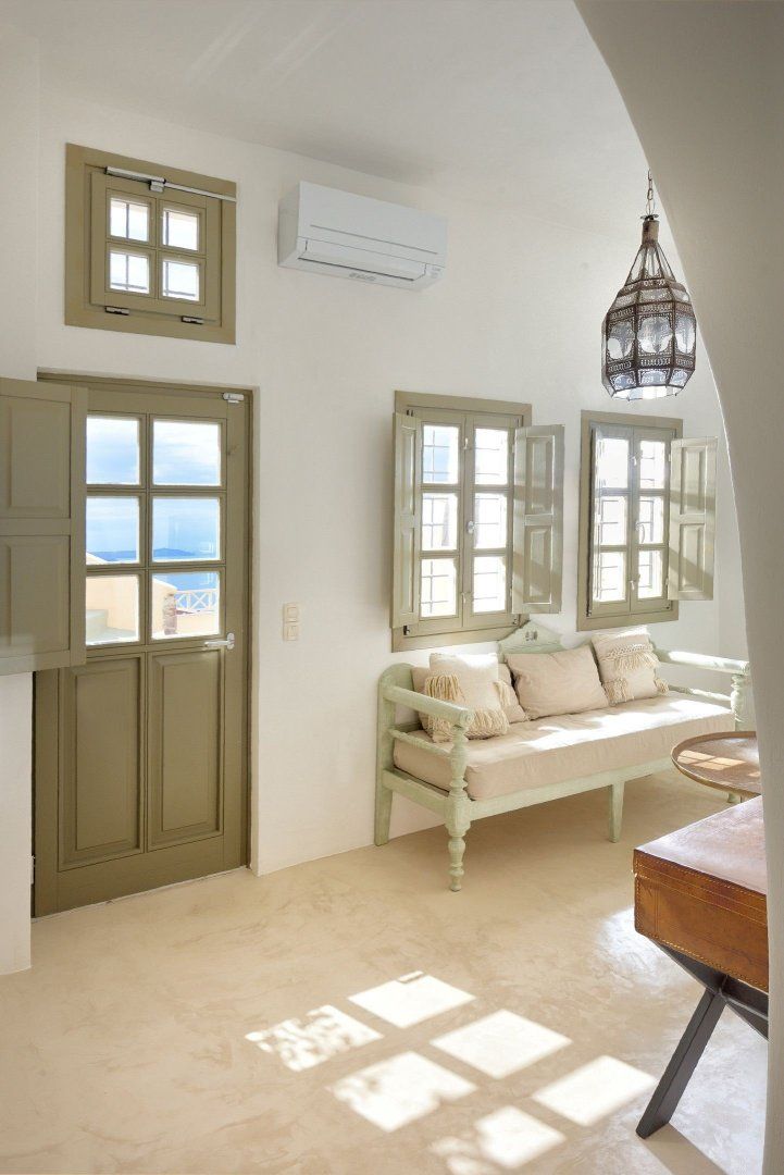 The views over the caldera from this cave home’s terrace in Oia are stunning. There are not one, but two Jacuzzis to relax in, one indoors and one outdoors with incredible vistas, while inside, the décor is classic and charming. A few things to note, we’d say – the wifi can be a bit patchy, especially towards the back of the house. Also, you don’t get a sunset or sunrise view, but the vistas are fabulous even without them and it’s just a few minutes’ stroll to a sunset vantage point in the town. In fact, the location is ideal as you can walk to boutiques, restaurants and bars.