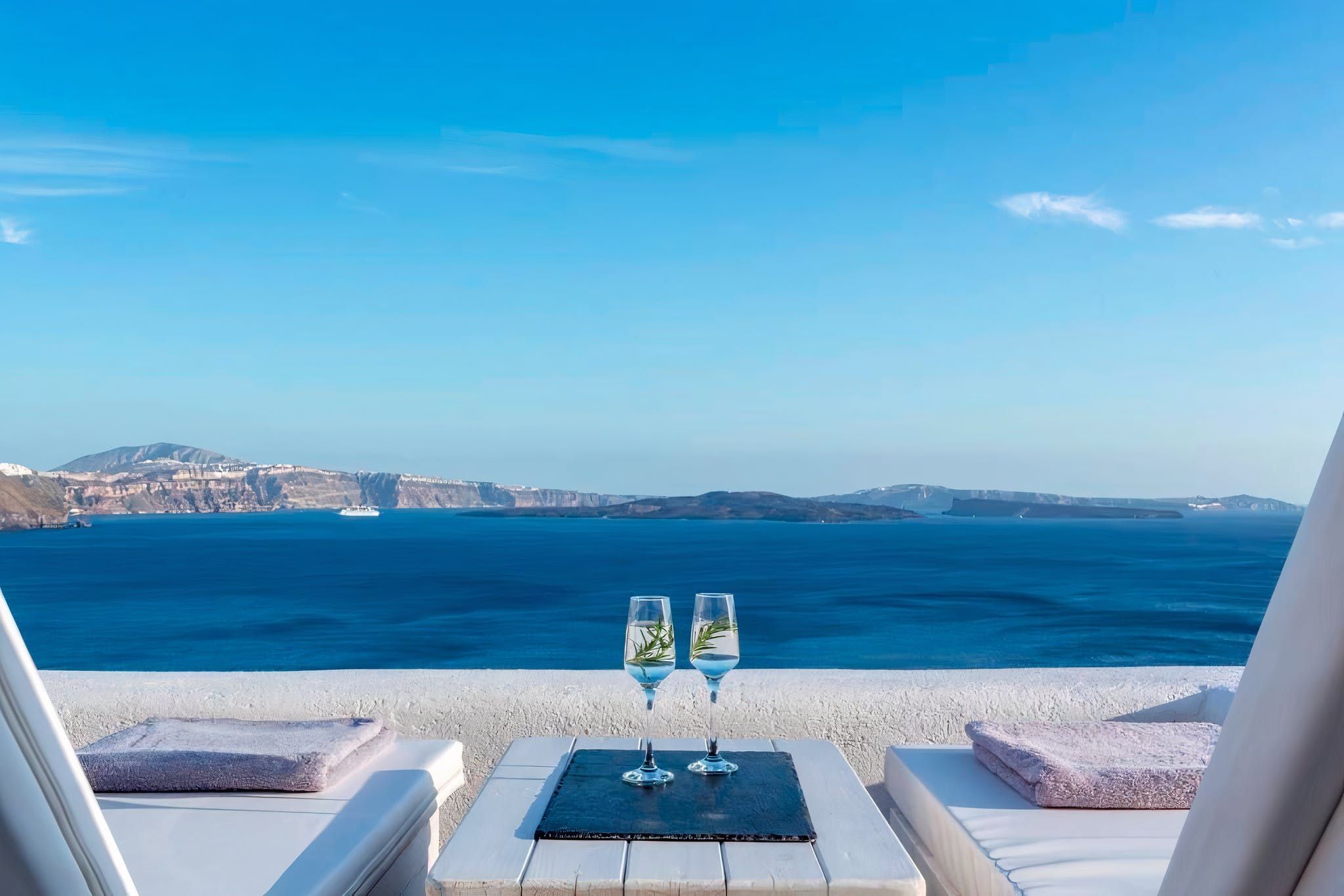 An alternative is to head outside to the private roof terrace. Sunbeds and outdoor furniture make this a comfortable spot to gaze out to neverending views of the Aegean Sea. As it’ll be hot up here, put the champagne on ice and take a dip iny our private plunge pool – there’s no better way to cool off from the midday sun.