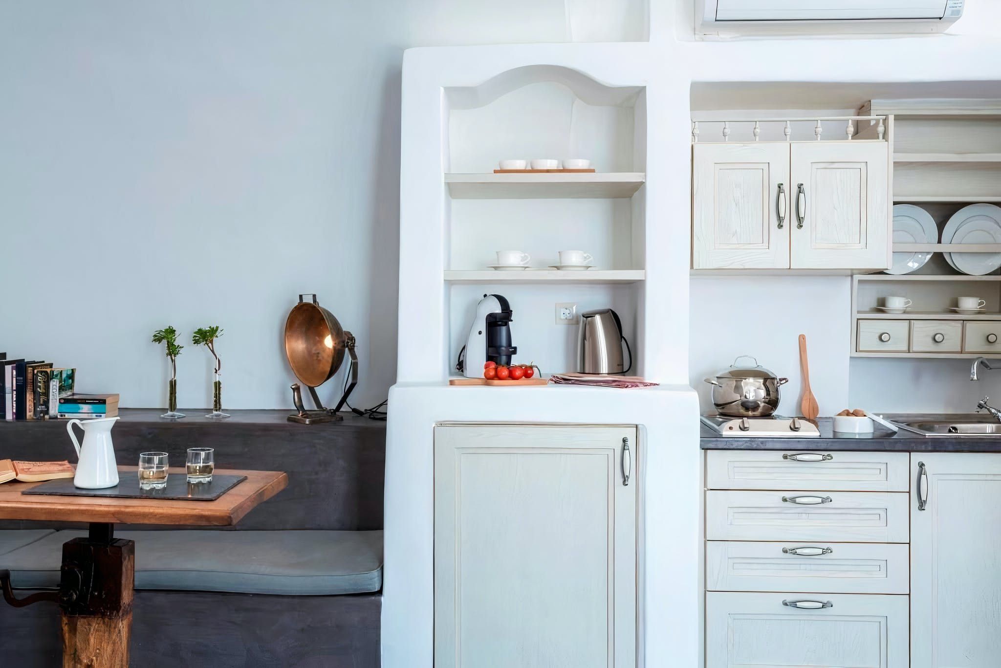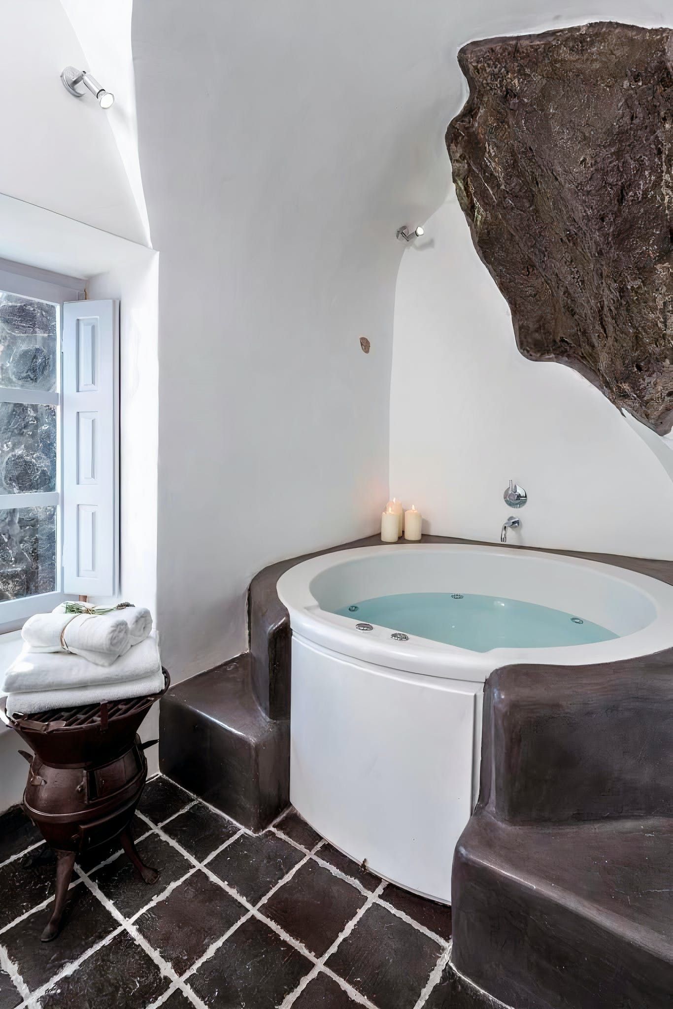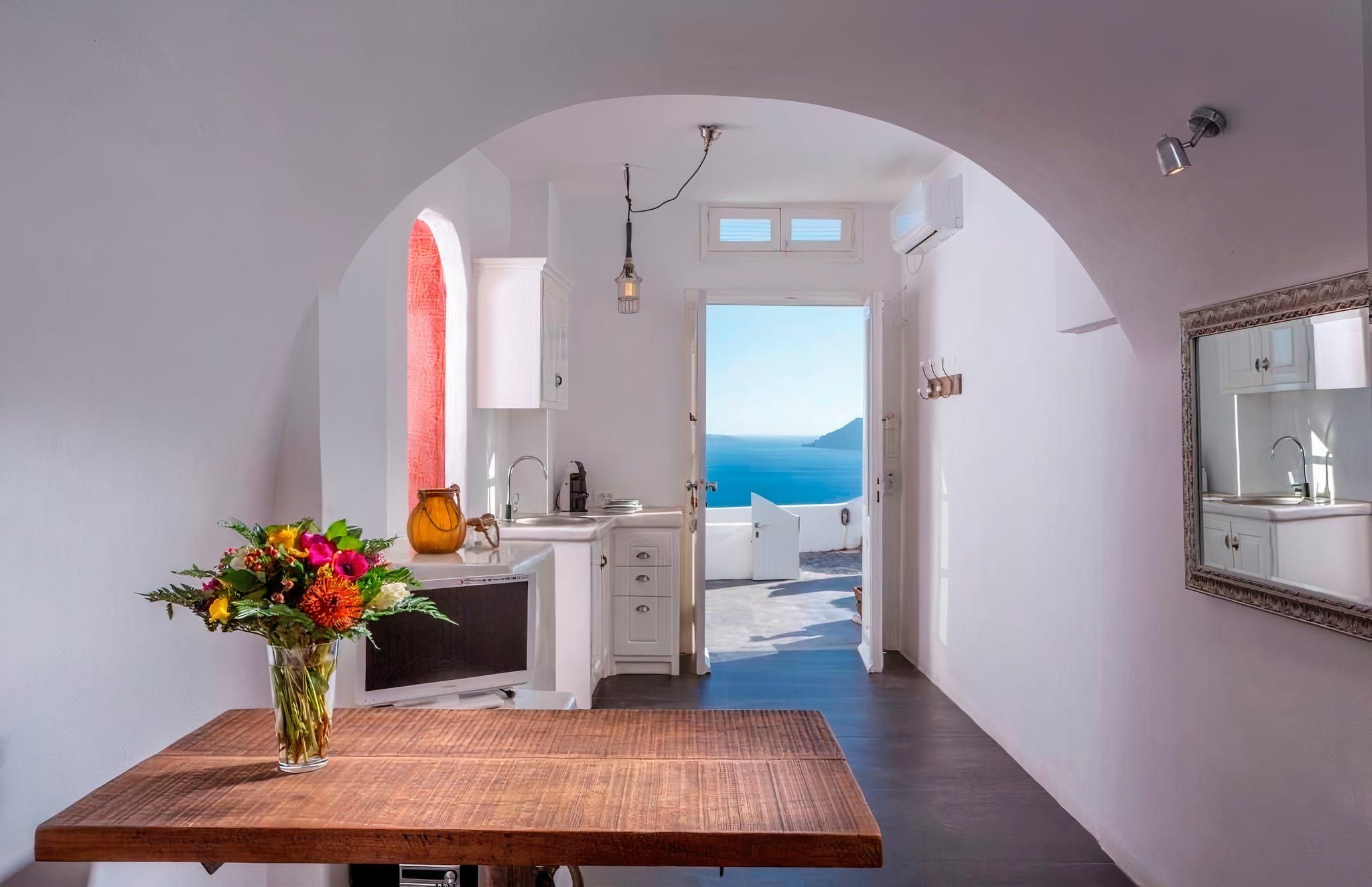 This white structure has the traditional vibe that you might expect. But within, it's all about luxury. Arched living spaces feel cool and airy, with classic white walls and tiled floors adding to the effect. However, in one alcove you’ll find a romantic bedroom, and in other there’s an indoor hot tub. Pop some champagne to take into the bubbles in this opulent home.