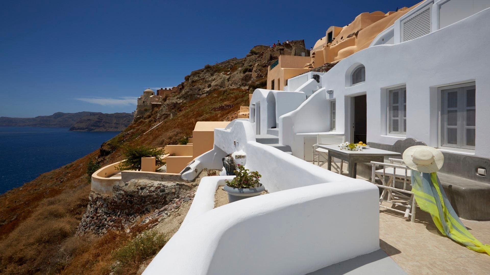 Inside, you'll find bright and breezy interiors with tiled flooring, homespun furnishings, and crisp white linens, creating typically minimalist interiors. All three of the bedrooms have direct access onto the balconies and terraces, making for seamless indoor-outdoor living. Soak up the hot Santorini sun from the comfort of the heated jacuzzi, while admiring the idyllic ocean views with a glass of bubbly in hand.