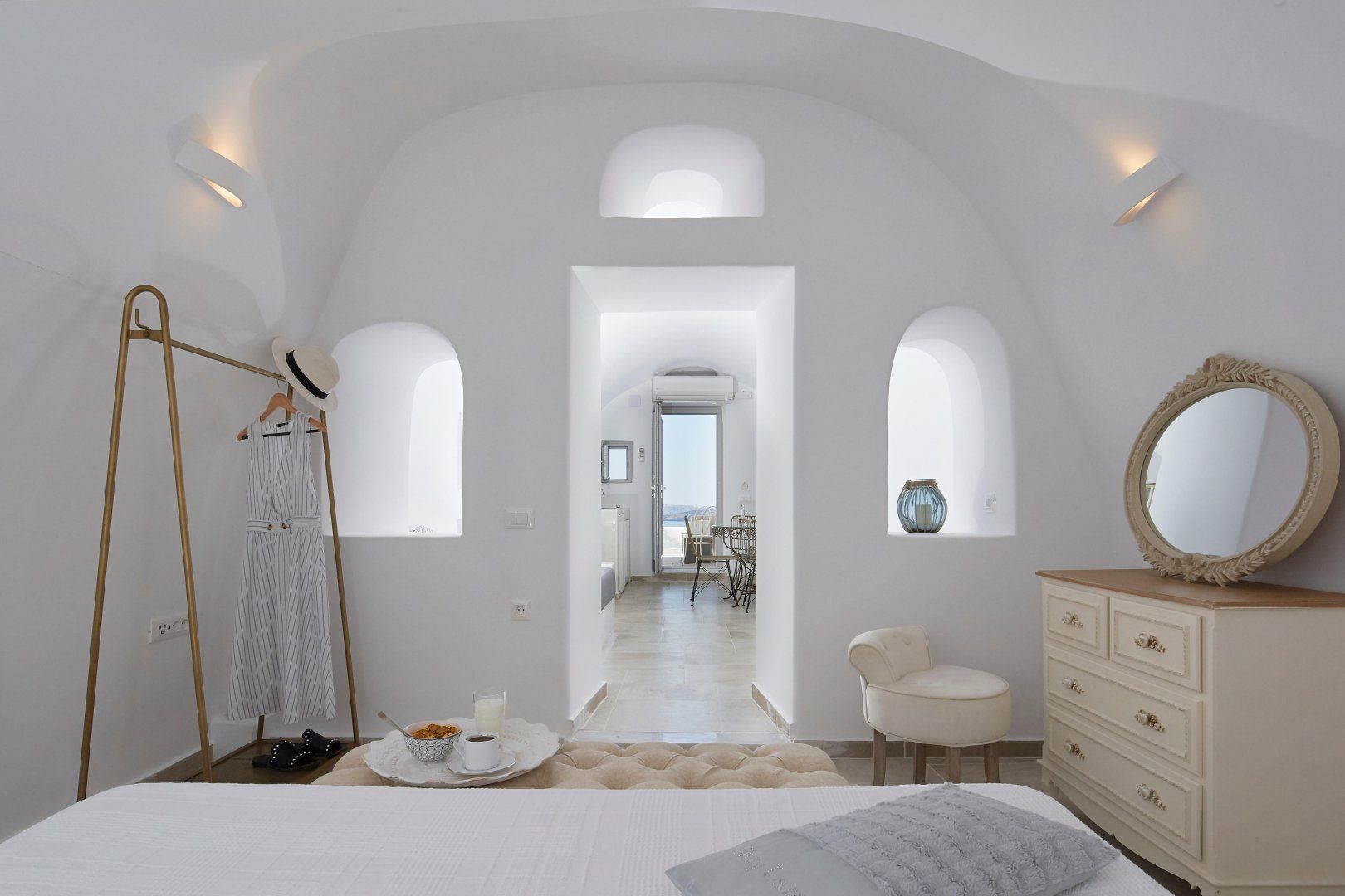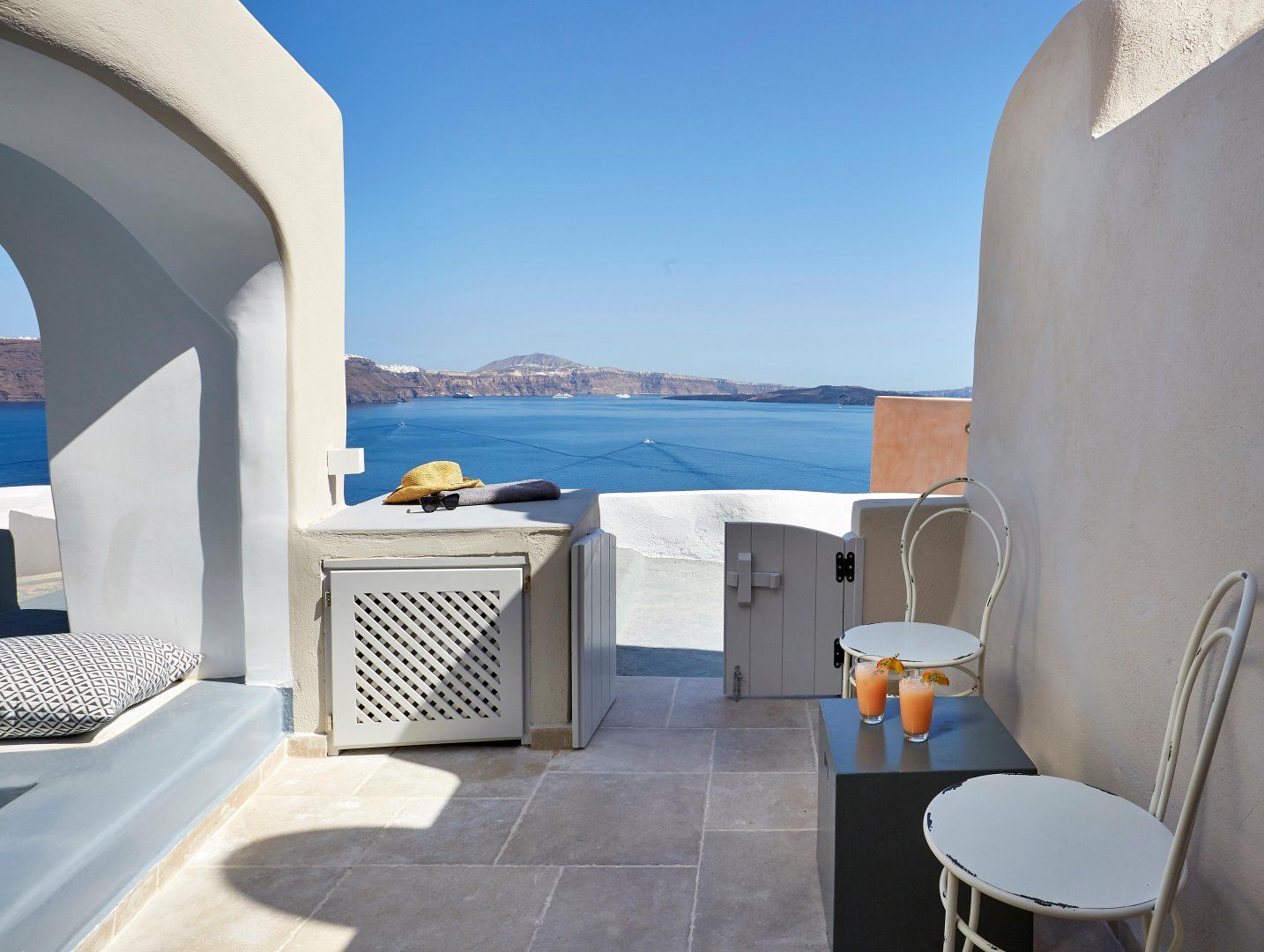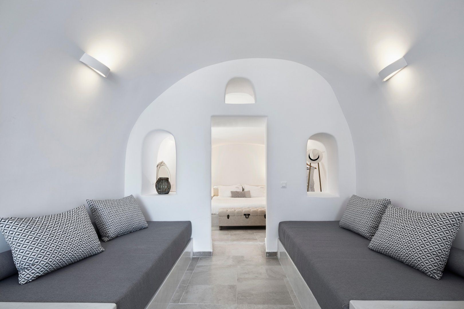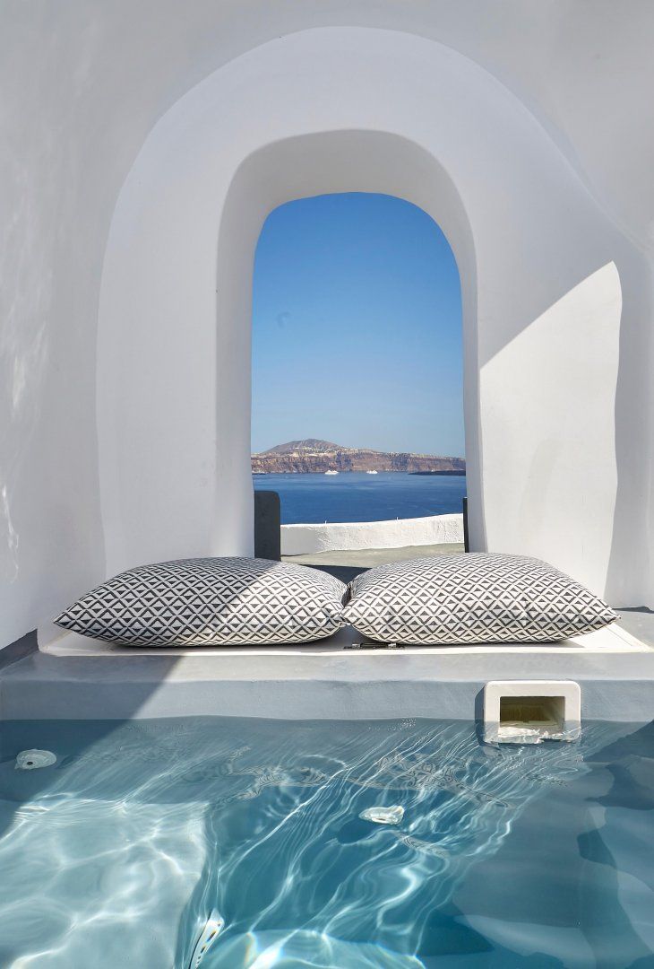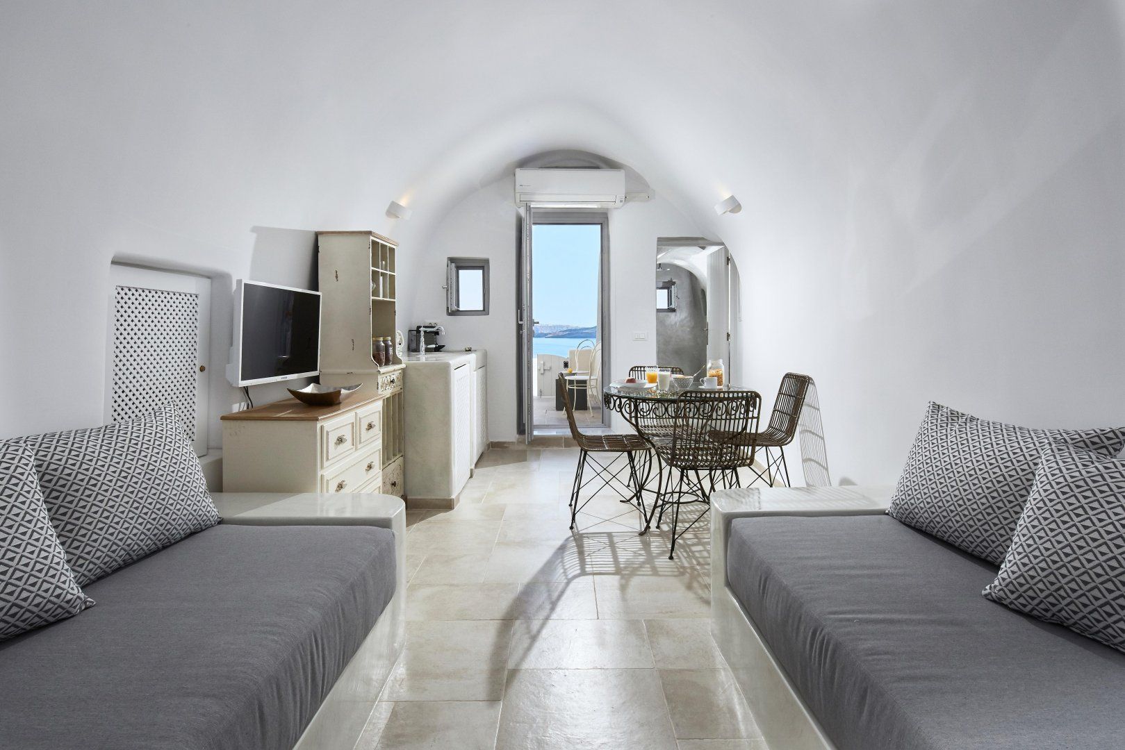 This compact villa offers open-plan studio-style space which is best suited to a couple, although the two sofa beds in the living area could be used for children. The wow factor here is the spectacular view across the Aegean Sea to the caldera, which can be enjoyed from the private hot tub, balcony and living area. There is a basic kitchenette for making coffee and snacks but there aren’t the facilities for cooking proper meals here. Luckily breakfast is included and there are plenty of restaurants within walking distance. The coastal town of Oia, with its whitewashed houses carved into the cliffs, is on your doorstep and the rocky beach of Ammoudi, perfect for swimming, is less than a mile away.