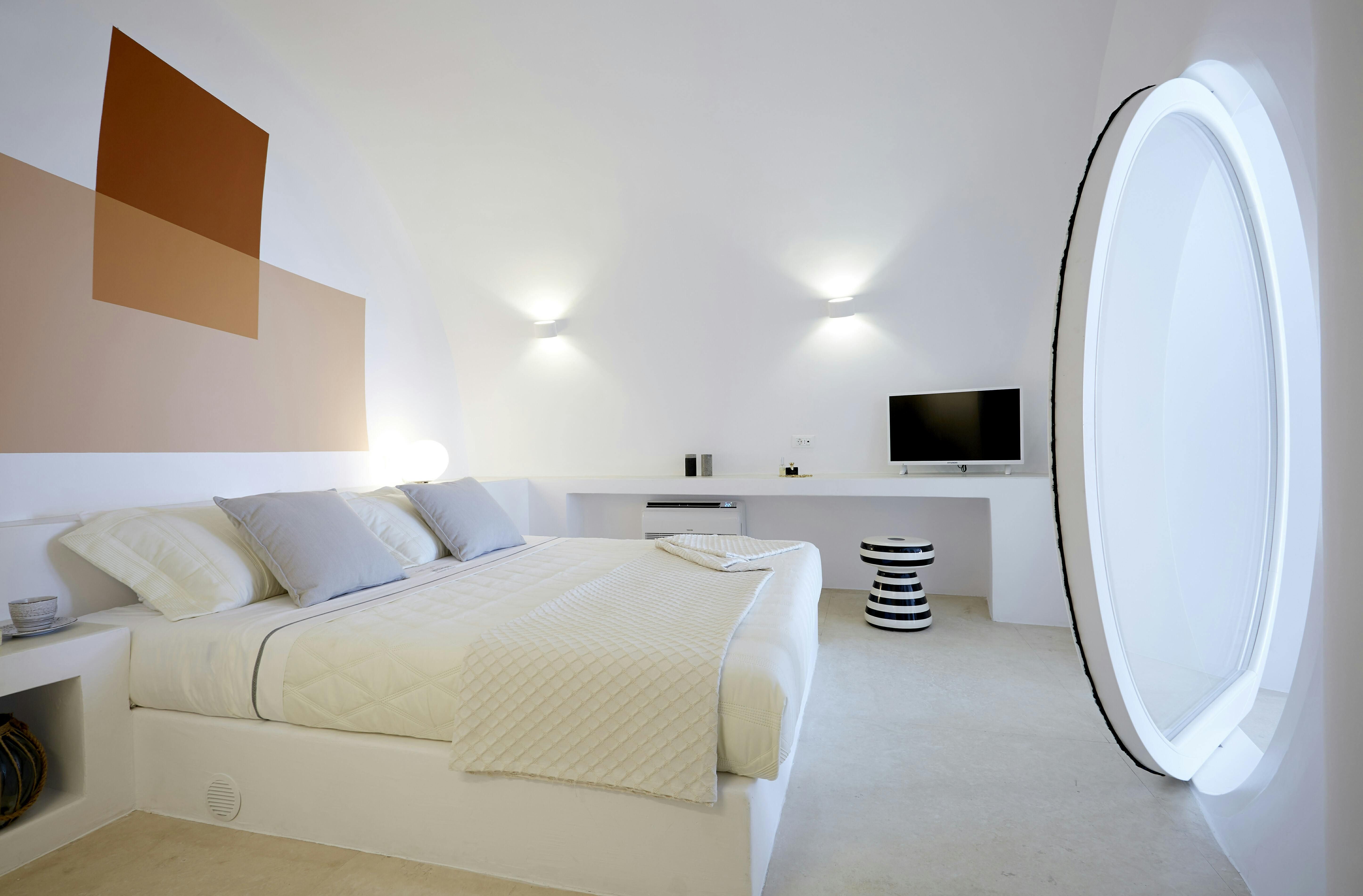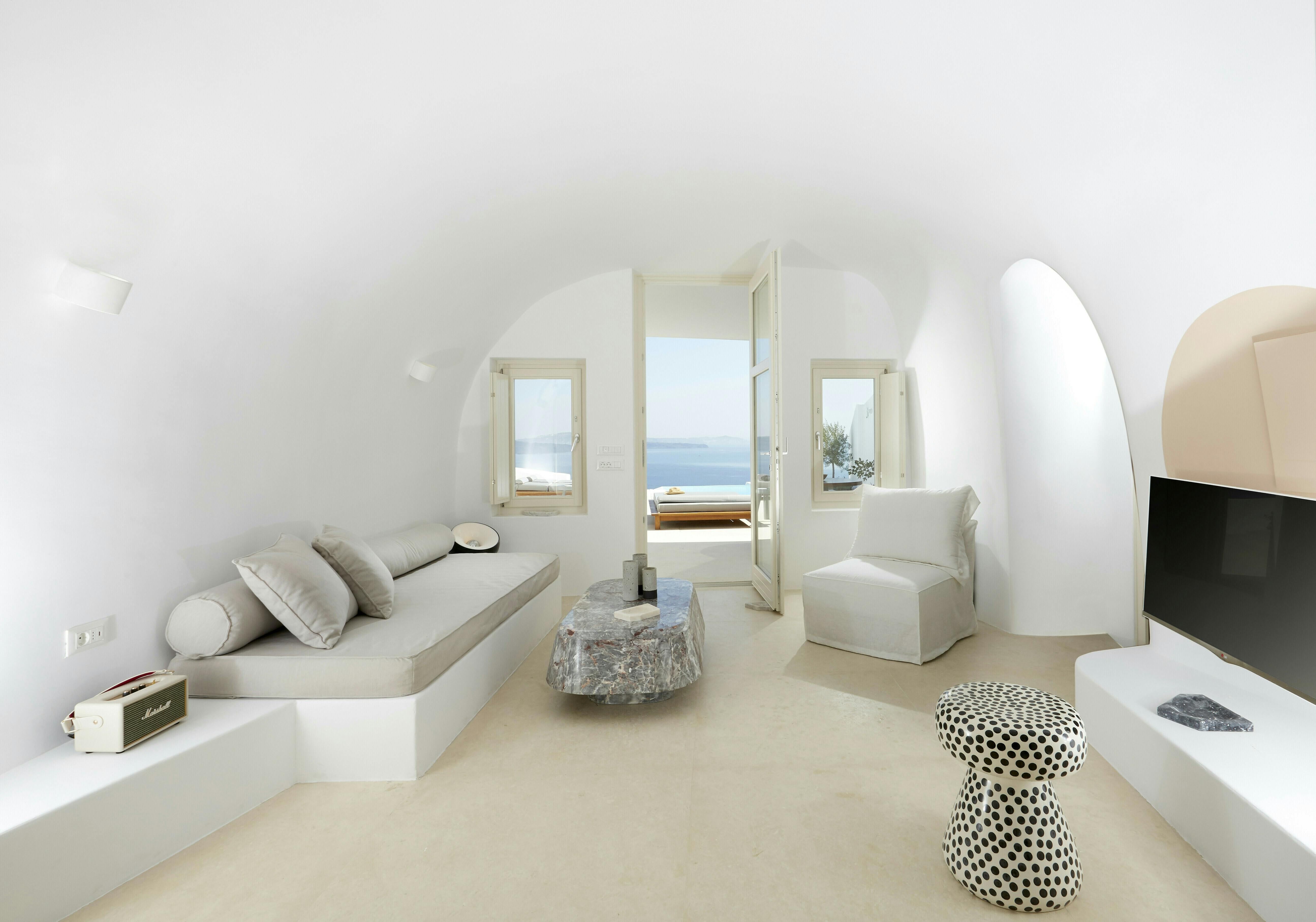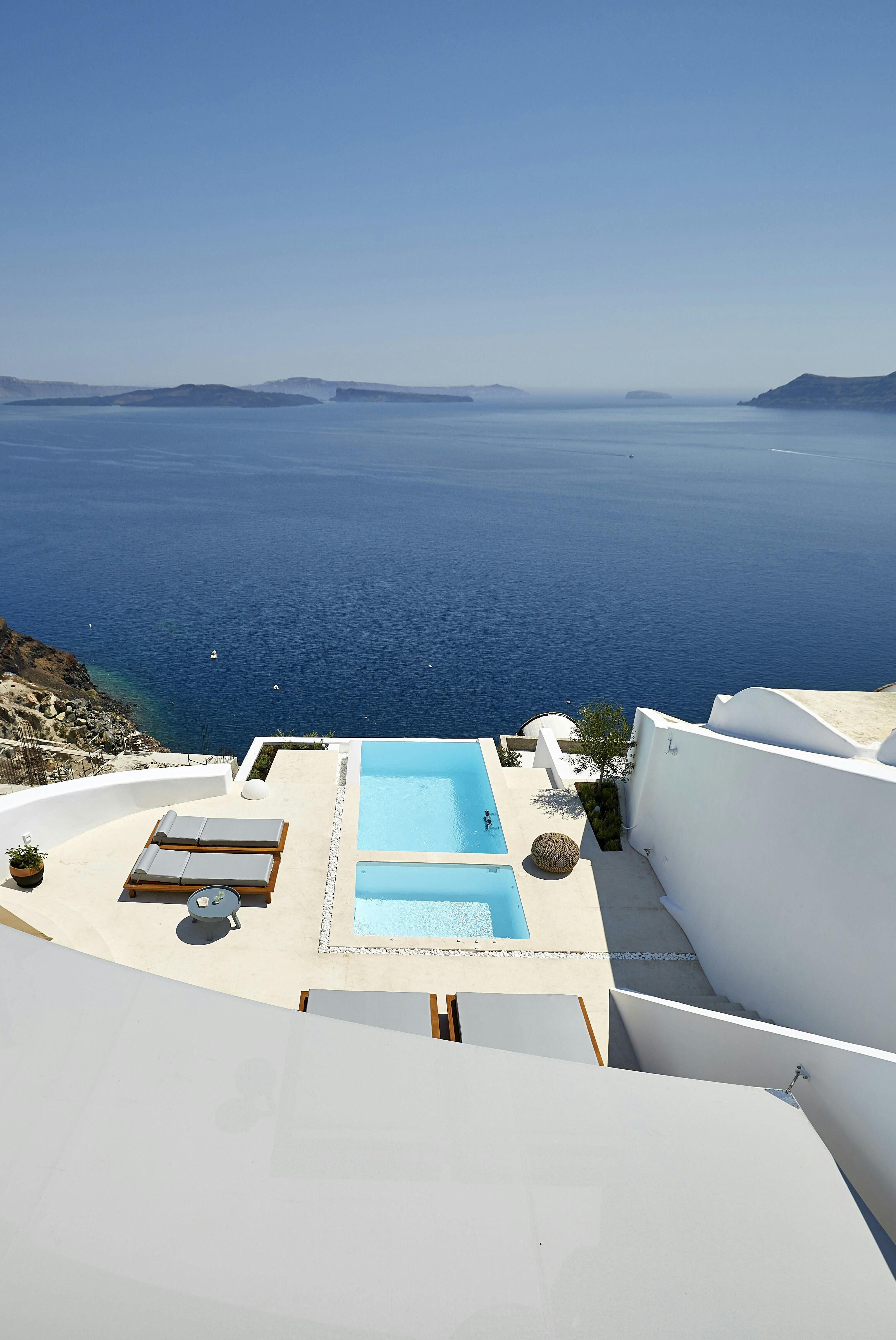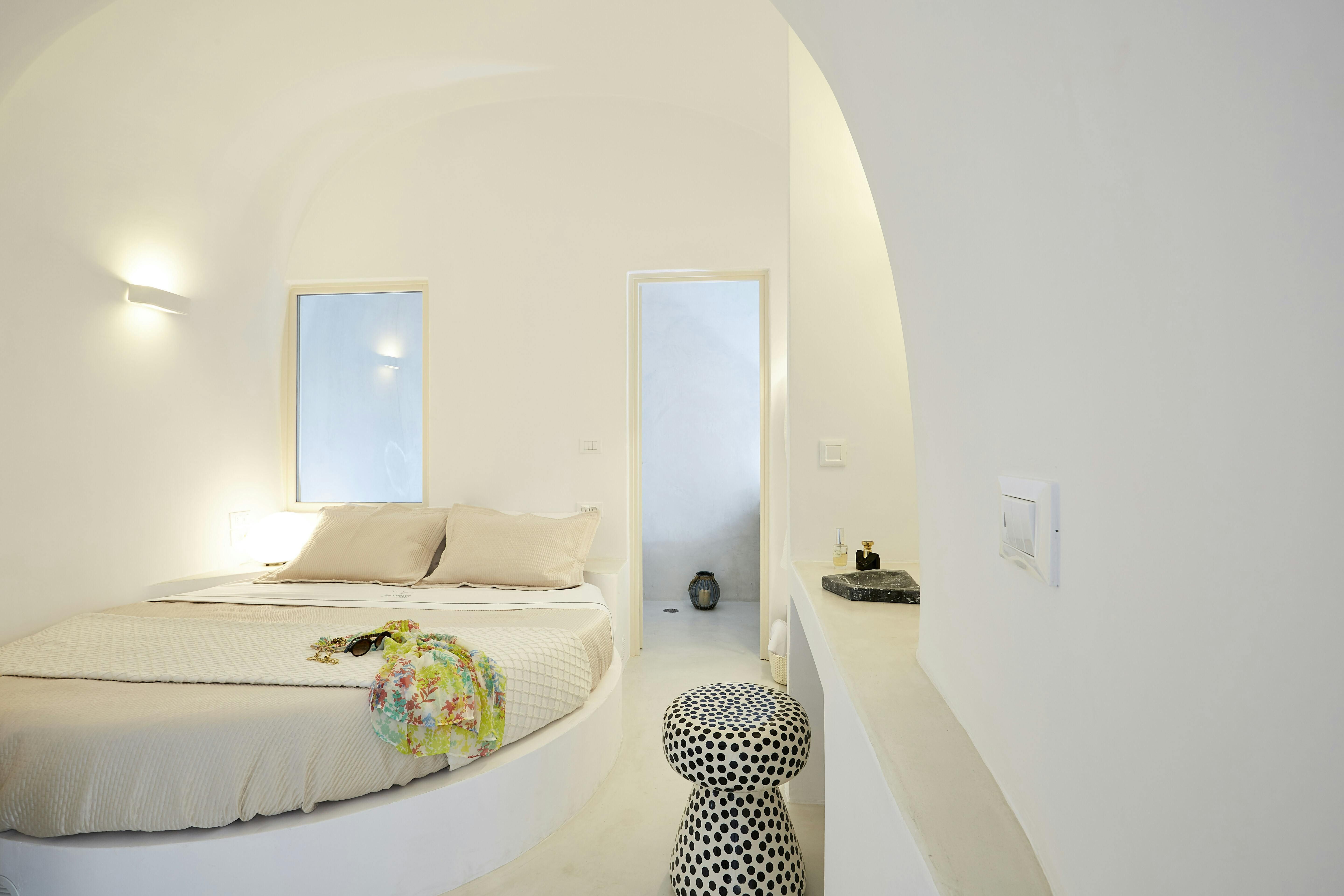 This villa promises a serene Santorini holiday, nestled right in Oia village. Inside, the space joins traditional Cycladic charm (think domed ceilings and fresh white walls) with modern, almost futuristic touches, like a round swing door leading into one of the bedrooms. The kitchenette is tucked neatly behind a shutter door, keeping the living area clear and uncluttered between meals, while the minimalist bedrooms make a peaceful spot to unwind after a day on the island. Our true highlight? It has to be the tranquil infinity pool. Step outside and you’ll see why, with its sweeping views of the Aegean Sea and the caldera.