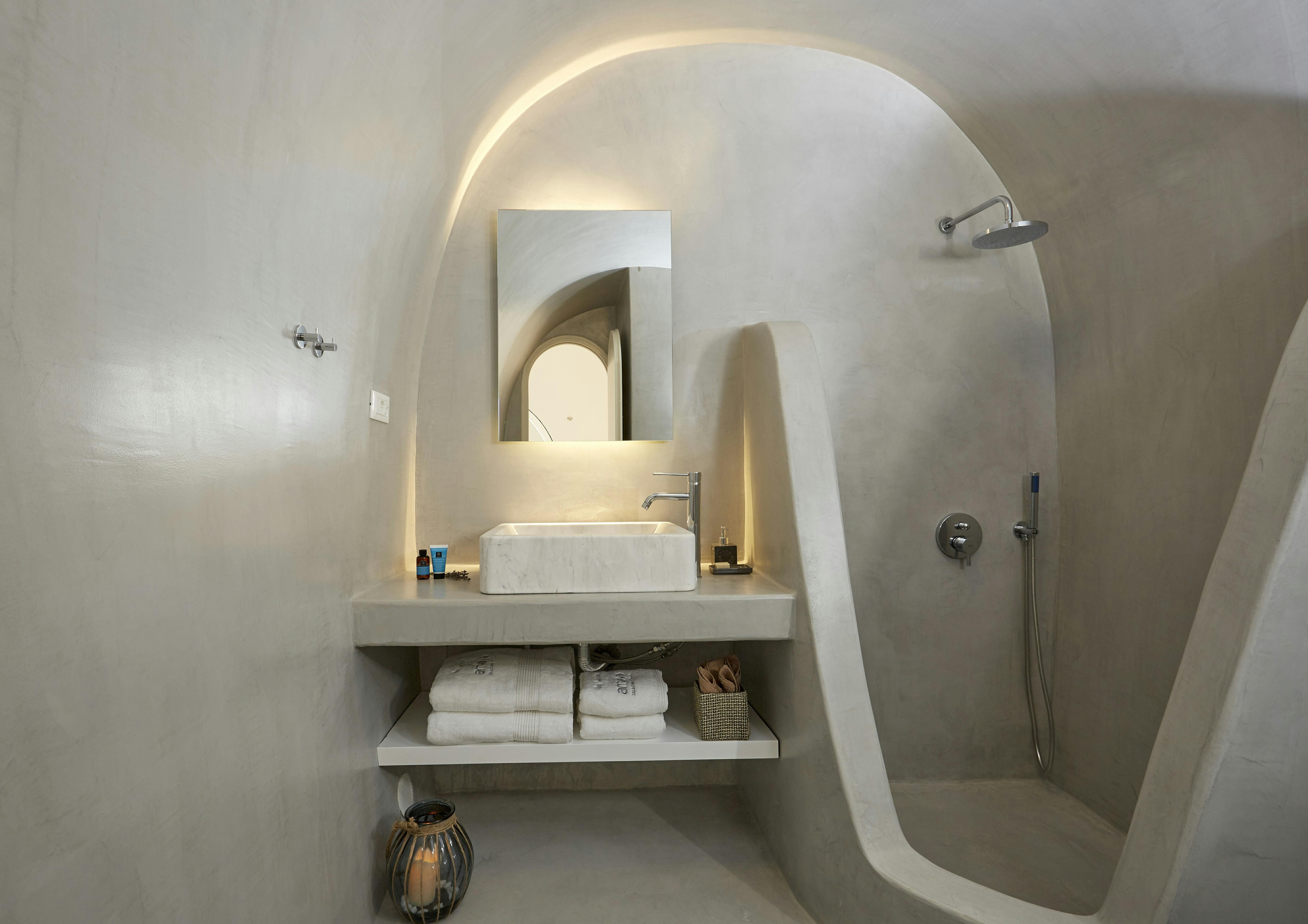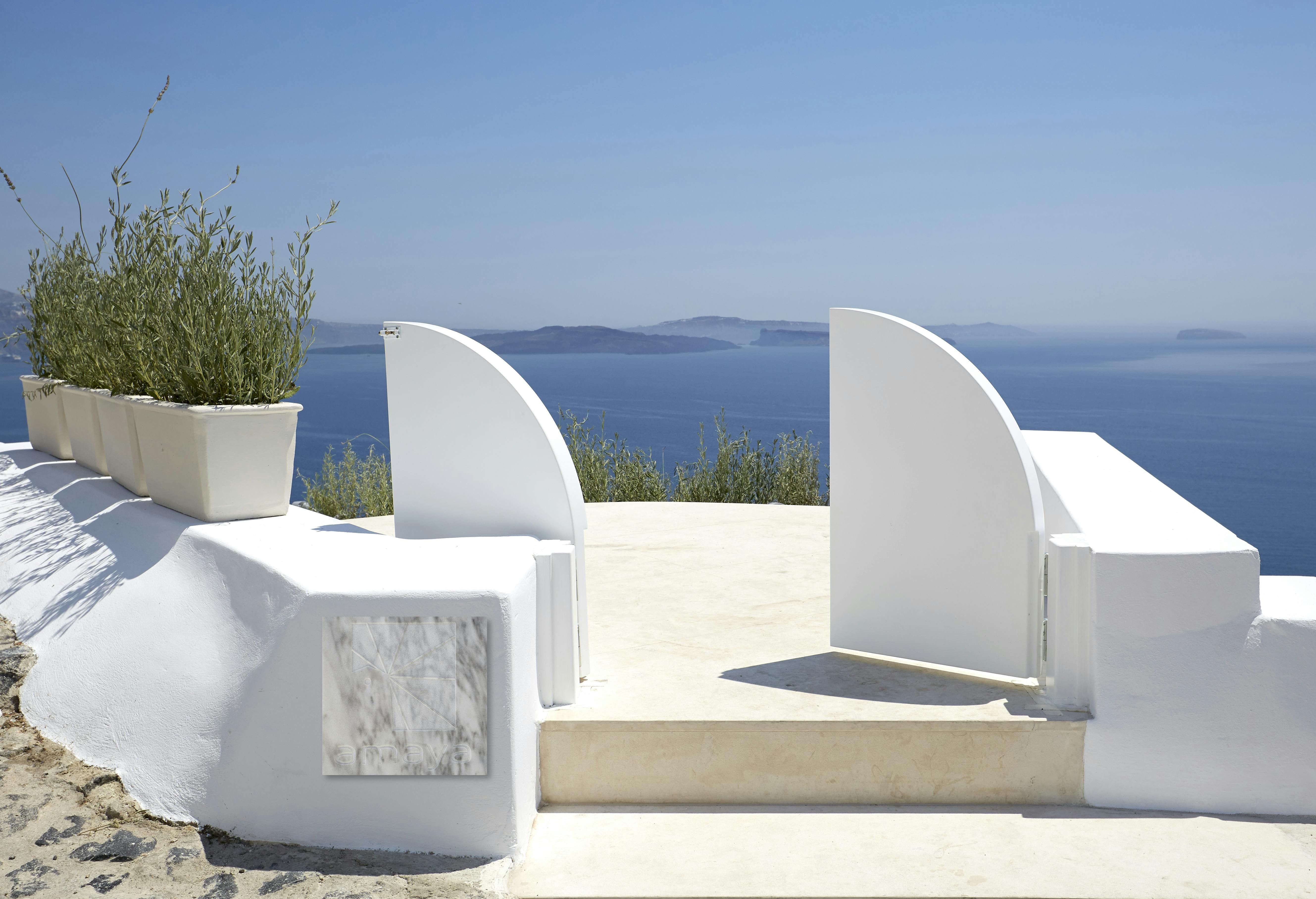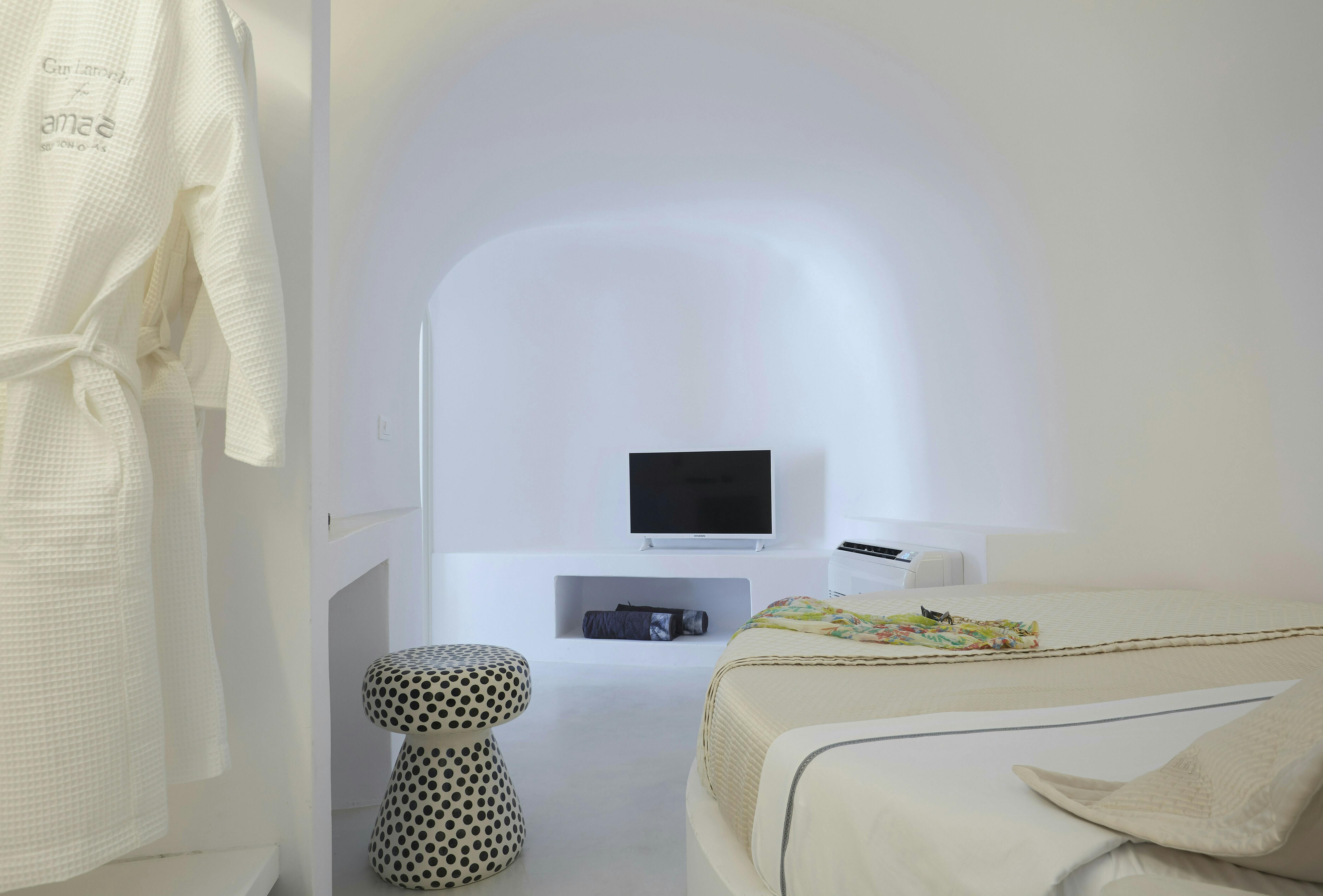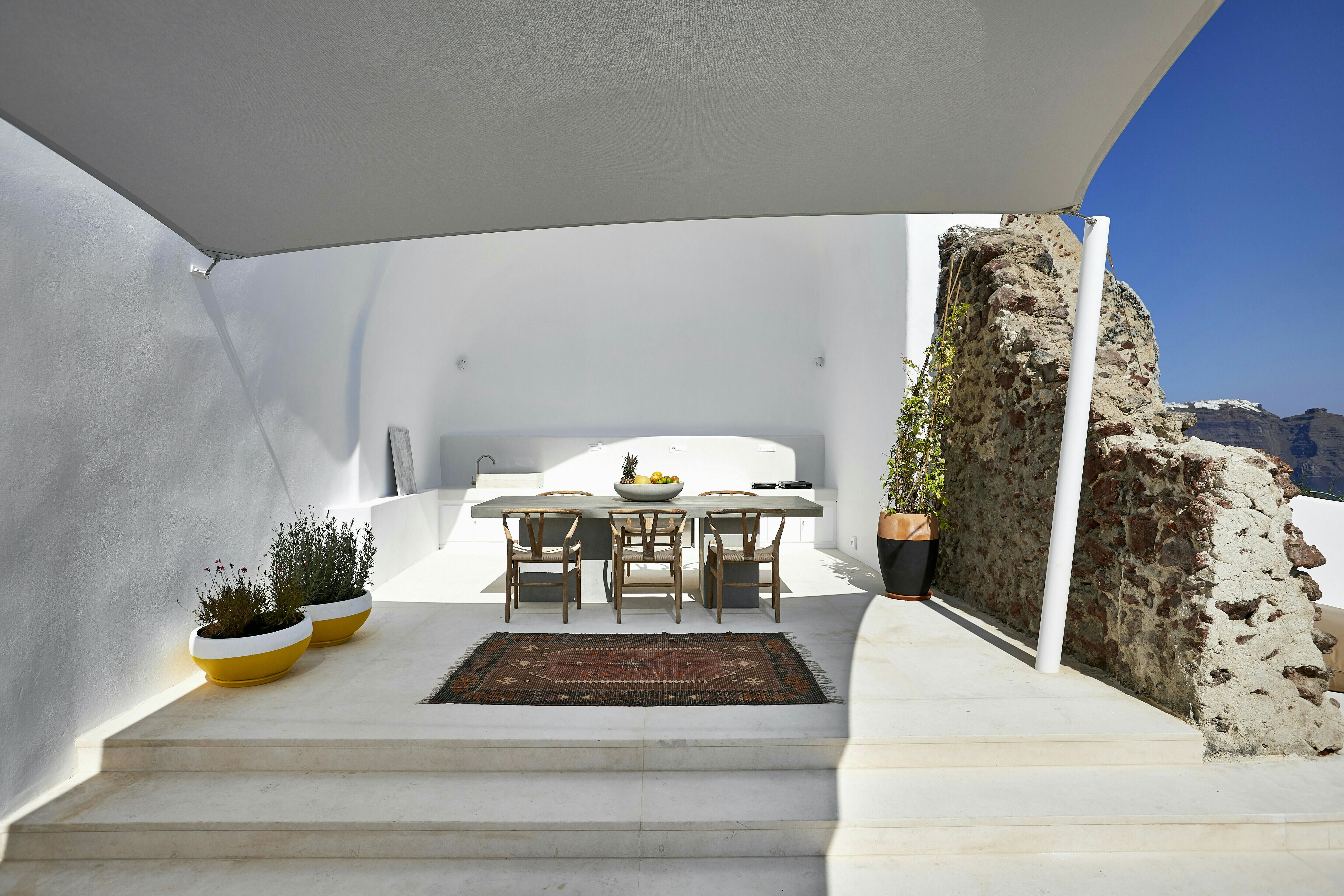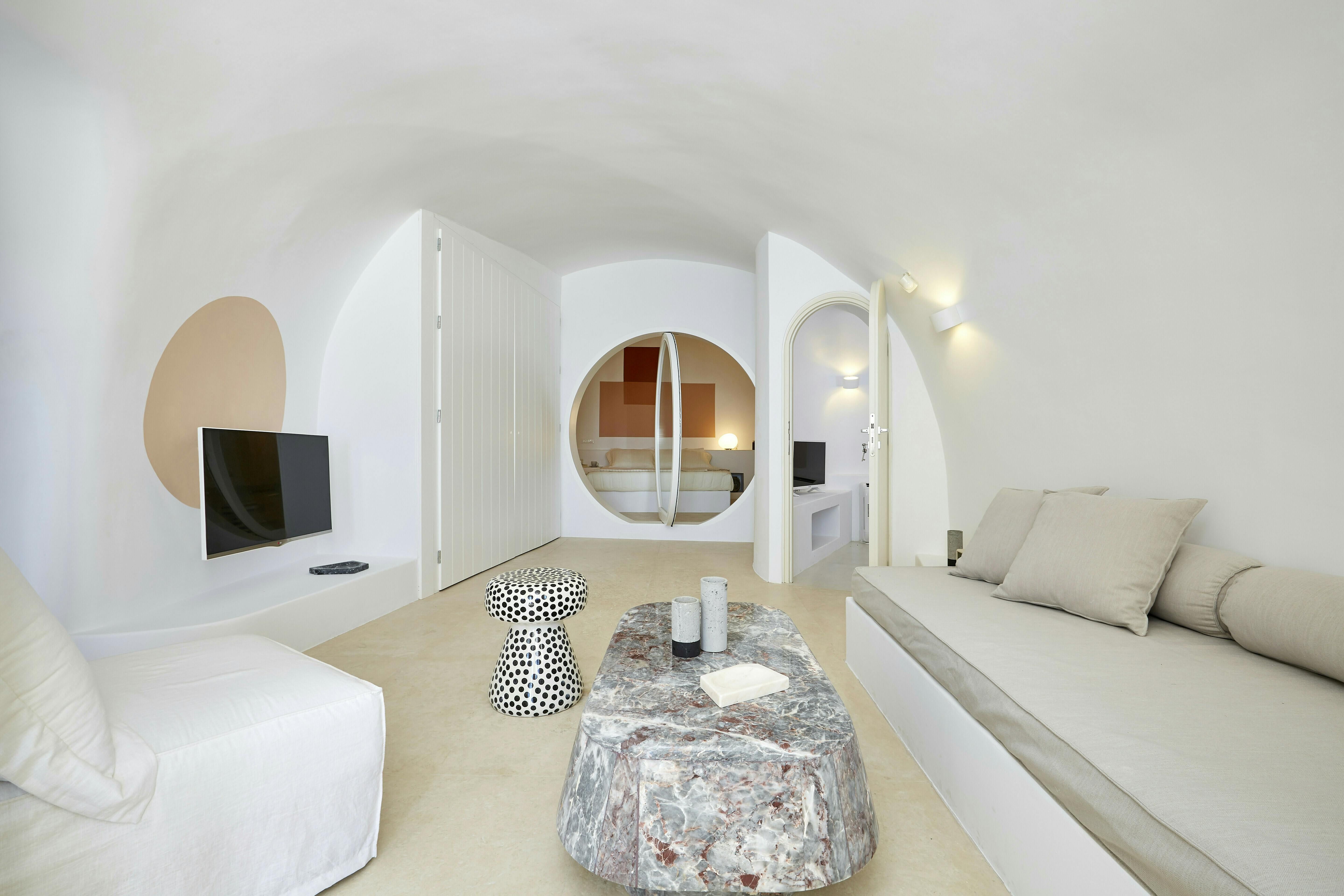 This villa promises a serene Santorini holiday, nestled right in Oia village. Inside, the space joins traditional Cycladic charm (think domed ceilings and fresh white walls) with modern, almost futuristic touches, like a round swing door leading into one of the bedrooms. The kitchenette is tucked neatly behind a shutter door, keeping the living area clear and uncluttered between meals, while the minimalist bedrooms make a peaceful spot to unwind after a day on the island. Our true highlight? It has to be the tranquil infinity pool. Step outside and you’ll see why, with its sweeping views of the Aegean Sea and the caldera.