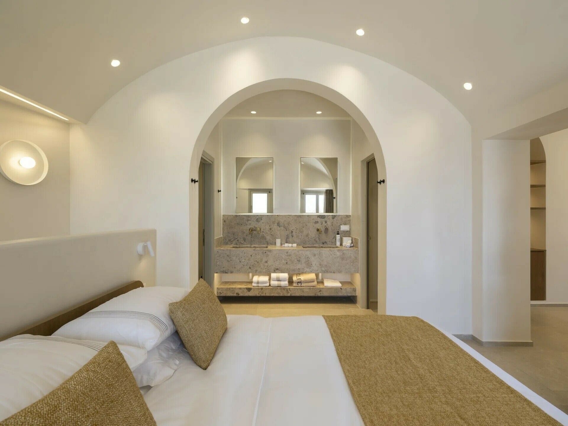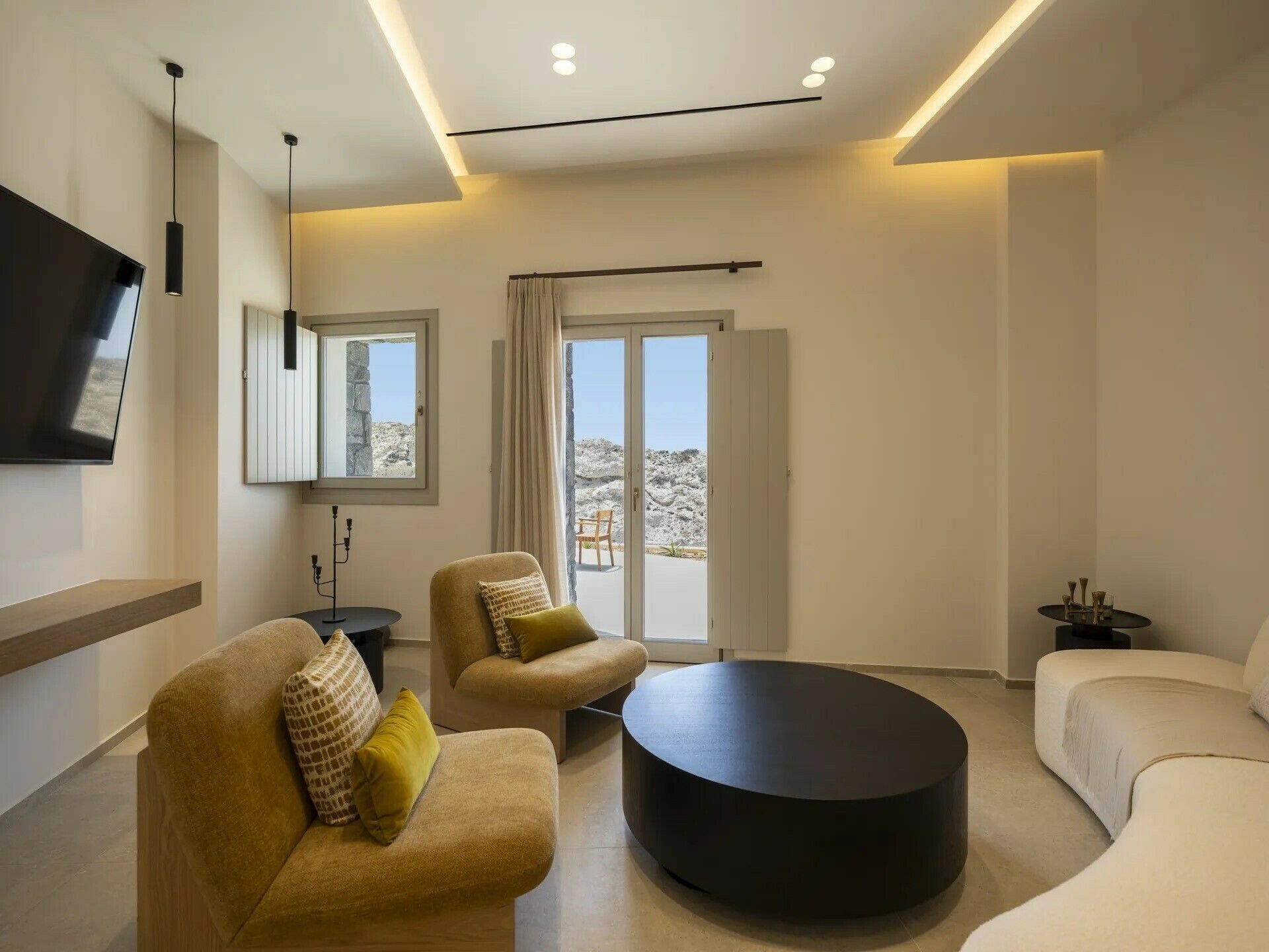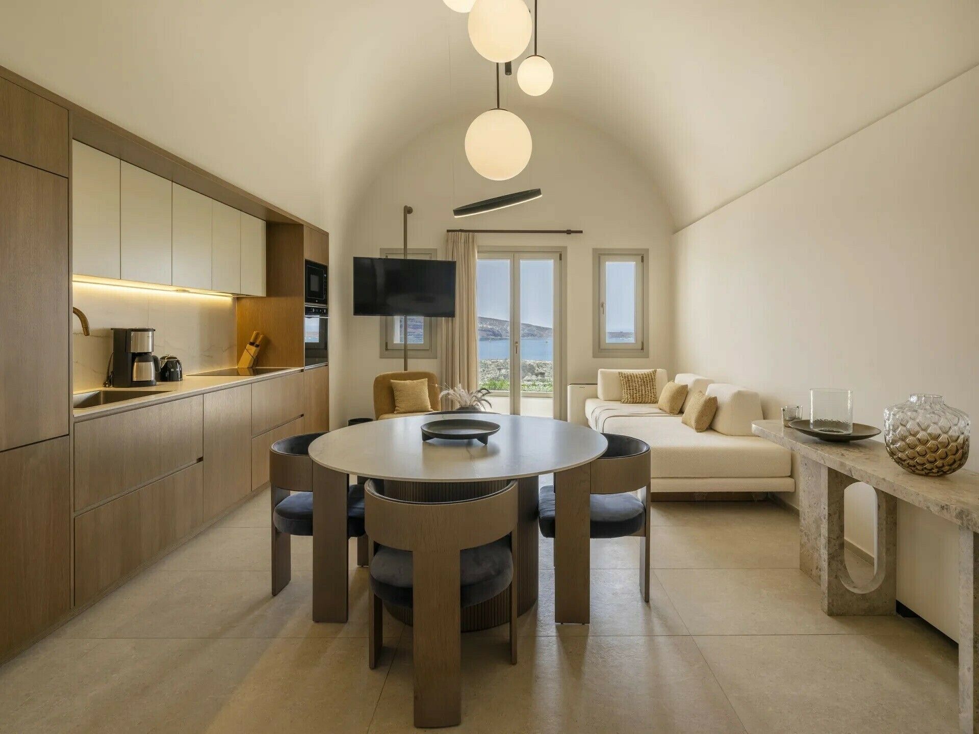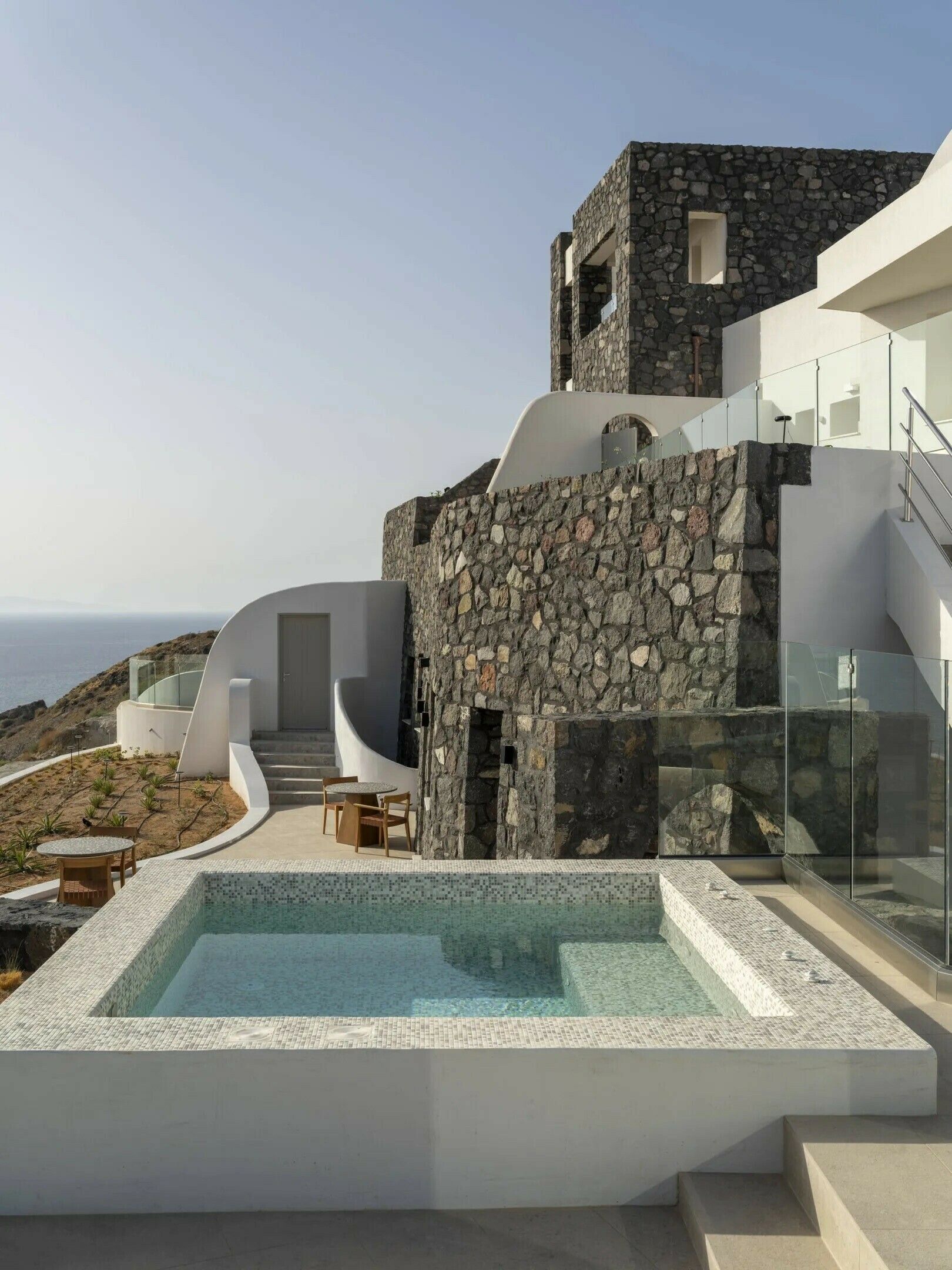 This villa boasts uninterrupted views of the Aegean Sea and Santorini’s glorious sunsets. It’s an elegant, comfortable place to stay, with all the amenities you could ask for, including a gym and sauna. Outside on the terrace, you’ll find a private pool and a Jacuzzi – you can really relax here. The shops and restaurants of Oia are less than a twenty-minute walk, and the clear waters of Paralia Katharos are mere minutes away.