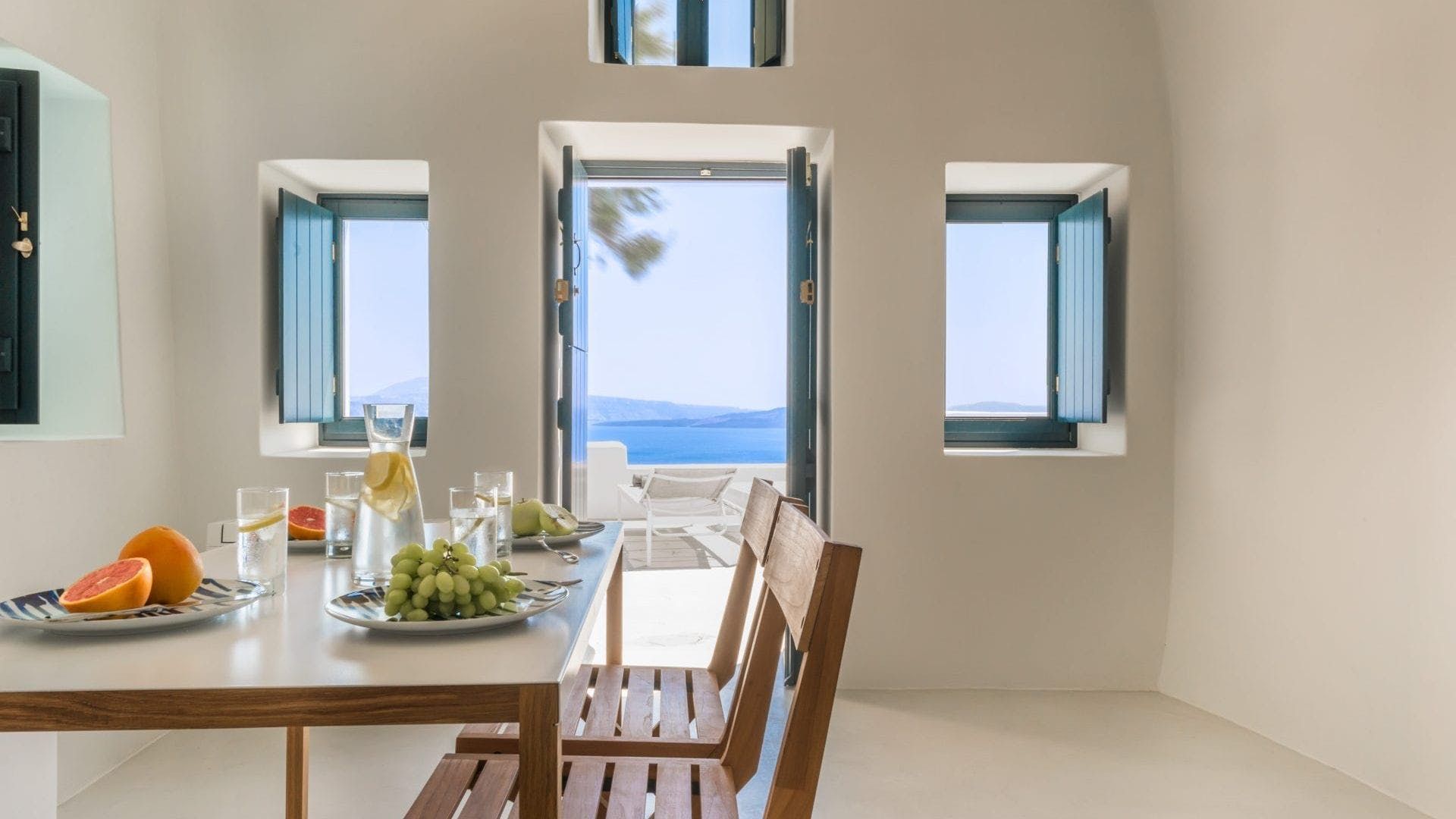 But it's the dazzling terrace that makes this home extra special. Underneath the arch, you'll find a refreshing plunge pool with whirlpool jets, perfect for late-night dips. On the veranda, you can drink in the unforgettable Santorini sunset (a bottle of wine, optional) and watch as the stars slowly come out overhead. The postcard-worthy views are downright magical – think caldera cliffs, glistening ocean and the famous castle all yours to behold – and the town is only a short walk away when you fancy restaurants, bars or a day of sightseeing.