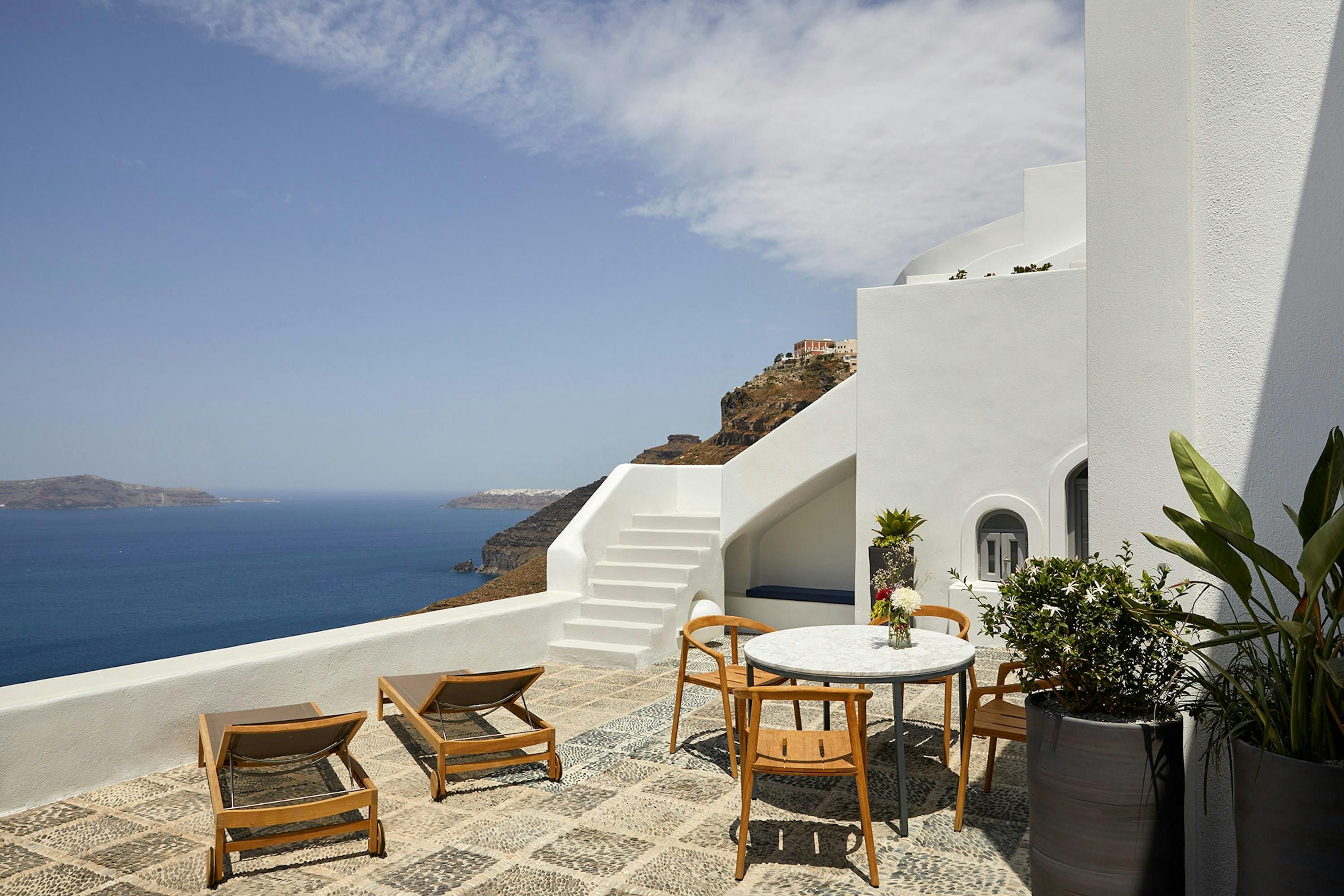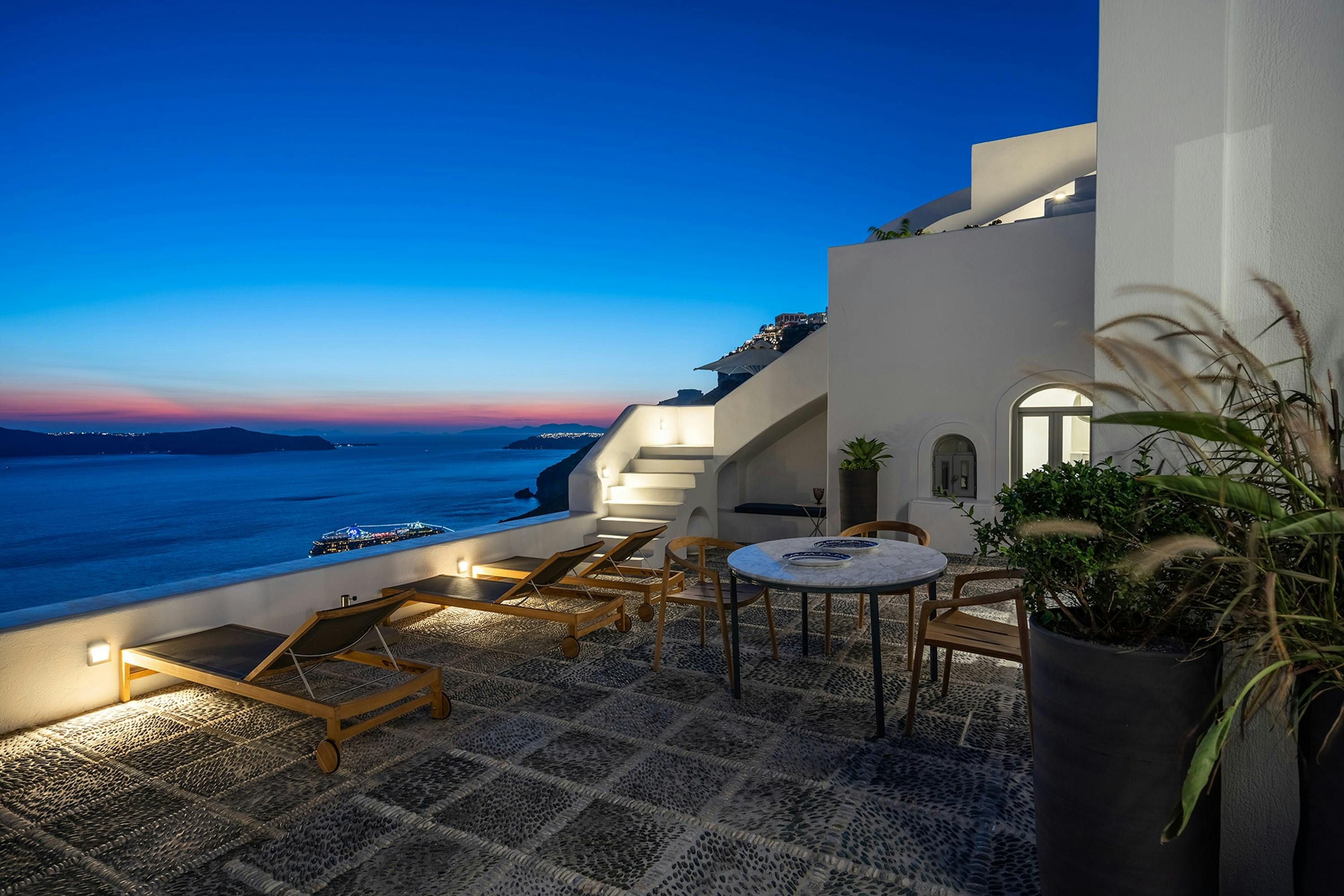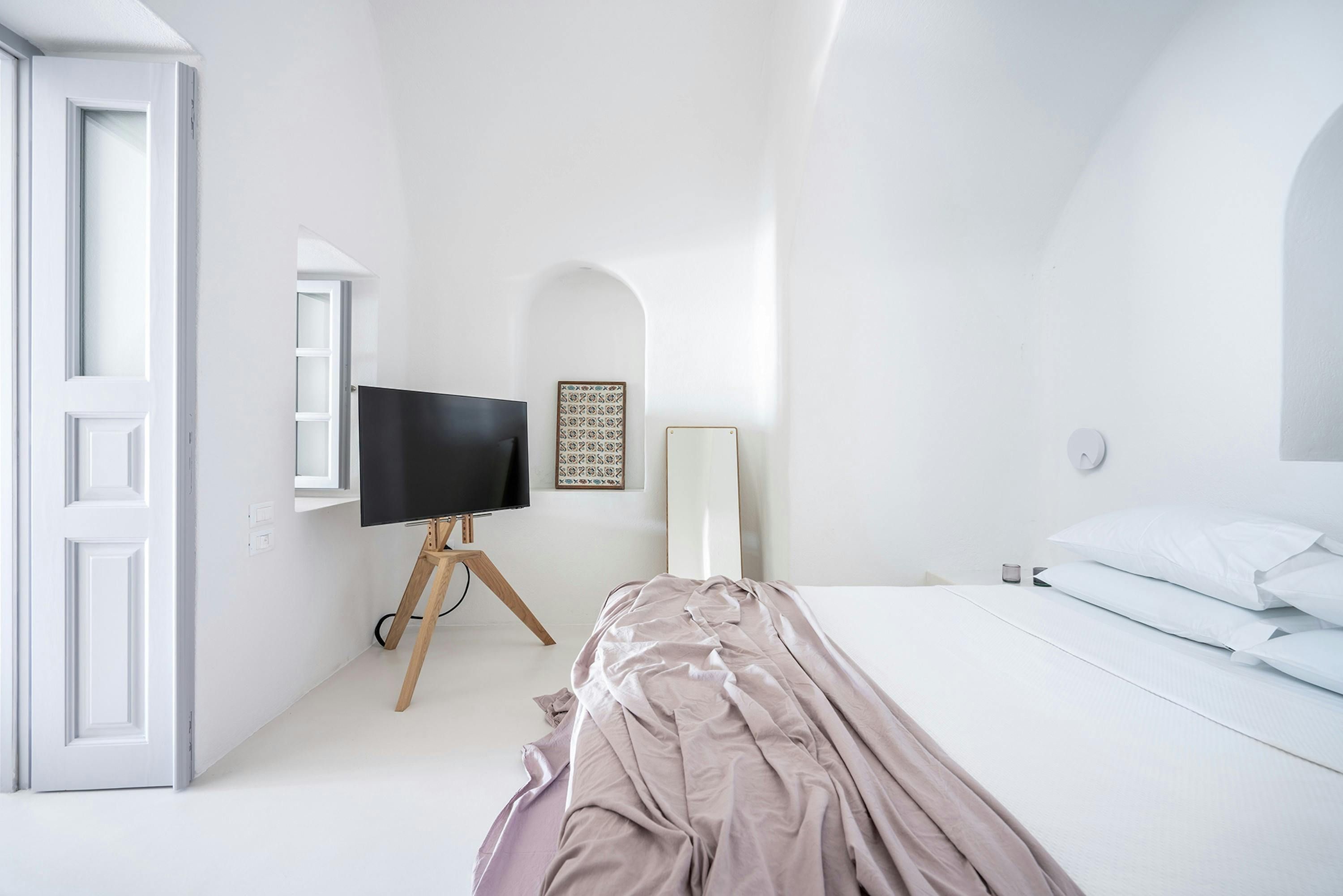 [A 1 bedroom cave house villa, with exclusive caldera and sunset views and all modern amenities.] Exuding elegance, this villa welcomes you with its modern simplicity and stunning island vistas. Awaken to the calming sounds of the sea and step onto your private terrace, where breathtaking sunsets paint the sky. The living room boasts plush couches and a flat-screen TV, while a fully fitted kitchen offers convenience at your fingertips. The bathroom provides a serene space to unwind whilst enjoying spectacular caldera views. Nestled within a private estate of 4 designer homes tumbling along the cliffside, this property offers intimacy and tranquility. Enjoy modern amenities such as air conditioning, beach towels, daily maid service, and Wi-Fi. Immerse yourself in the essence of Santorini at Caldera Serenity.