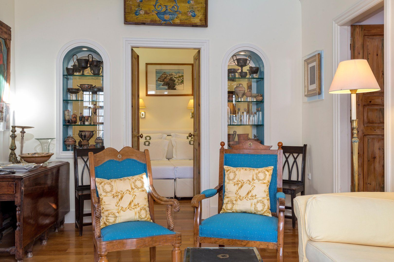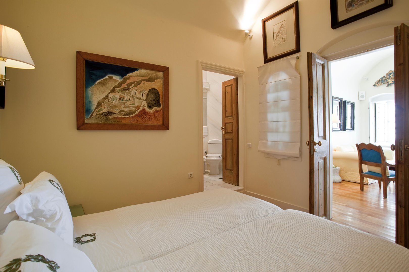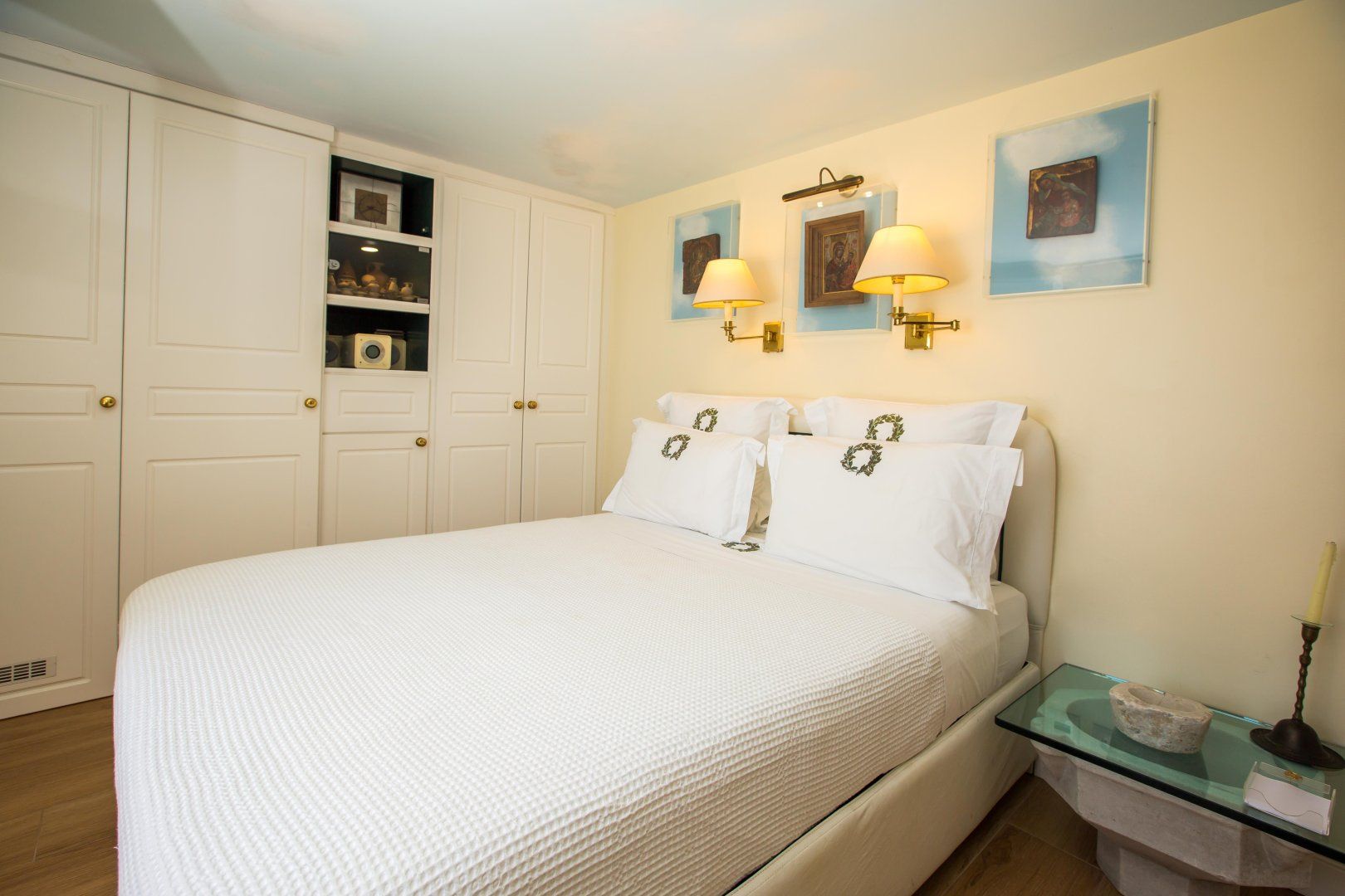 The interior is just as special, with a blend of modern comfort and antique touches. The history of the island is represented in the art you can find dotted around the home, and the sea sparkles through the windows that keep the interior so bright and airy.