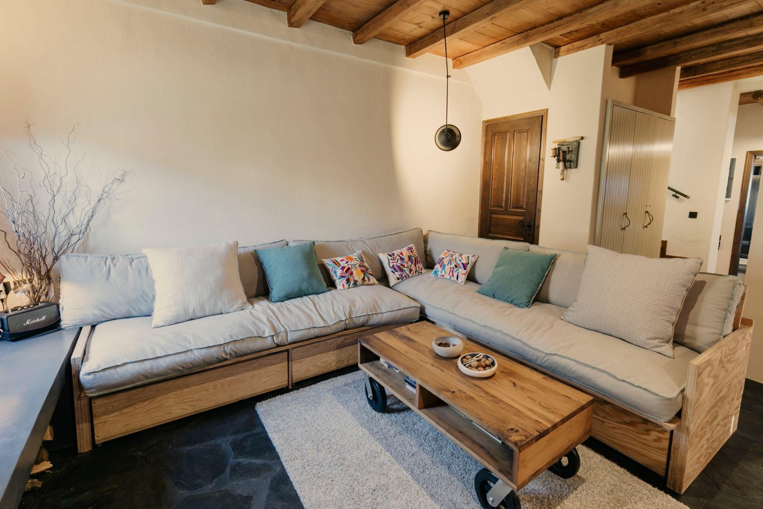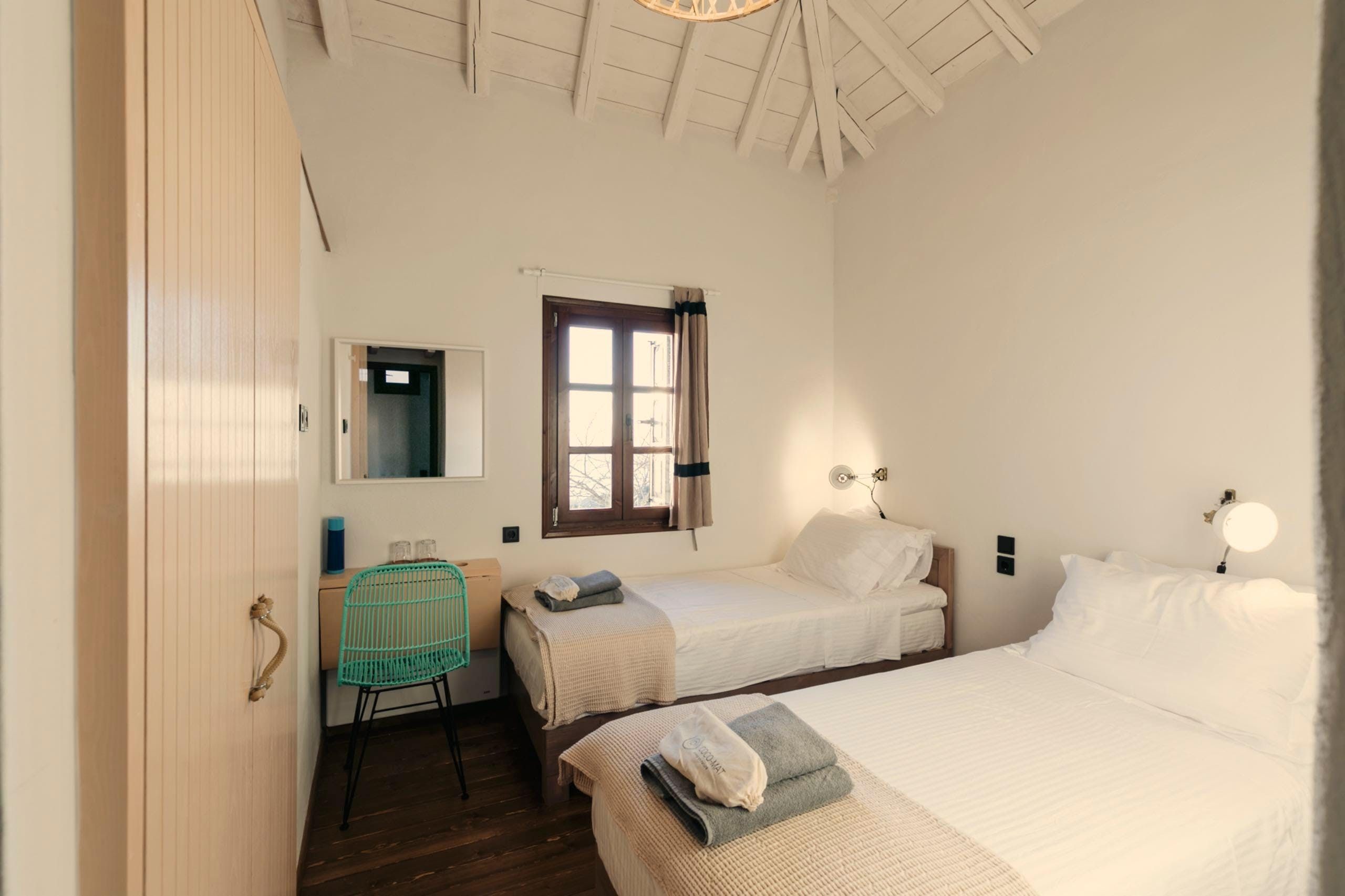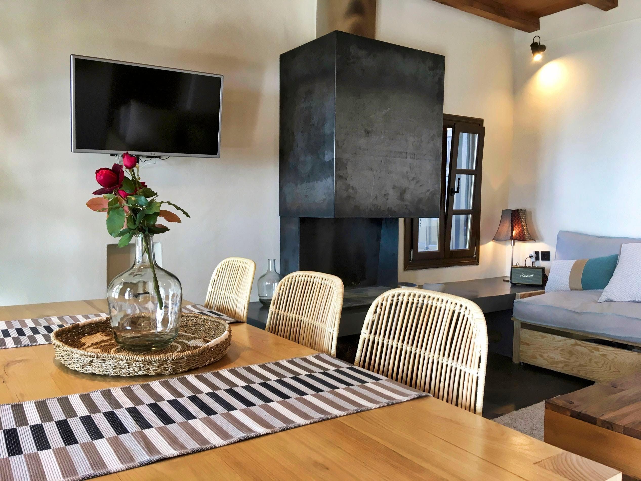 On the ground floor, you'll immediately notice the high-end touch that's been given to the traditional space – from the modern fireplace to the wood-framed sofa, basket chairs and stylish decor. It's the ideal spot to flop down with a good book or a cup of Greek coffee. Upstairs, there are three comfortable bedrooms with original wood-beamed ceilings and even space for working from home. Combining natural materials with contemporary interiors, we think it's a lovely villa to call home for a while.