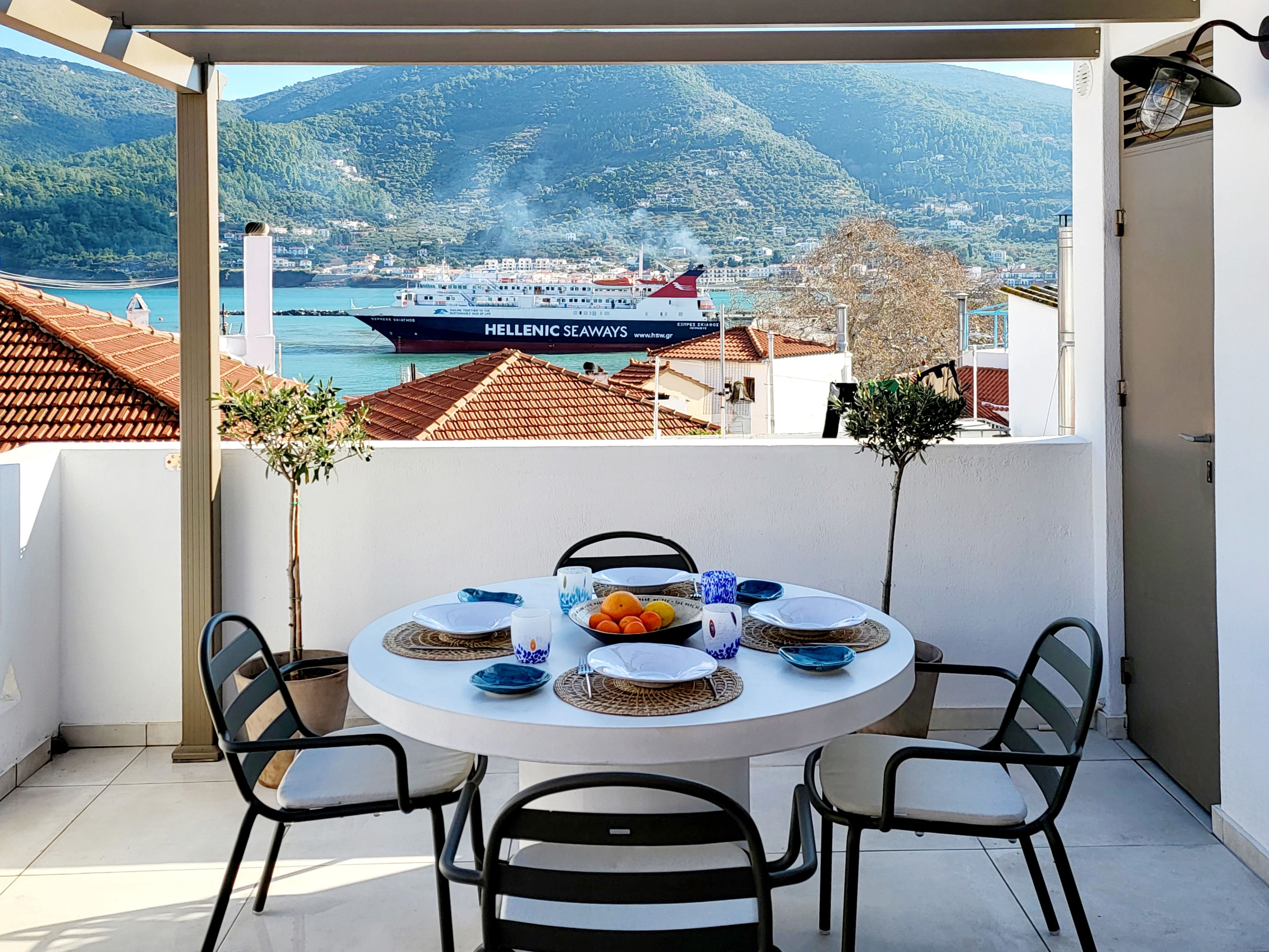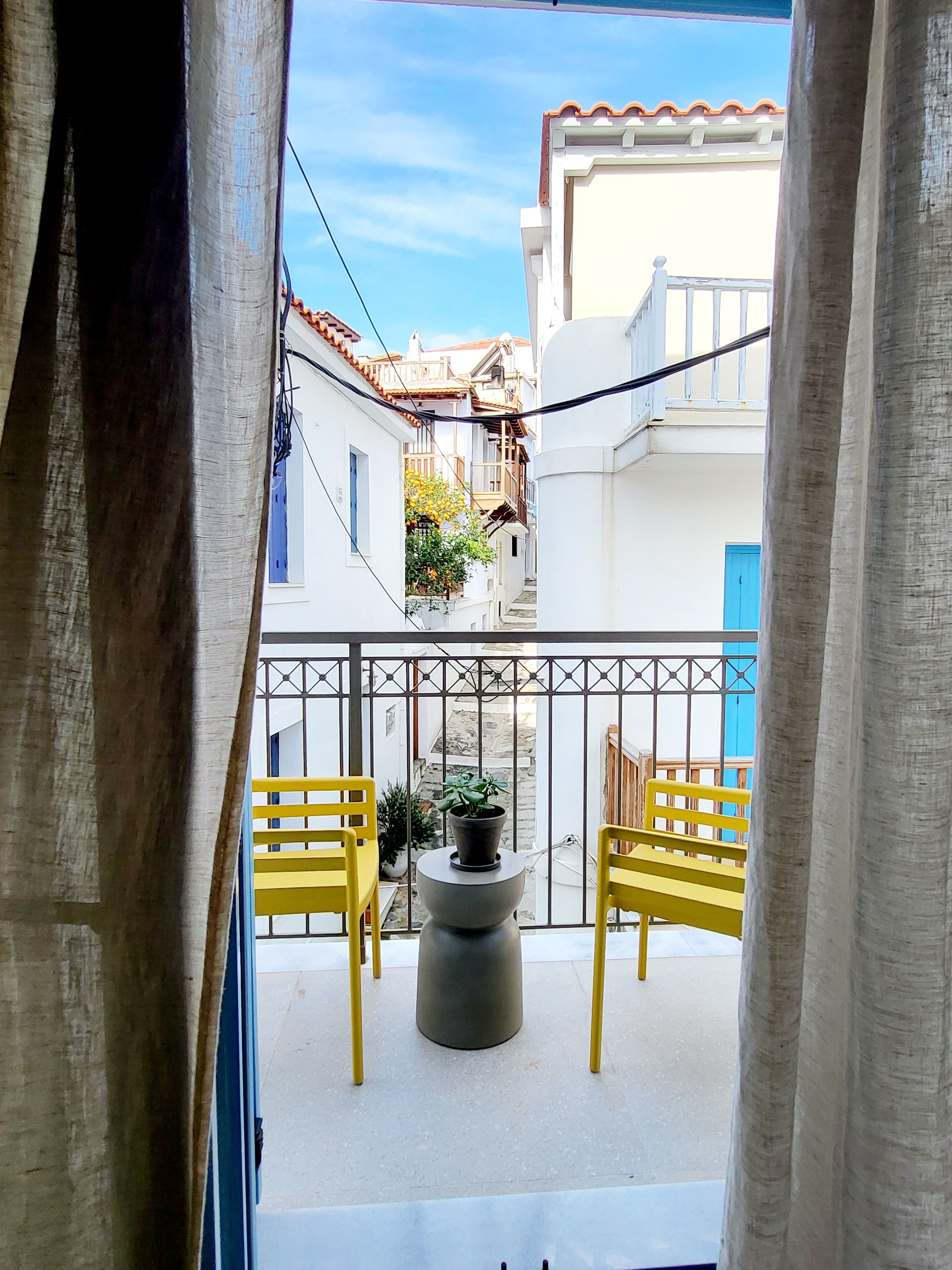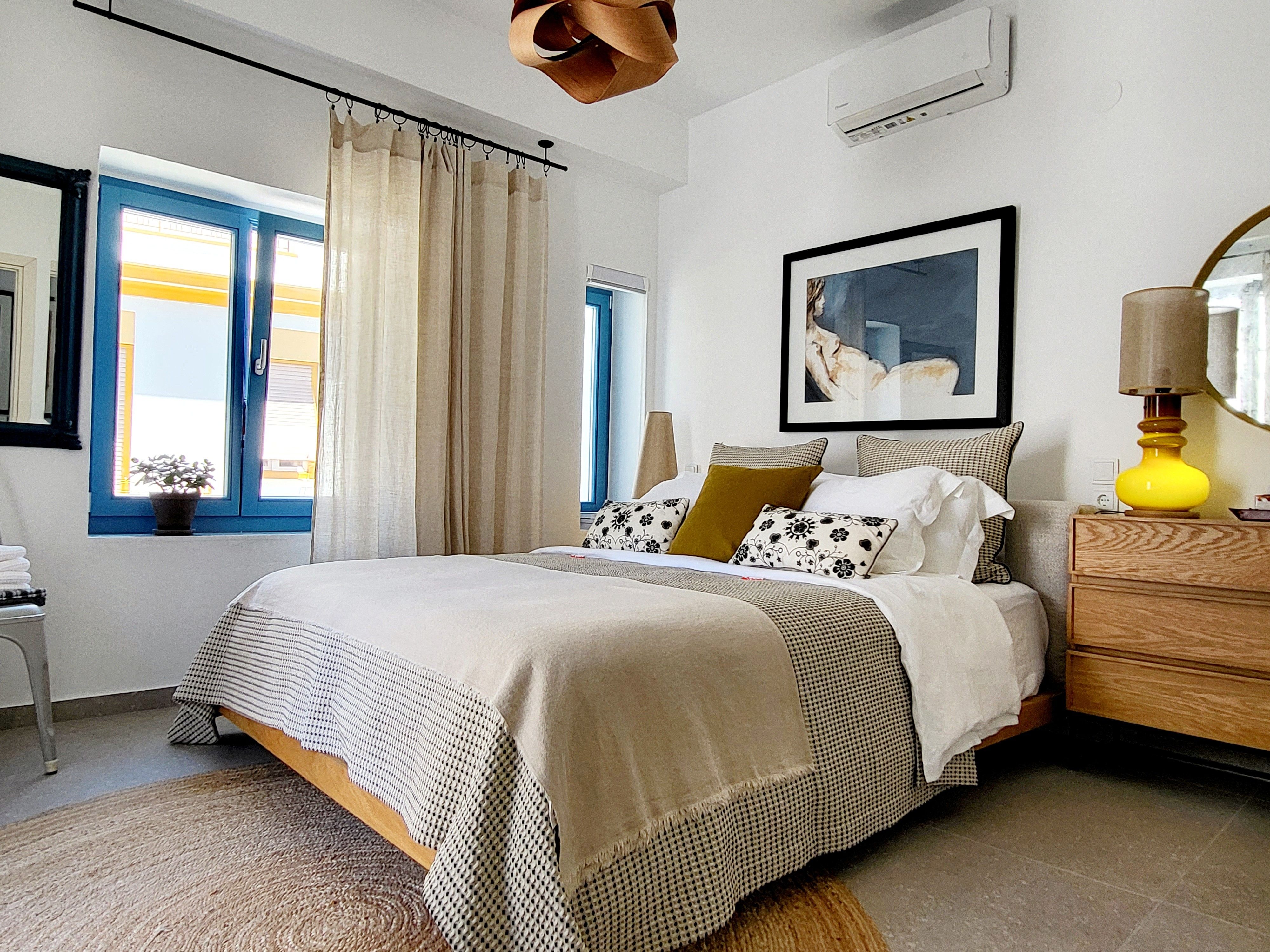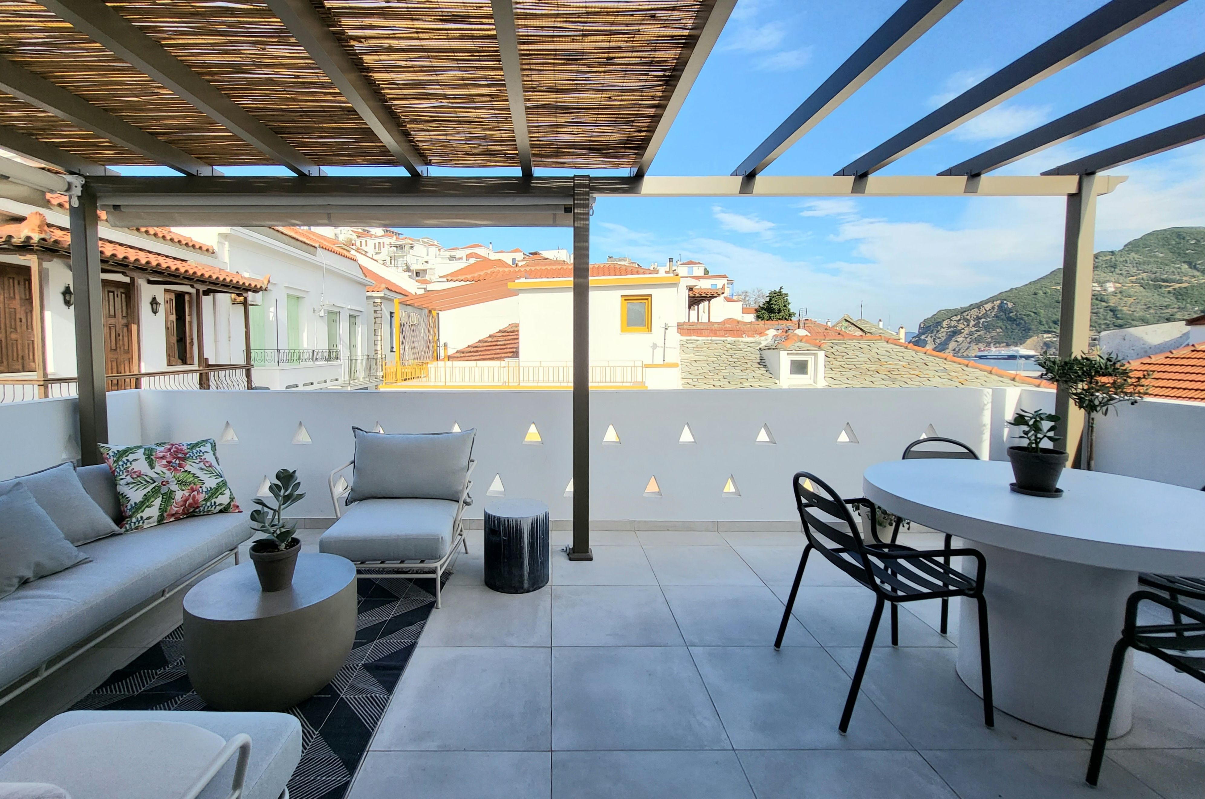 Situated in the heart of Skopelos Town, this multi-level home has panoramic views of Mount Palouki, the port and the island of Alonnissos from its spacious roof terrace. There’s also a balcony off the main bedroom with an orange tree and a bistro table overlooking a square. Inside this beautifully curated home, there’s a modern kitchen for cooking some Greek cuisine. But if you prefer to eat out, the meandering alleys around this house are dotted with restaurants and cafés, as well as bars, bakeries and shops.