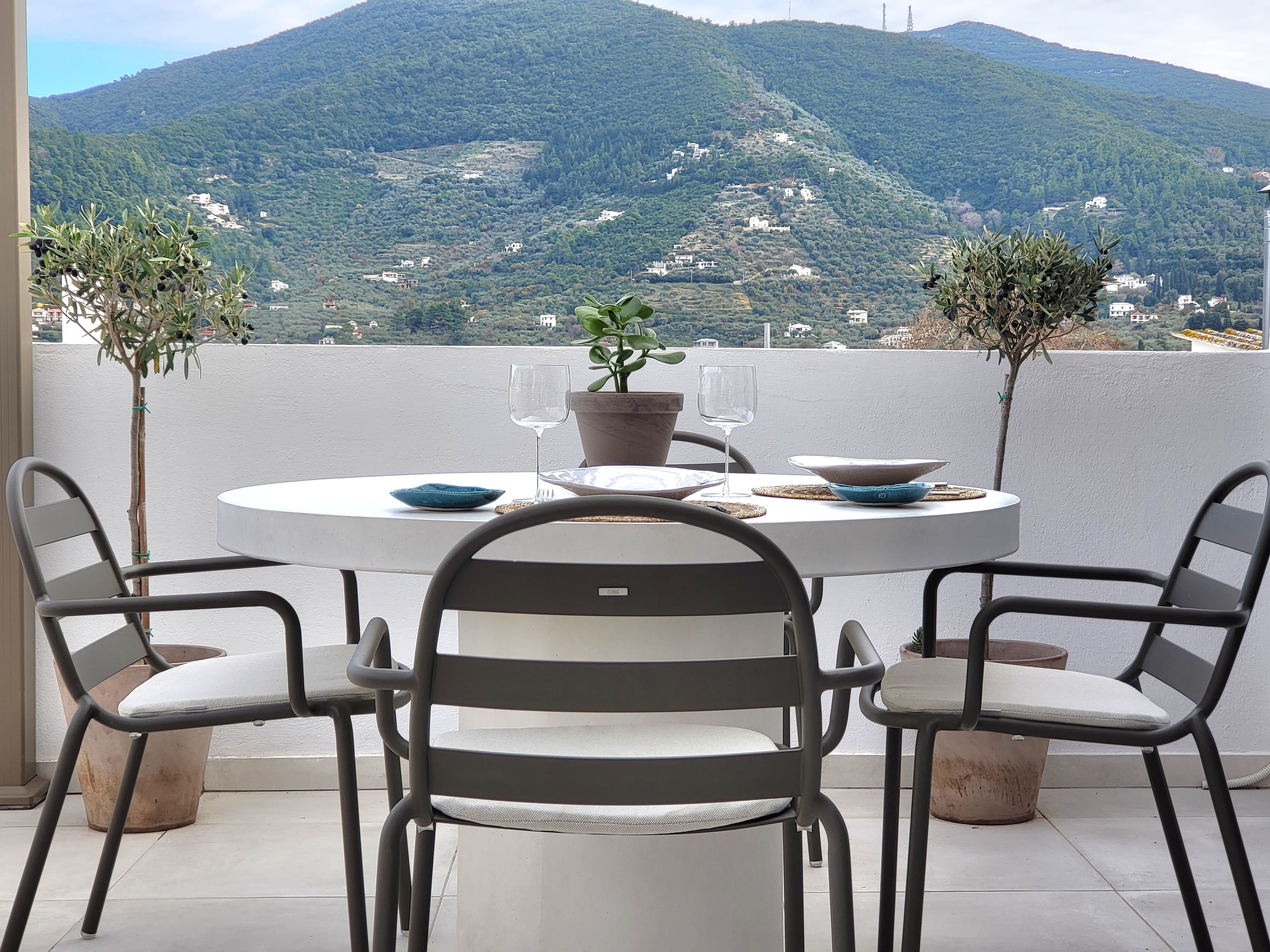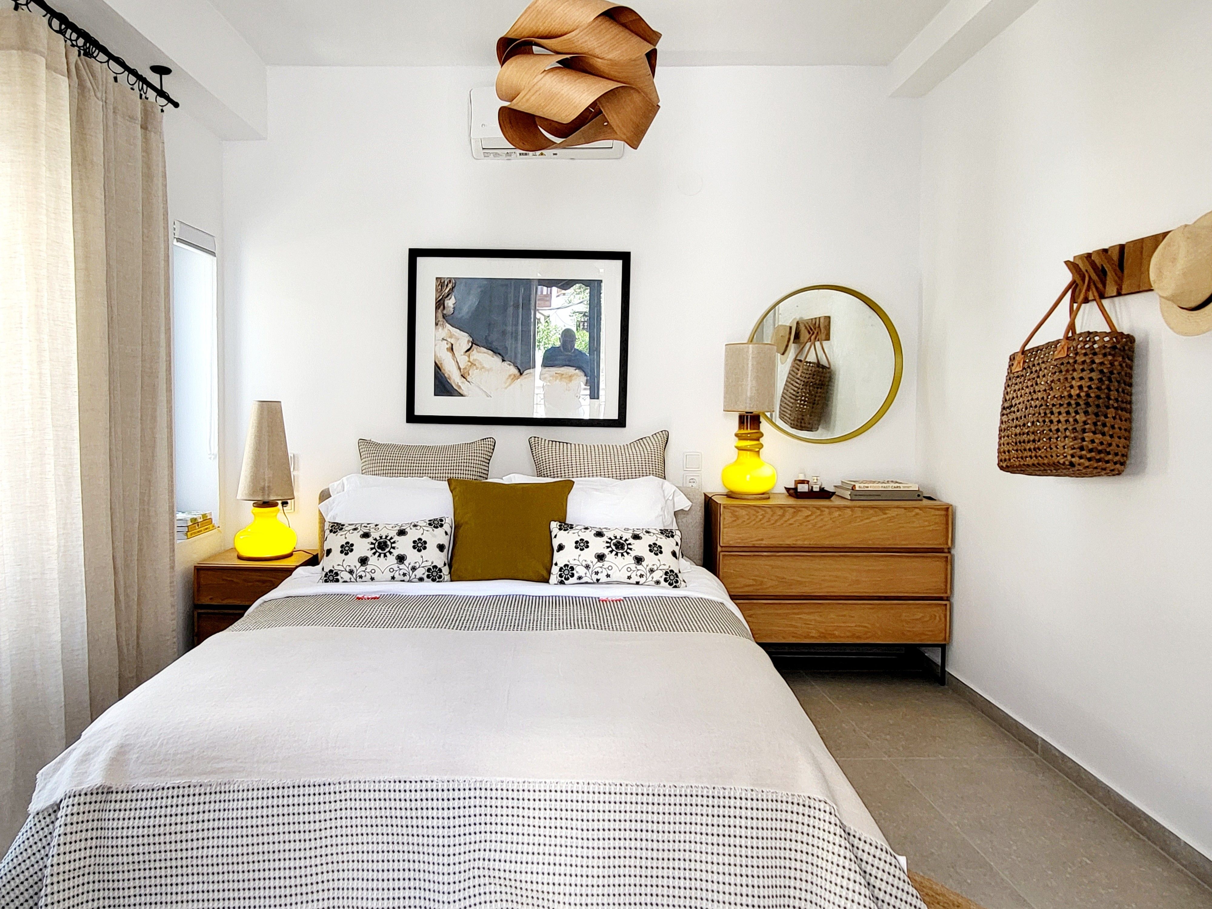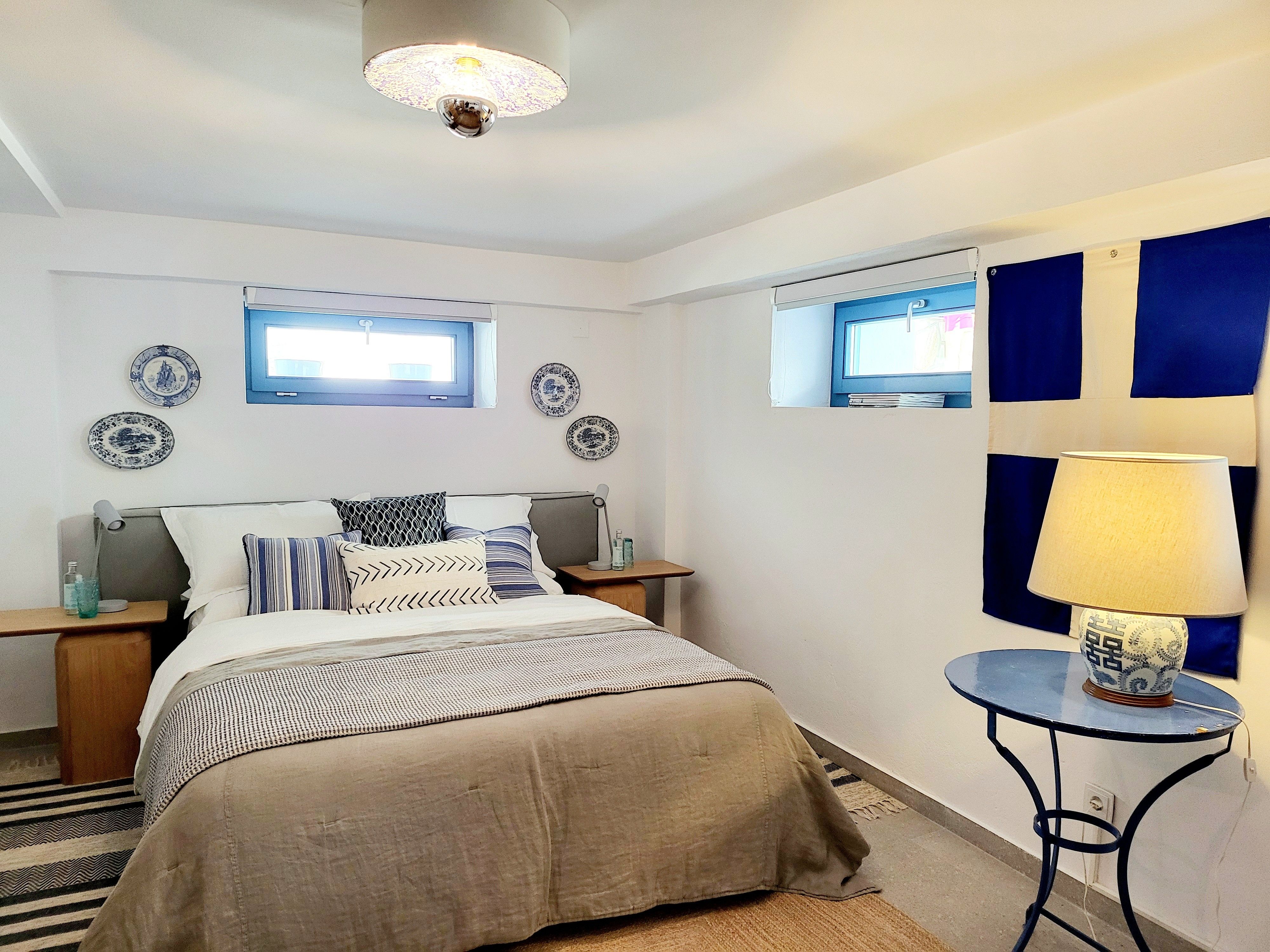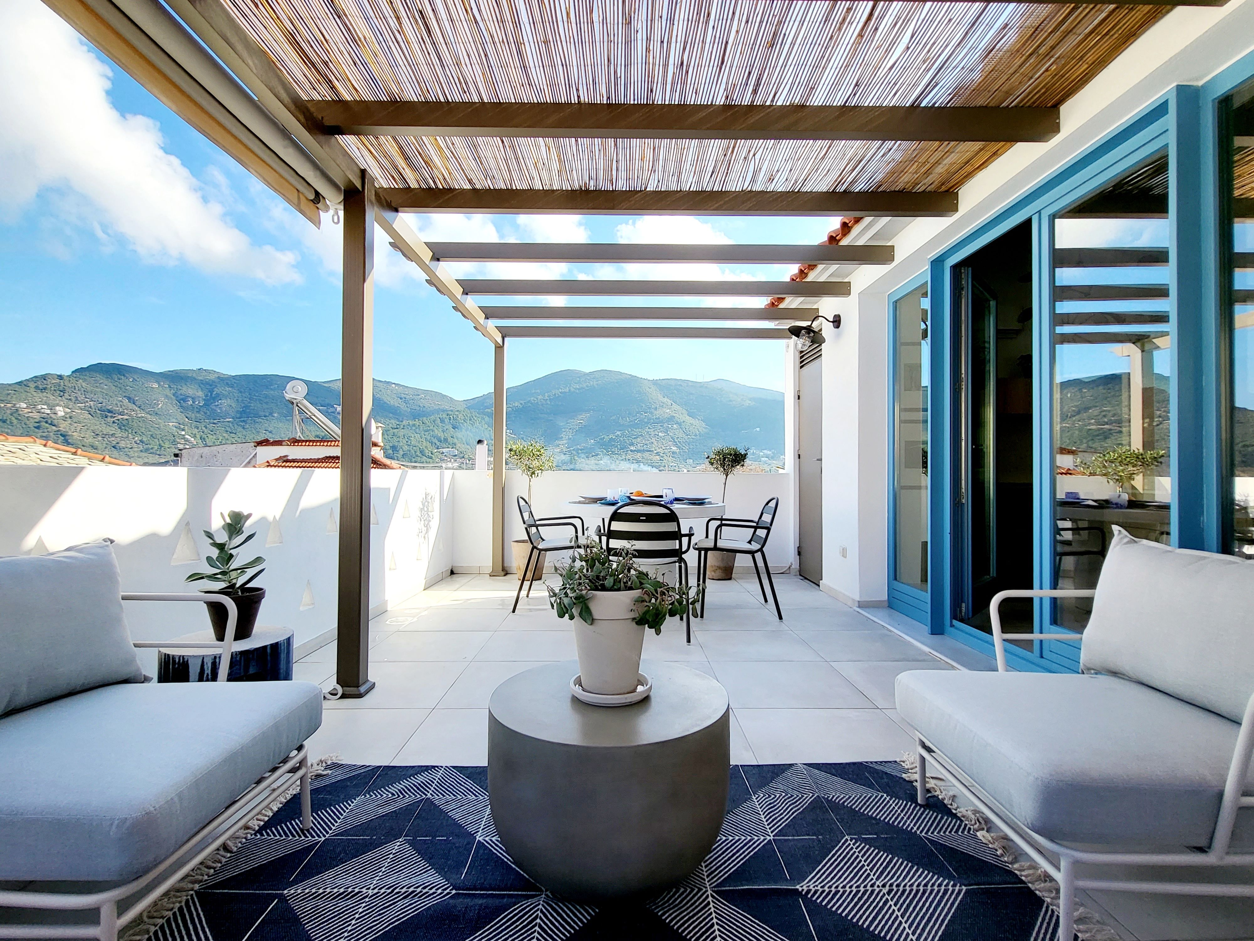 Situated in the heart of Skopelos Town, this multi-level home has panoramic views of Mount Palouki, the port and the island of Alonnissos from its spacious roof terrace. There’s also a balcony off the main bedroom with an orange tree and a bistro table overlooking a square. Inside this beautifully curated home, there’s a modern kitchen for cooking some Greek cuisine. But if you prefer to eat out, the meandering alleys around this house are dotted with restaurants and cafés, as well as bars, bakeries and shops.