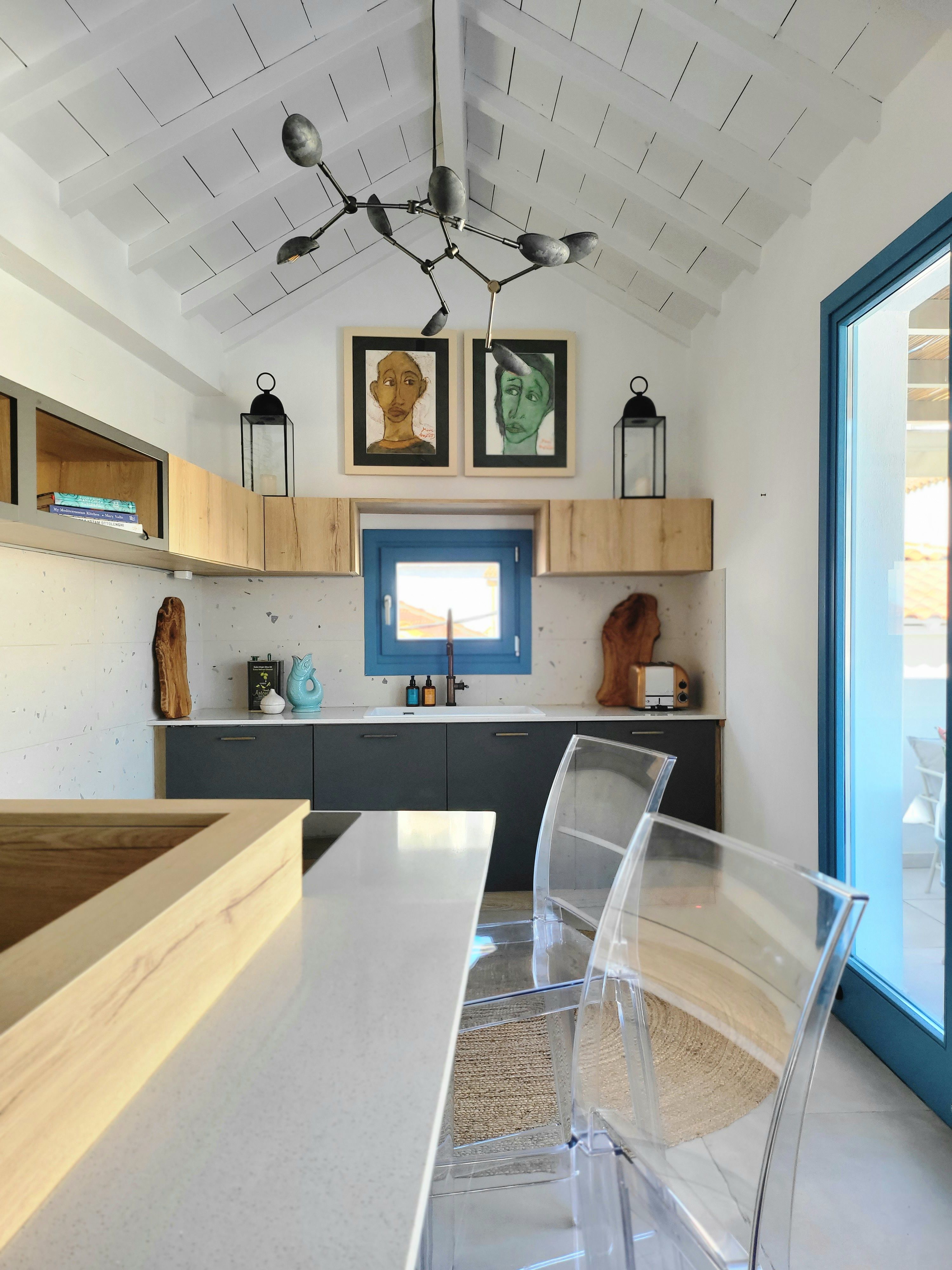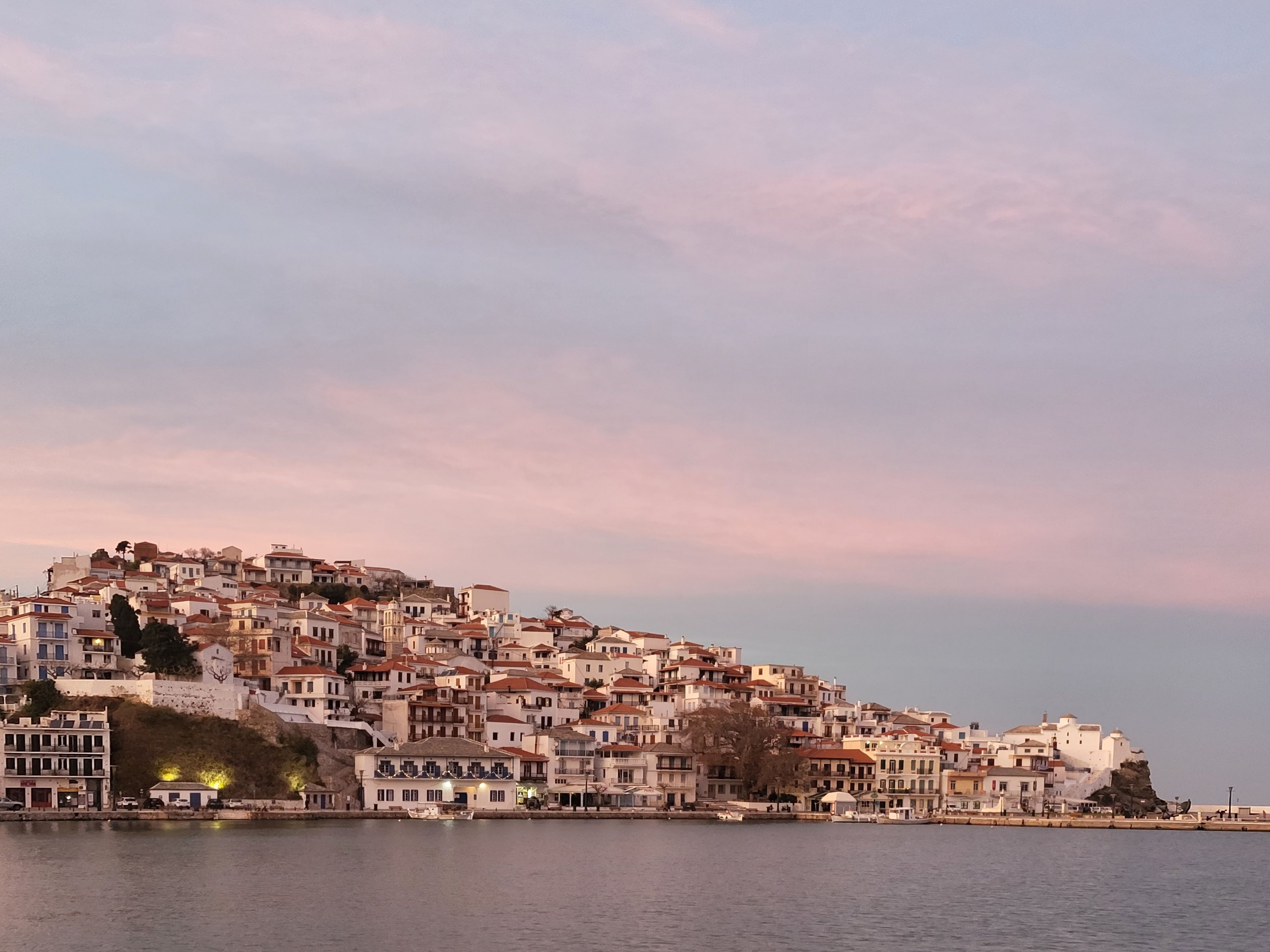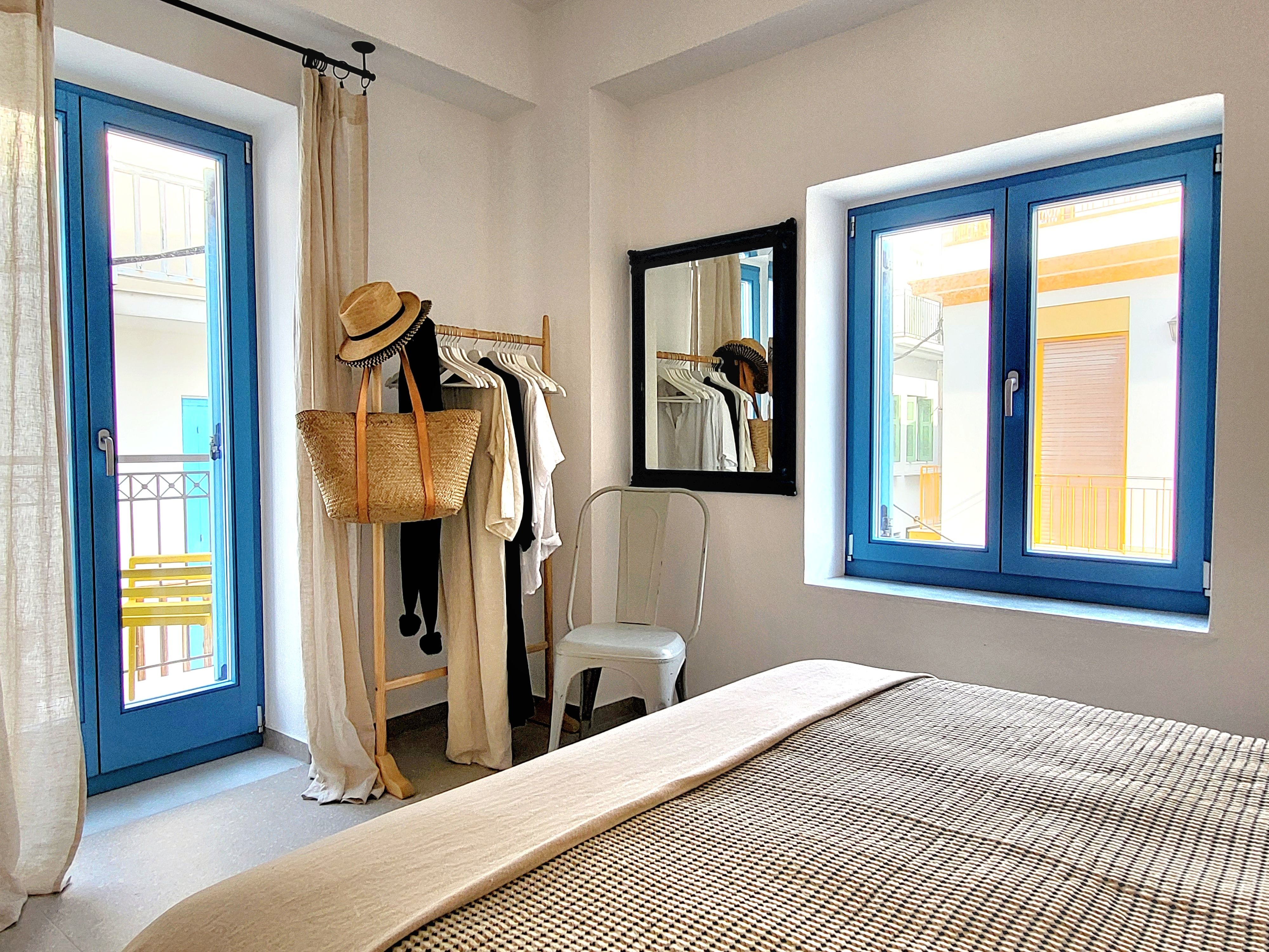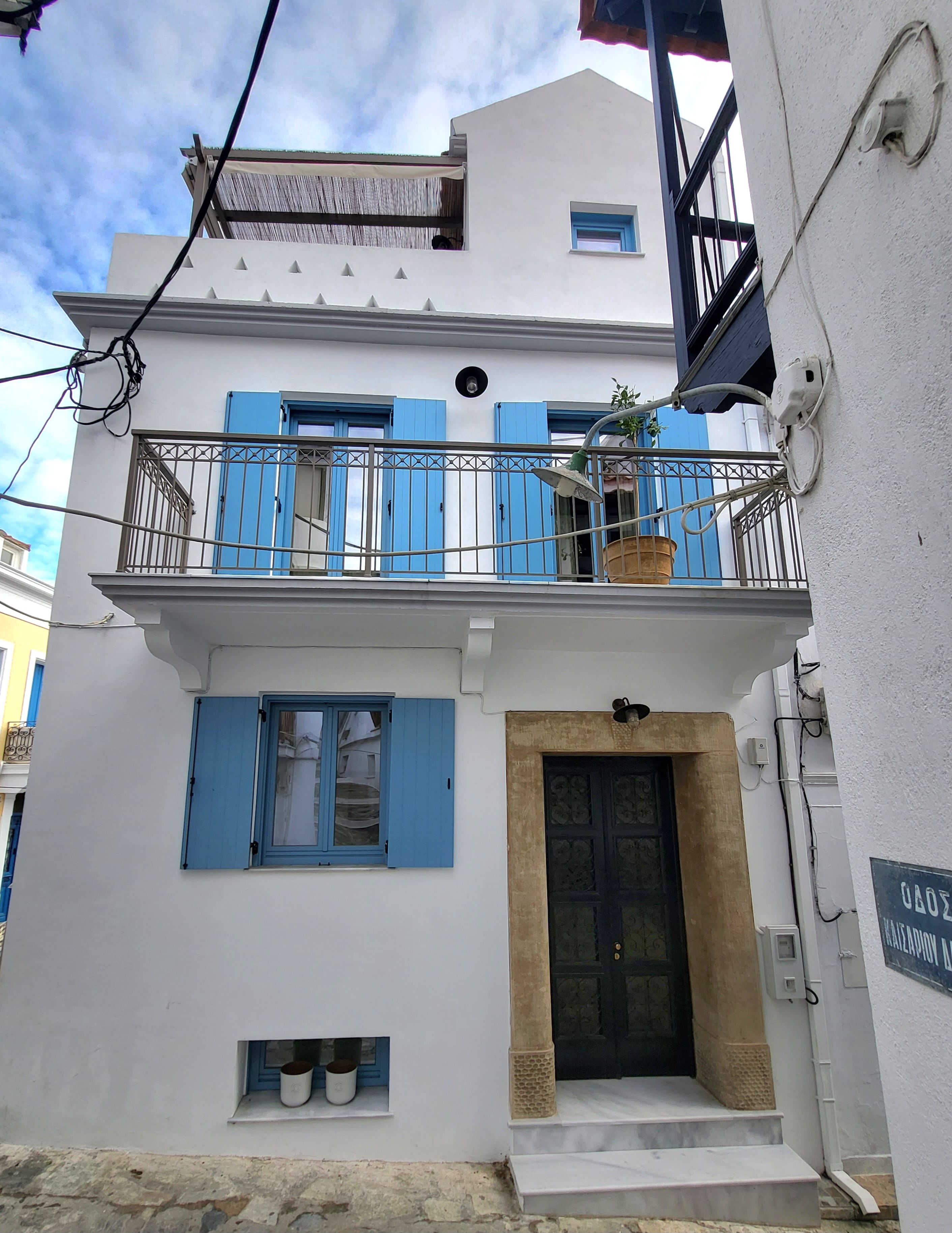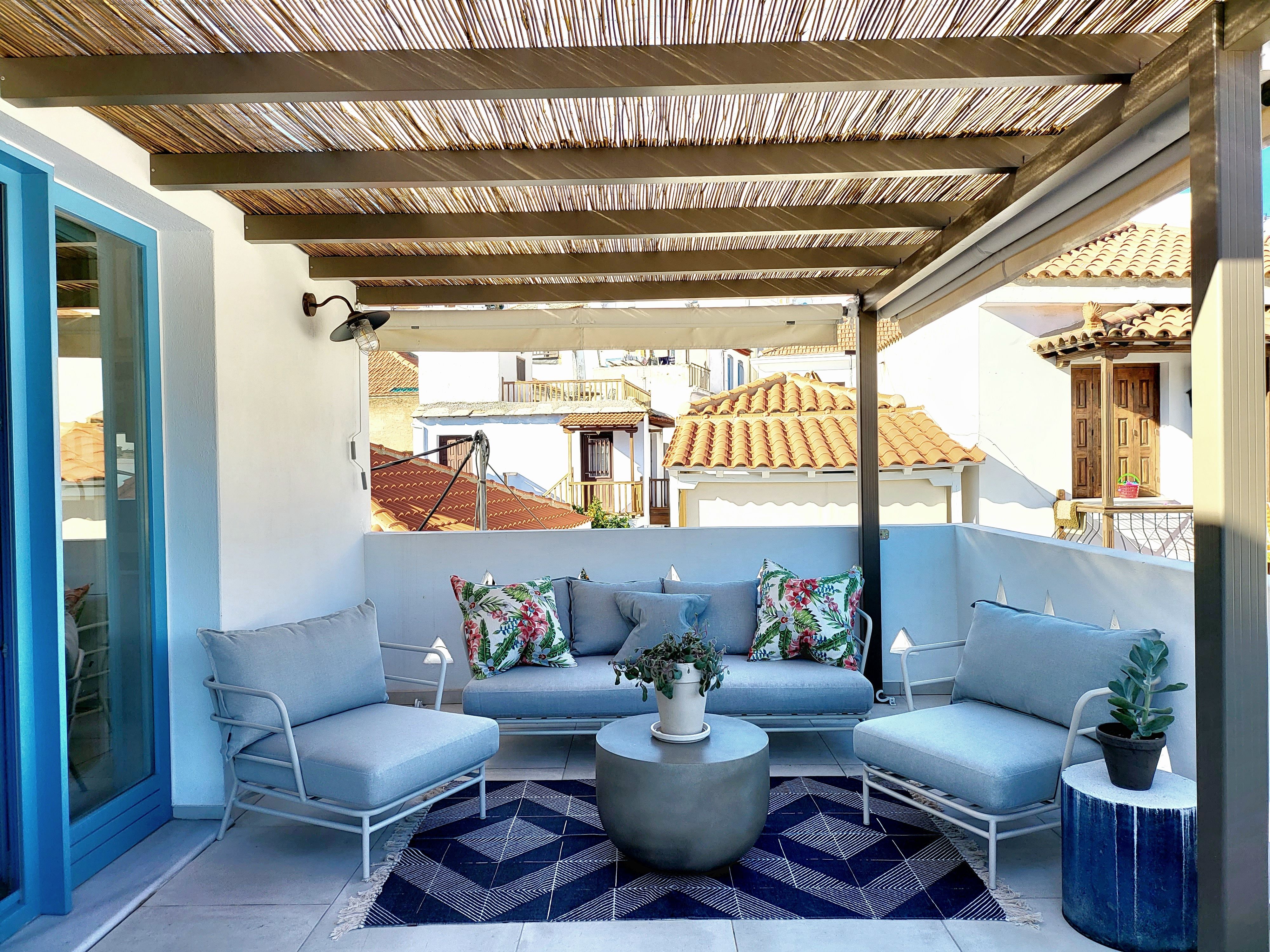 Situated in the heart of Skopelos Town, this multi-level home has panoramic views of Mount Palouki, the port and the island of Alonnissos from its spacious roof terrace. There’s also a balcony off the main bedroom with an orange tree and a bistro table overlooking a square. Inside this beautifully curated home, there’s a modern kitchen for cooking some Greek cuisine. But if you prefer to eat out, the meandering alleys around this house are dotted with restaurants and cafés, as well as bars, bakeries and shops.