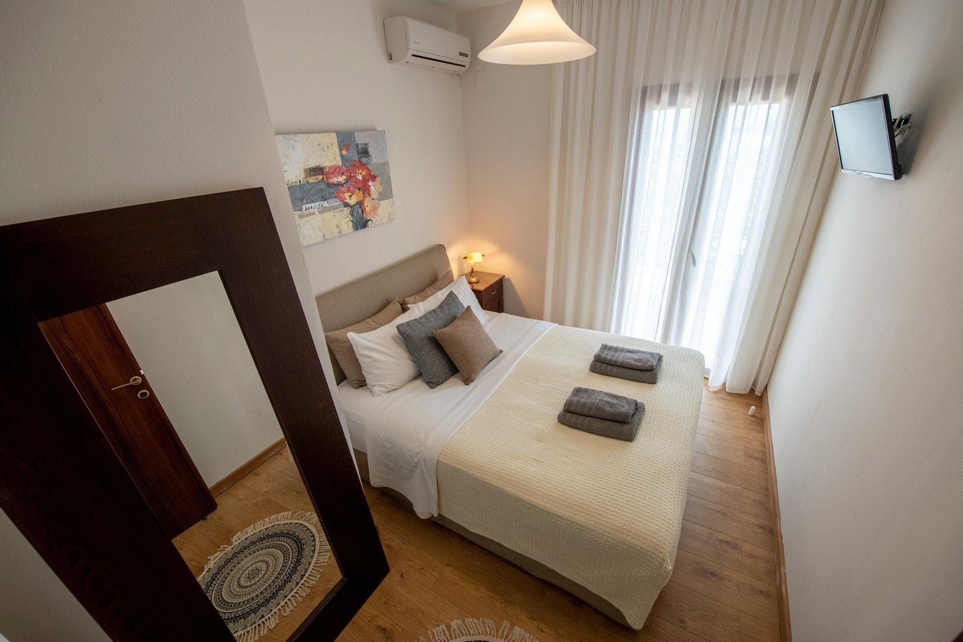 Experience luxury living at Villa Kallisto in Vasilias, Skiathos. This stunning two-storey villa features two bedrooms, two bathrooms, a spacious lounge, and a fully equipped modern kitchen. The top floor boasts two separate bedrooms with queen-sized double beds, a fully loaded bathroom, and a sea-facing balcony with breathtaking sea views. Downstairs, the lounge is furnished with comfortable sofas that can be converted into one double and one single bed, accommodating up to five adults and two children. A luxurious bathroom with a tub is also available.