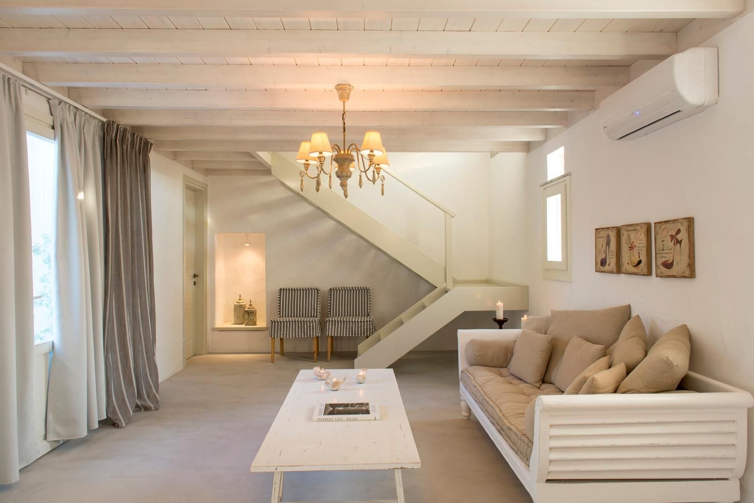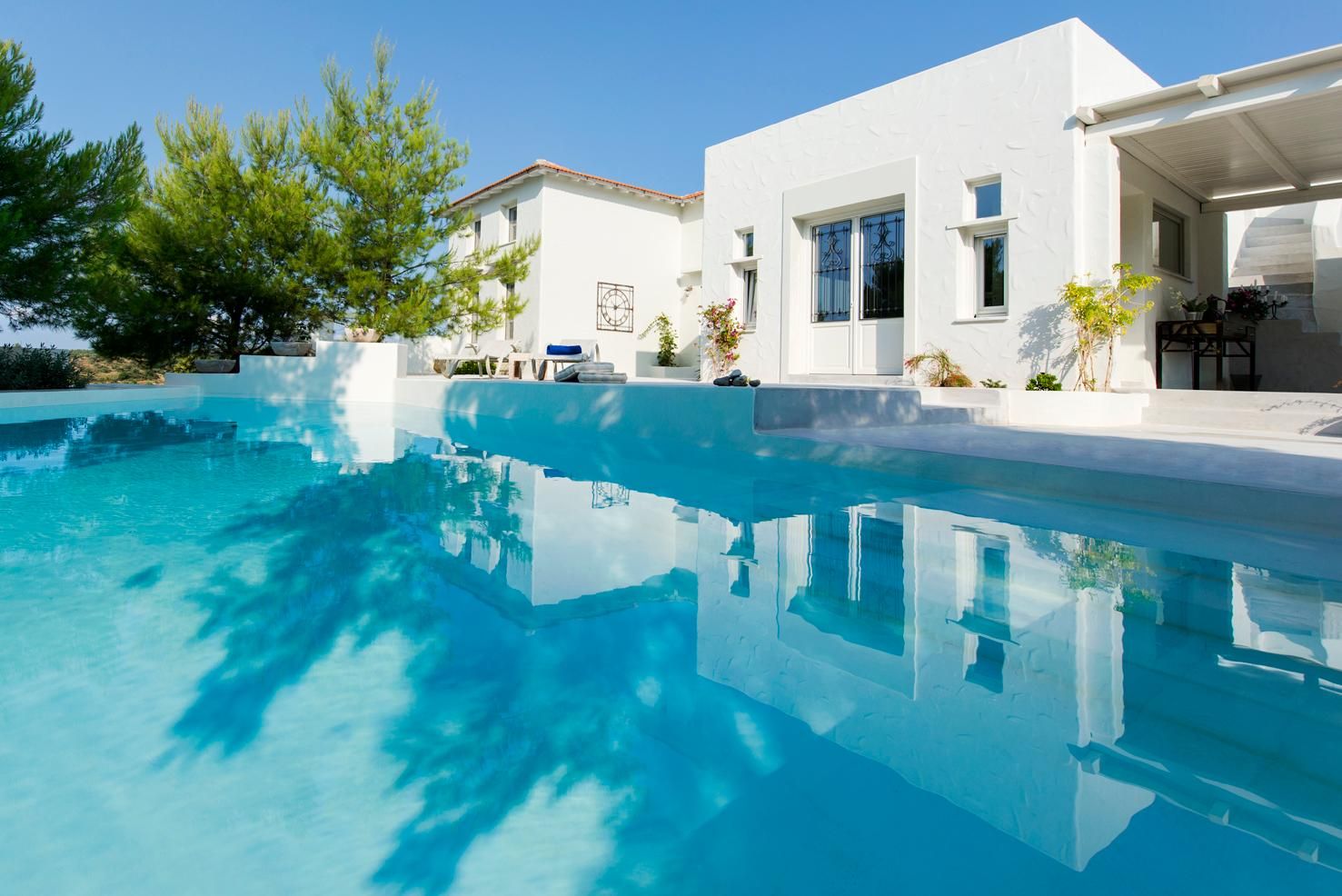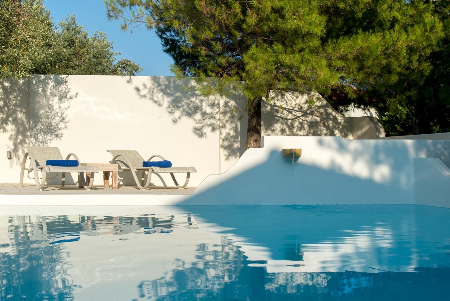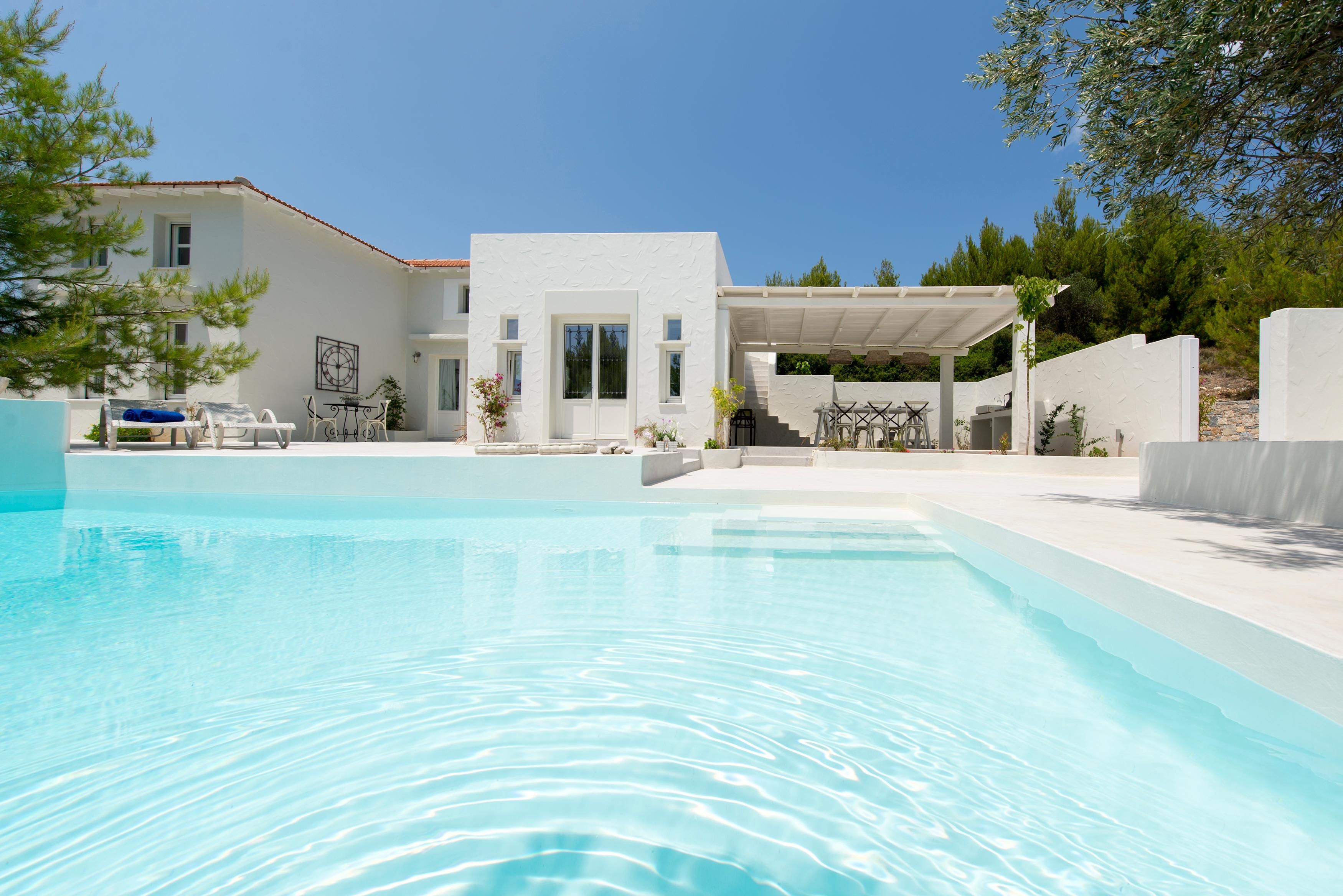 Isolated from urban areas, this home really plays into the charming serenity of its surroundings. Set over two floors, this bright white villa looks traditional from the outside. Sandwiched between blue skies above and the blue waters of your private freshwater pool below, the exterior colour scheme might remind you of a certain national flag. This Greek theme continues with olive trees and a welcome basket full of local wine and fresh fruits. Pour a glass to sip as you explore the grounds, passing below the shaded dining terrace and into the minimalist interiors.