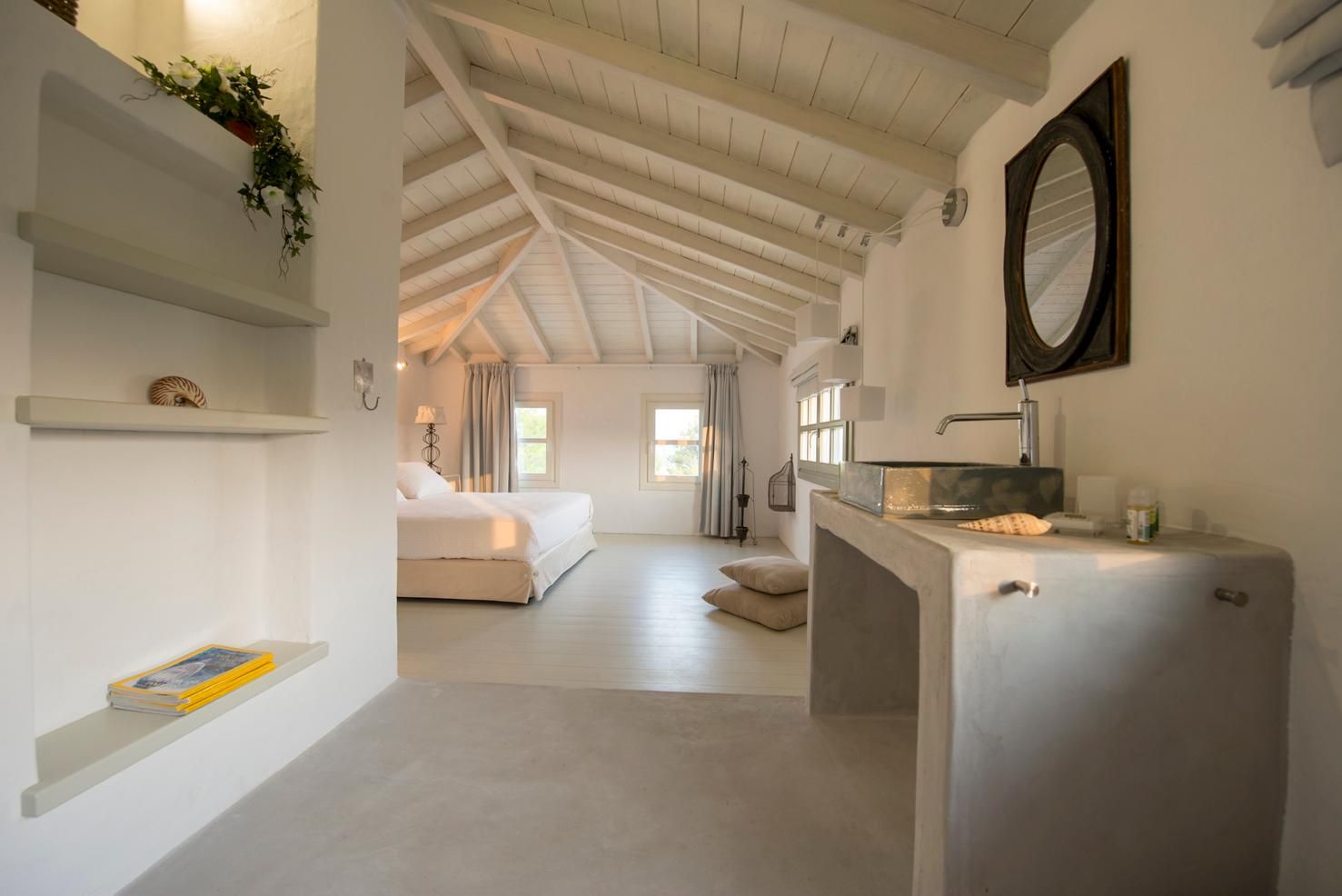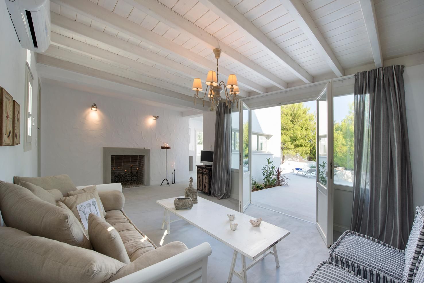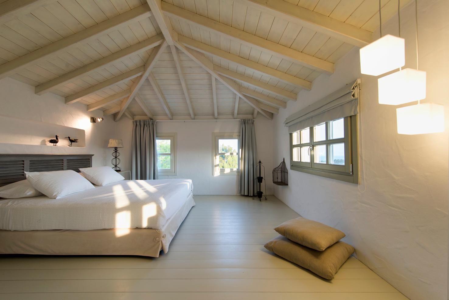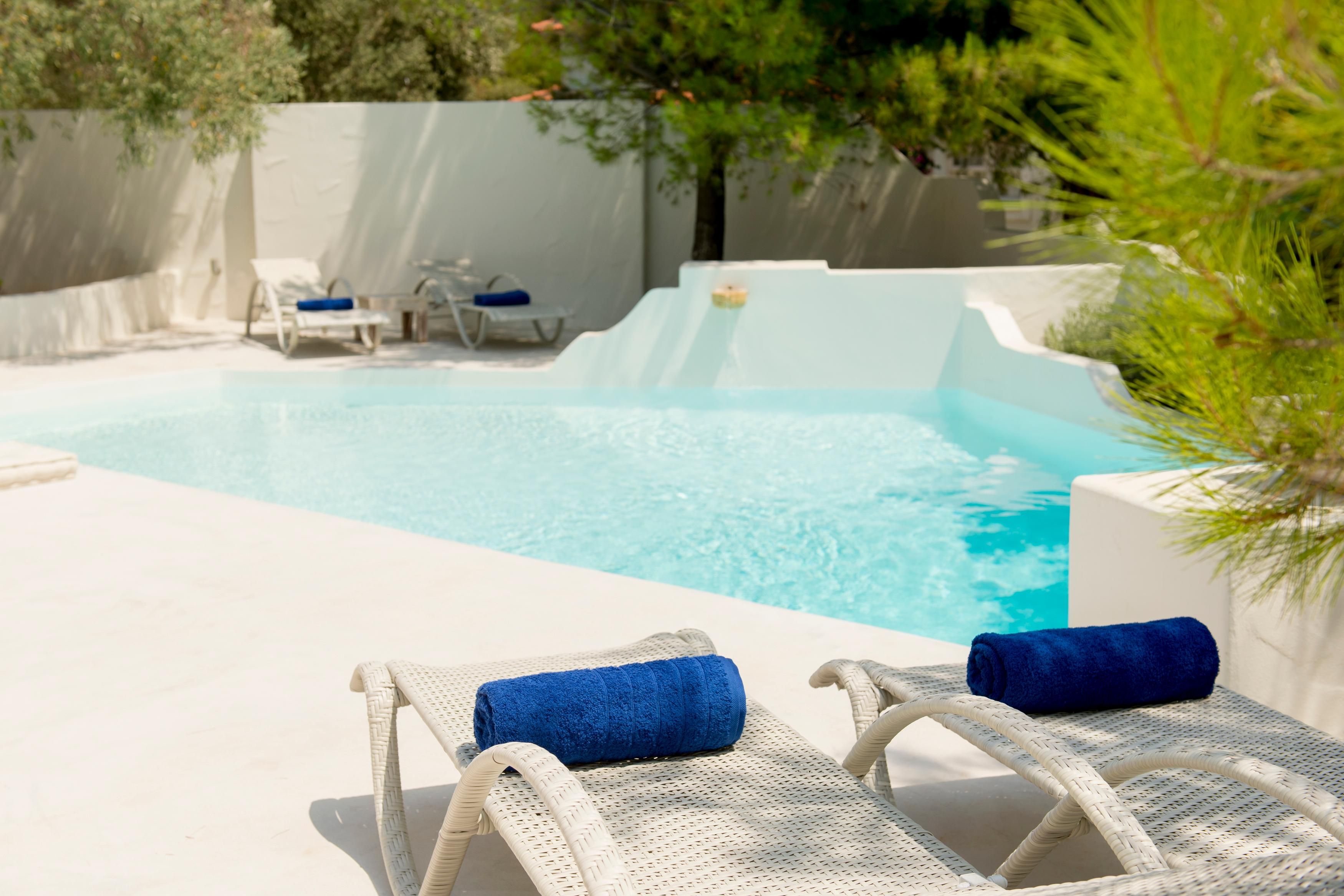 Isolated from urban areas, this home really plays into the charming serenity of its surroundings. Set over two floors, this bright white villa looks traditional from the outside. Sandwiched between blue skies above and the blue waters of your private freshwater pool below, the exterior colour scheme might remind you of a certain national flag. This Greek theme continues with olive trees and a welcome basket full of local wine and fresh fruits. Pour a glass to sip as you explore the grounds, passing below the shaded dining terrace and into the minimalist interiors.