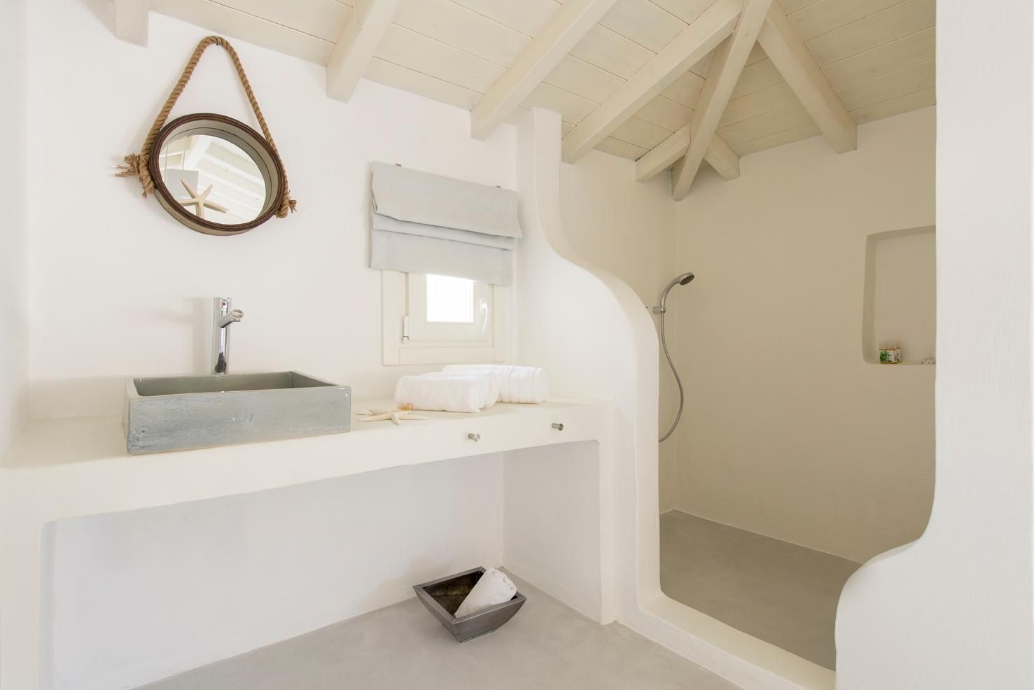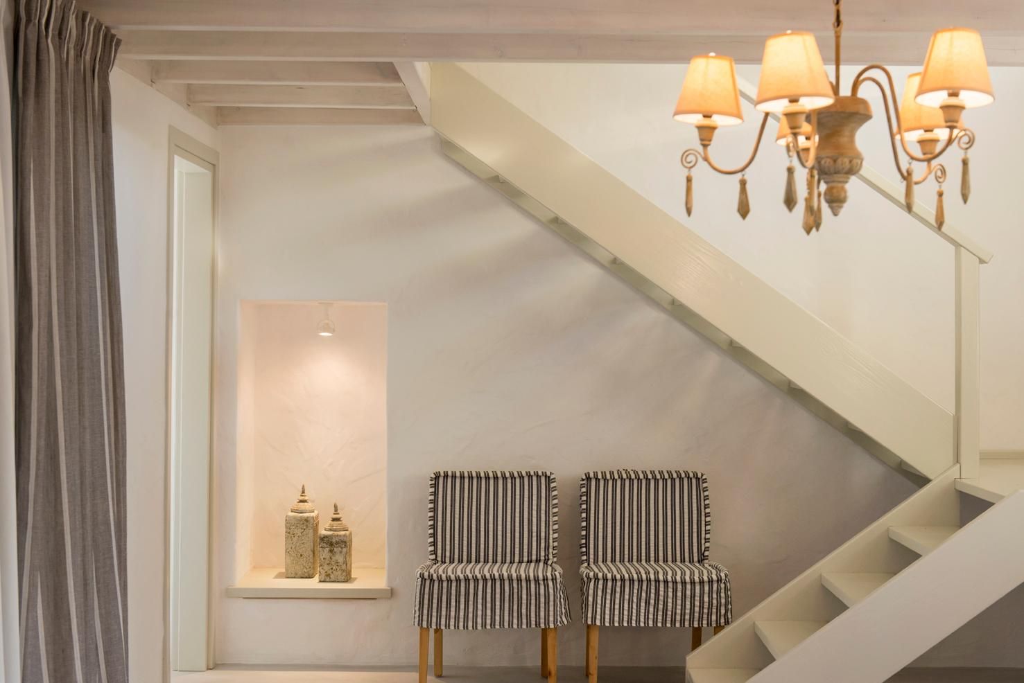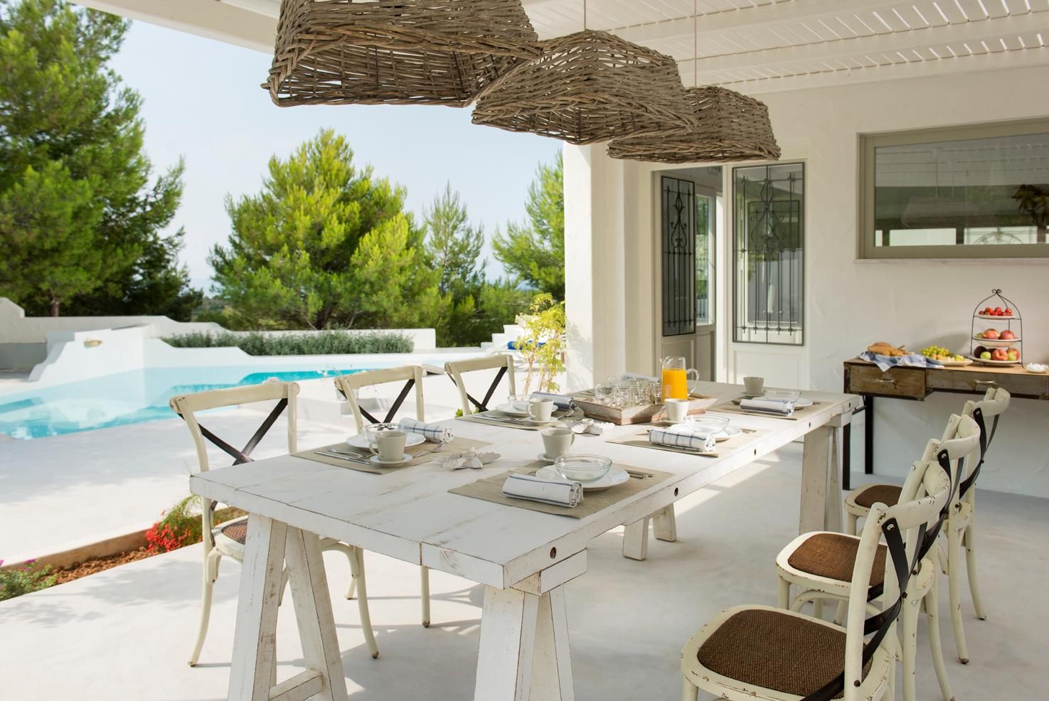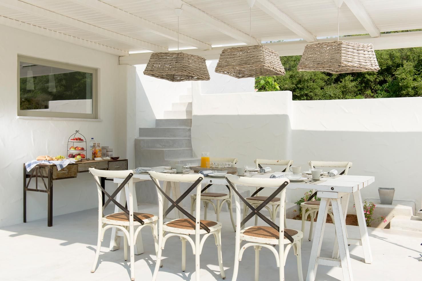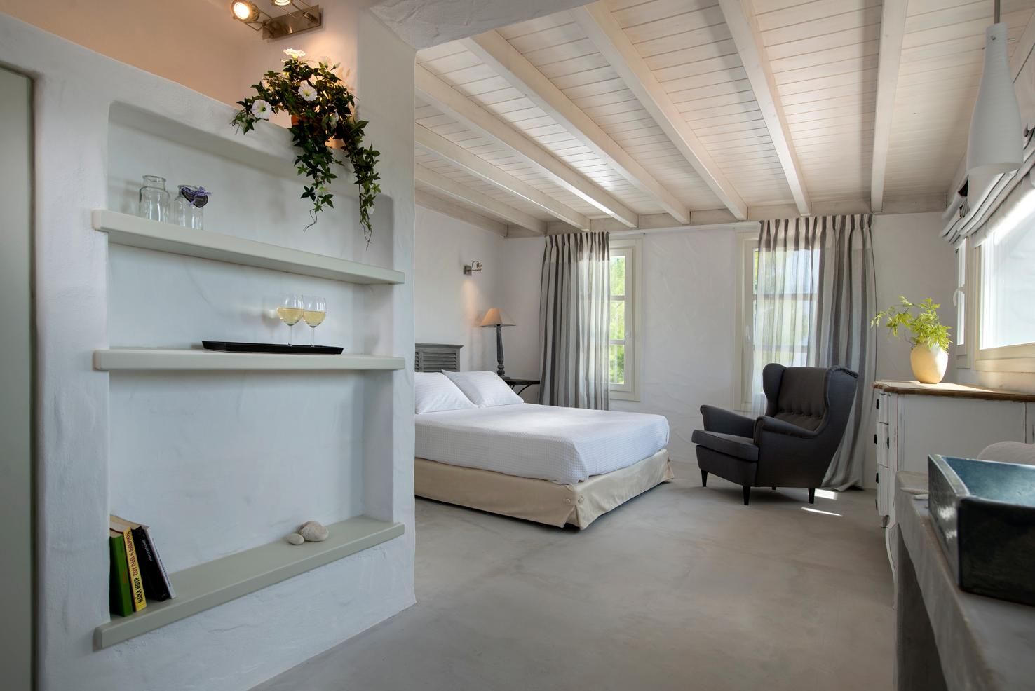 Isolated from urban areas, this home really plays into the charming serenity of its surroundings. Set over two floors, this bright white villa looks traditional from the outside. Sandwiched between blue skies above and the blue waters of your private freshwater pool below, the exterior colour scheme might remind you of a certain national flag. This Greek theme continues with olive trees and a welcome basket full of local wine and fresh fruits. Pour a glass to sip as you explore the grounds, passing below the shaded dining terrace and into the minimalist interiors.