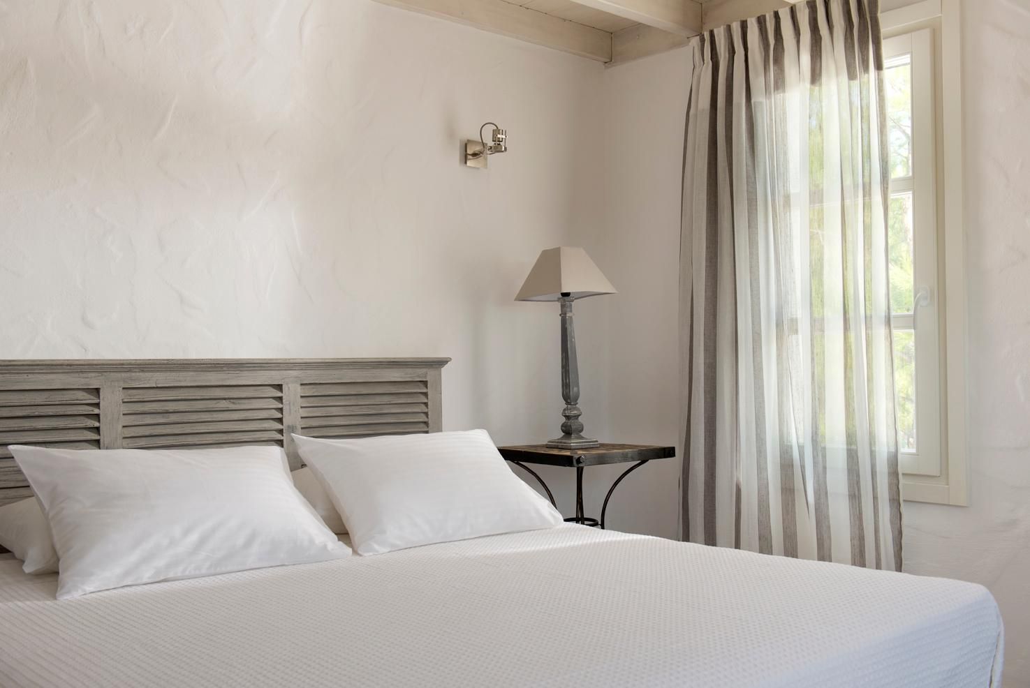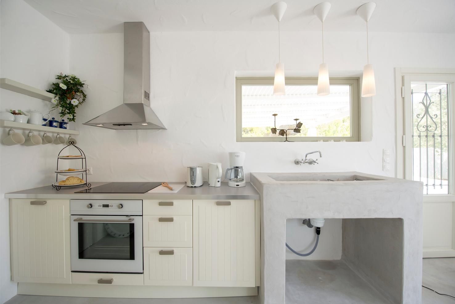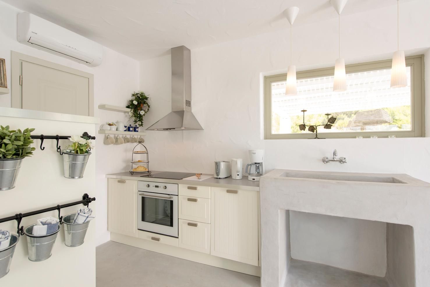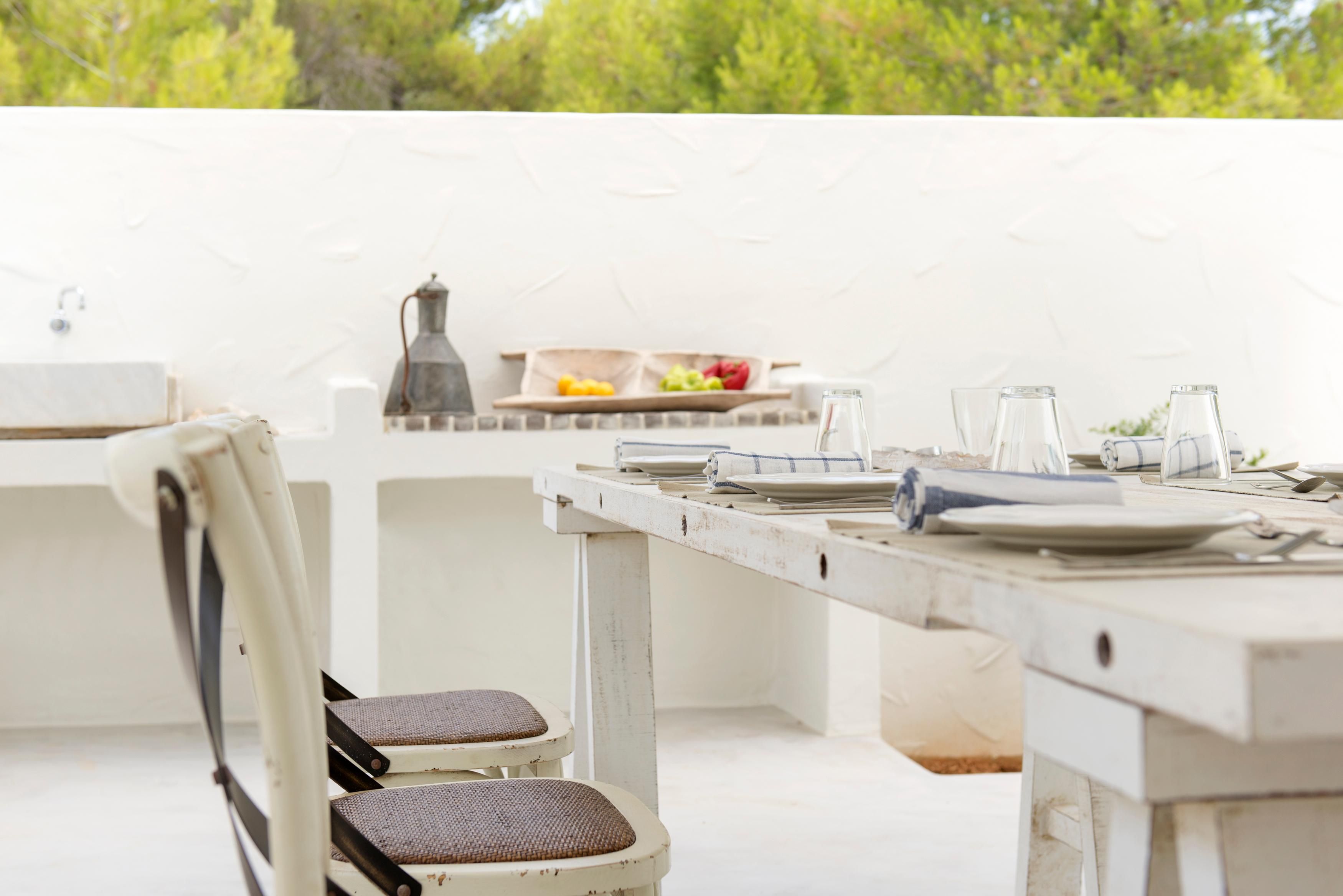 Isolated from urban areas, this home really plays into the charming serenity of its surroundings. Set over two floors, this bright white villa looks traditional from the outside. Sandwiched between blue skies above and the blue waters of your private freshwater pool below, the exterior colour scheme might remind you of a certain national flag. This Greek theme continues with olive trees and a welcome basket full of local wine and fresh fruits. Pour a glass to sip as you explore the grounds, passing below the shaded dining terrace and into the minimalist interiors.