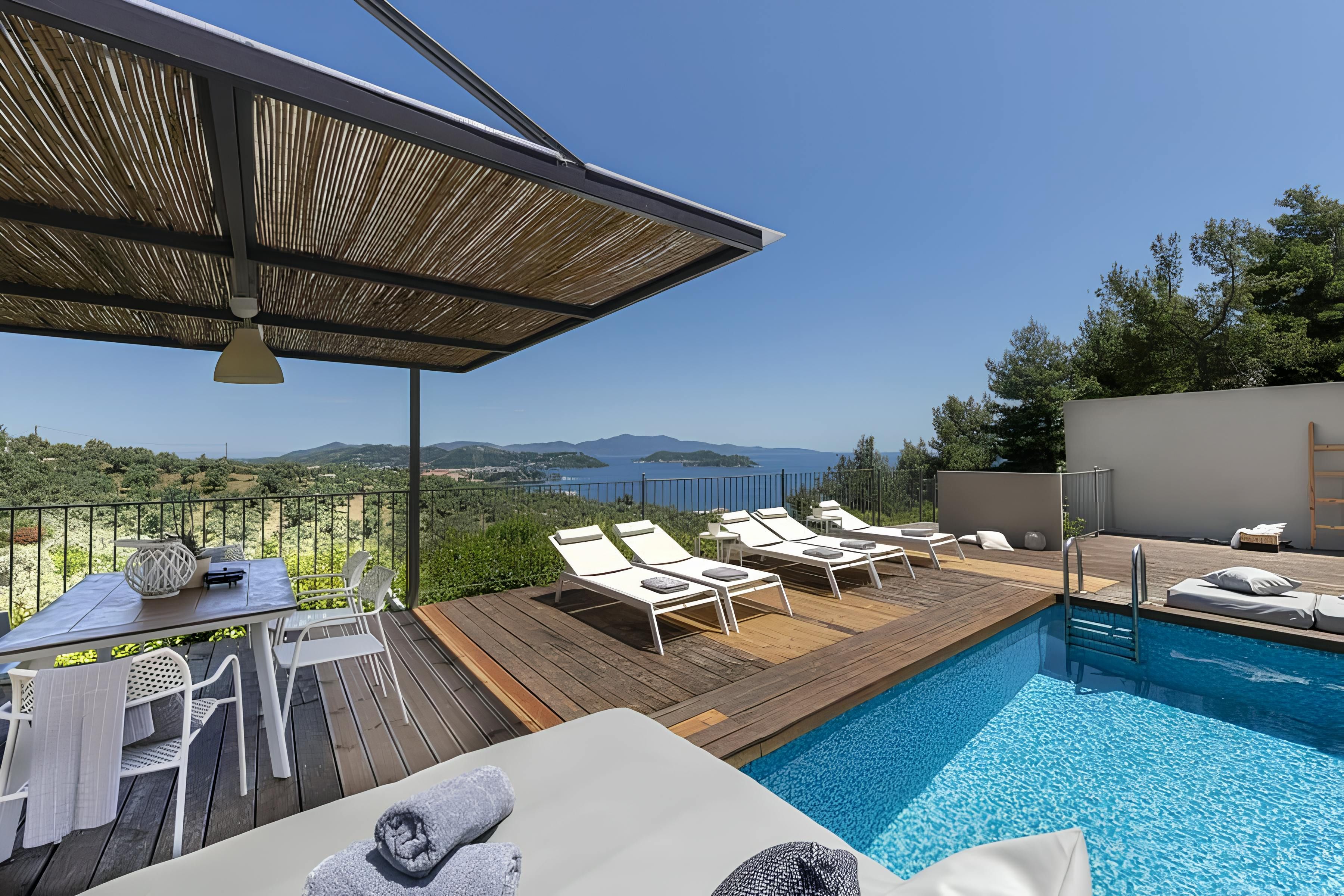 Villa Cassiope in Vasilias, Skiathos is a luxurious three-bedroom villa that promises an unforgettable holiday experience. The villa offers breathtaking sea views, facing the sea and Skopelos island. This hillside haven features a fully equipped kitchen, dining area, and lounge area all within a spacious 85 sqm unified area. The three separate bedrooms boast impressive queen's double beds while the two luxurious bathrooms provide stunning views of the pool and sea. Outdoors, enjoy the private pool surrounded by a 55 sqm wooden deck area with a kiosk, lounge, dining facilities, sunbeds, and an electric BBQ. With amenities including internet access, air-conditioning, and a large veranda, this hilltop retreat caters to every need. Located away from city noise and immersed in nature's beauty, Villa Cassiope offers an idyllic setting for silence, wellness, and relaxation - while still being close to Skiathos town.