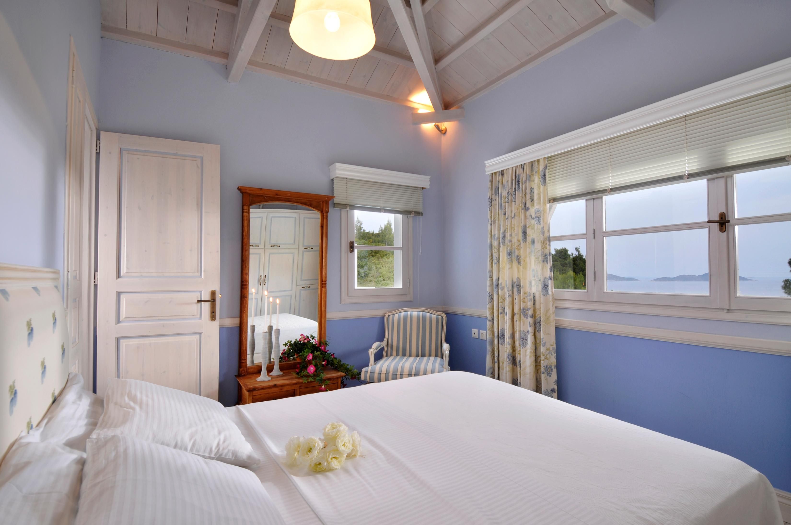 The lively port town of Patitiri is just ten minutes away by car. You could rent a boat and go sailing, or even take a coastal tour on a yacht. Steni Vala is a wonderful fishing village nearby – an eleven-minute drive. There you’ll find incredible seafood restaurants and a seascape dotted with fishing boats. The beach is just four minutes away in the car, or you can stroll there in twenty minutes and take in more of the villa’s lush surroundings. The restaurant and cafe at the beach serve excellent food so you can really make a day of it.