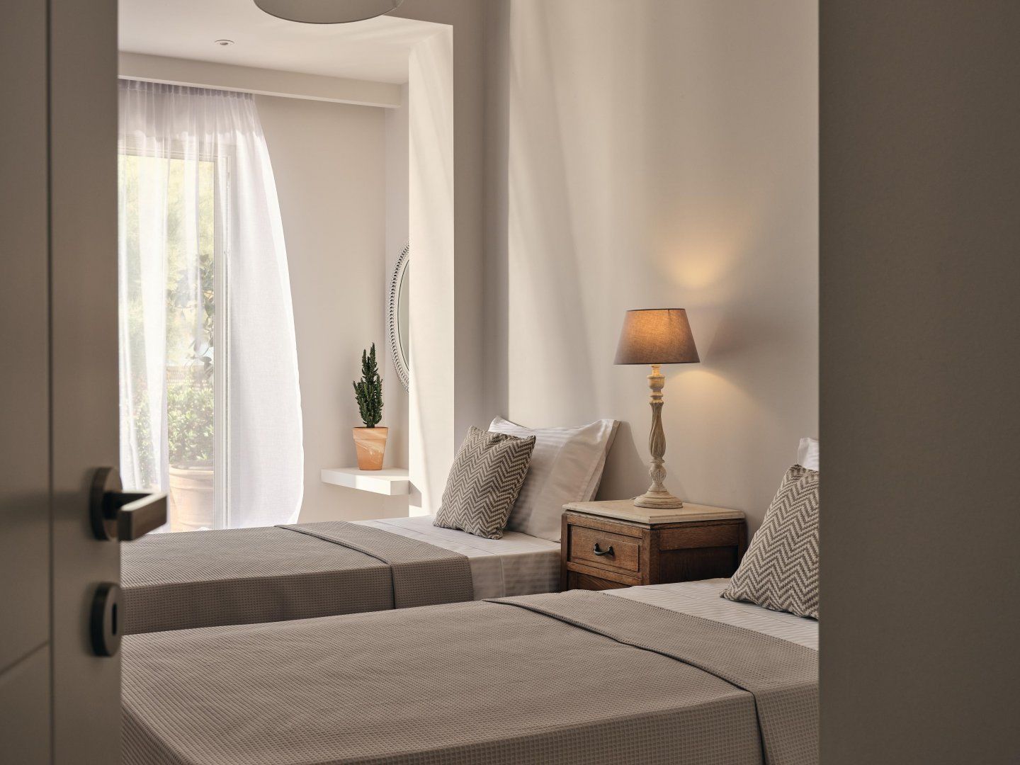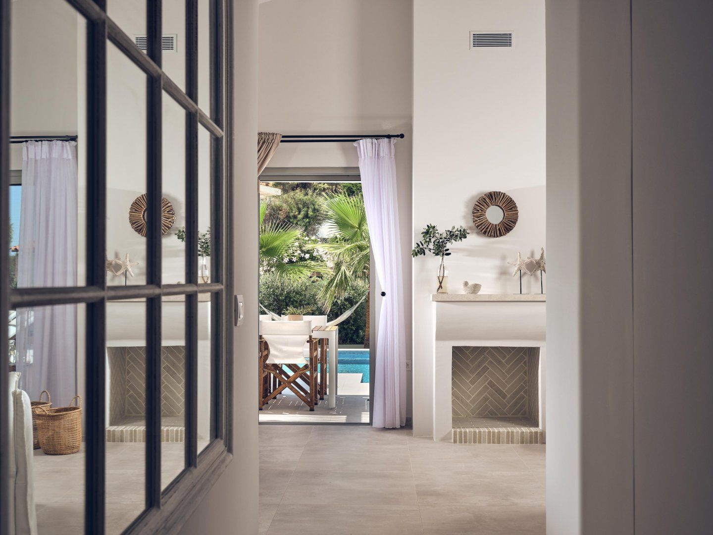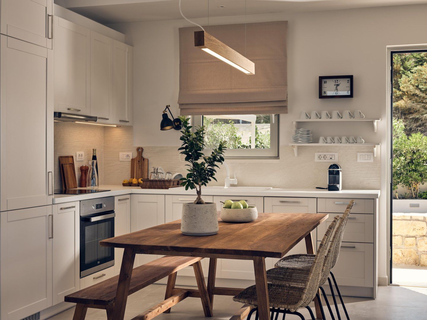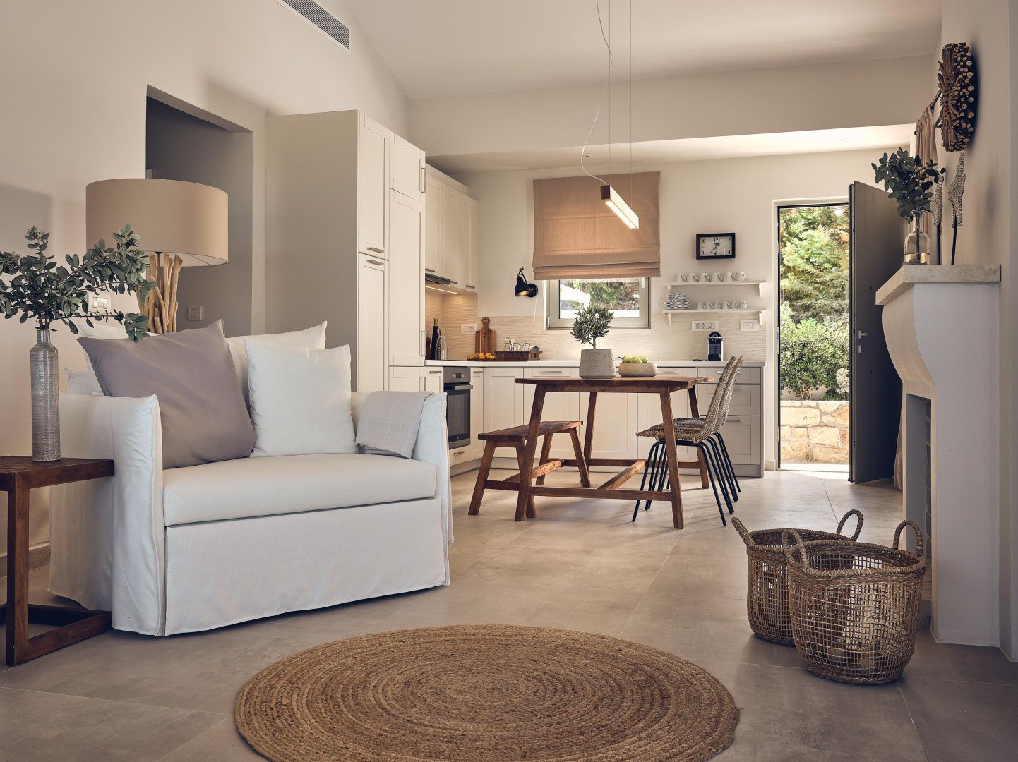The interior is a tranquil, zen-like space decorated in soothing earth tones, with plenty of natural materials that help you settle into your Greek getaway. The main open-plan living space includes a sleek contemporary kitchen, a triangle frame wooden dining table, and a stylish seating area with jaw-dropping sea views and direct access to the perfectly manicured gardens. Two bedrooms also enjoy outdoor access, while a third has an en-suite shower room.
