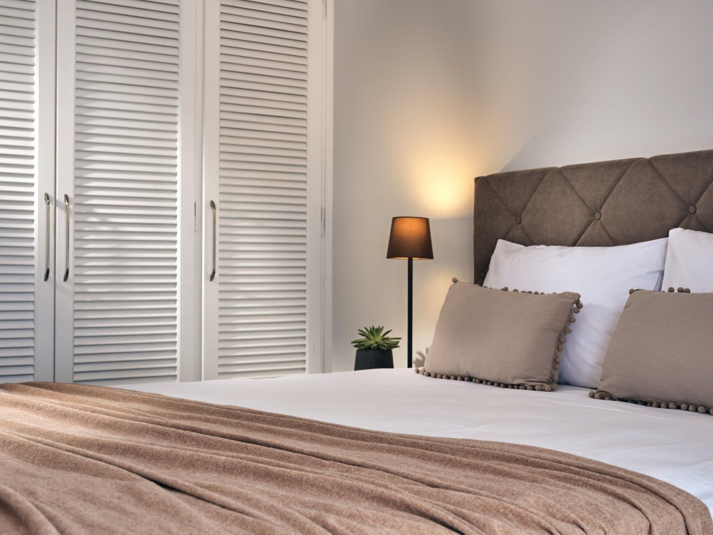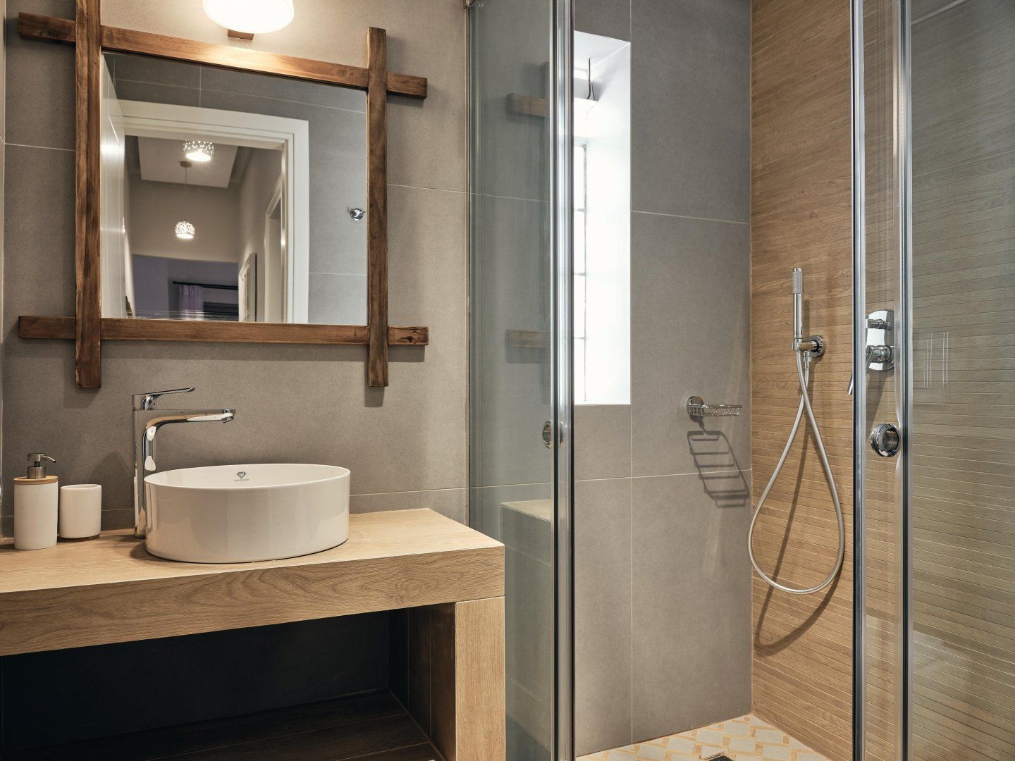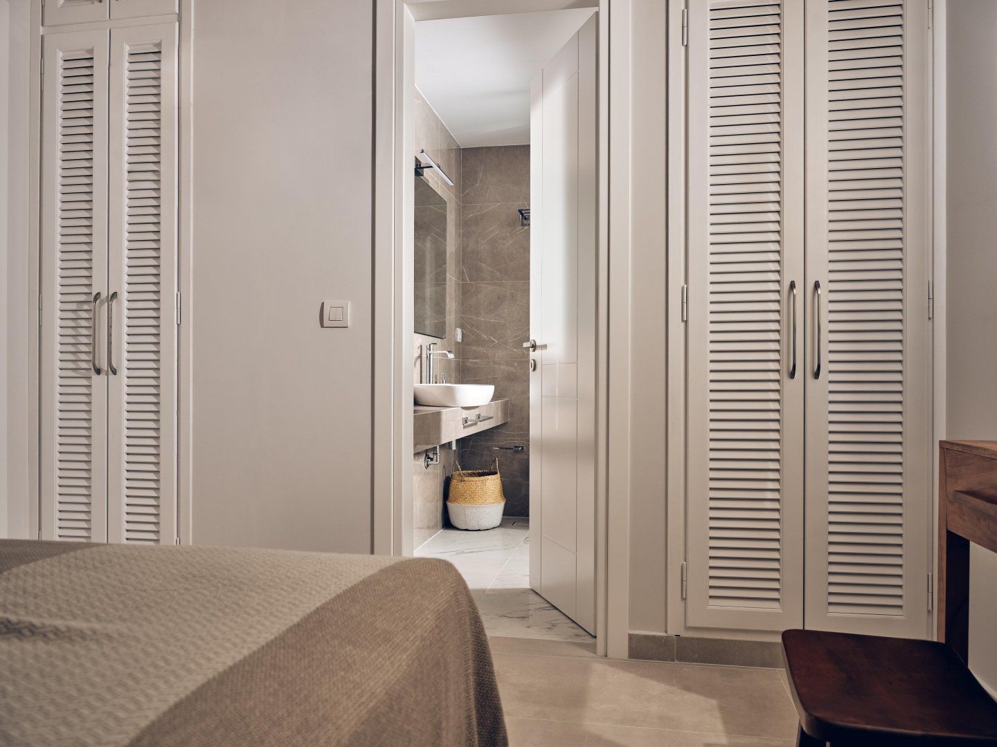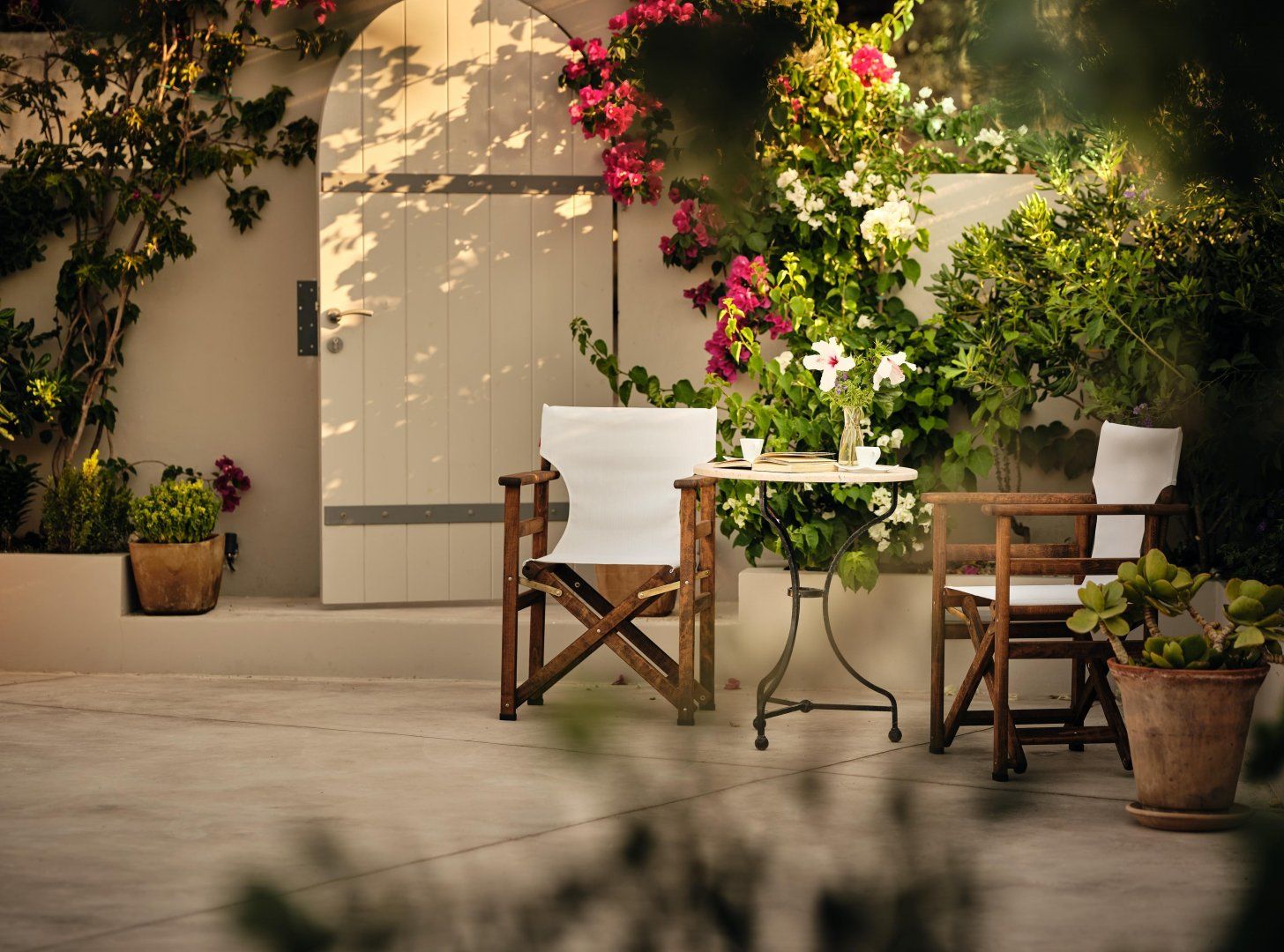 The interior is a tranquil, zen-like space decorated in soothing earth tones, with plenty of natural materials that help you settle into your Greek getaway. The main open-plan living space includes a sleek contemporary kitchen, a triangle frame wooden dining table, and a stylish seating area with jaw-dropping sea views and direct access to the perfectly manicured gardens. Two bedrooms also enjoy outdoor access, while a third has an en-suite shower room.