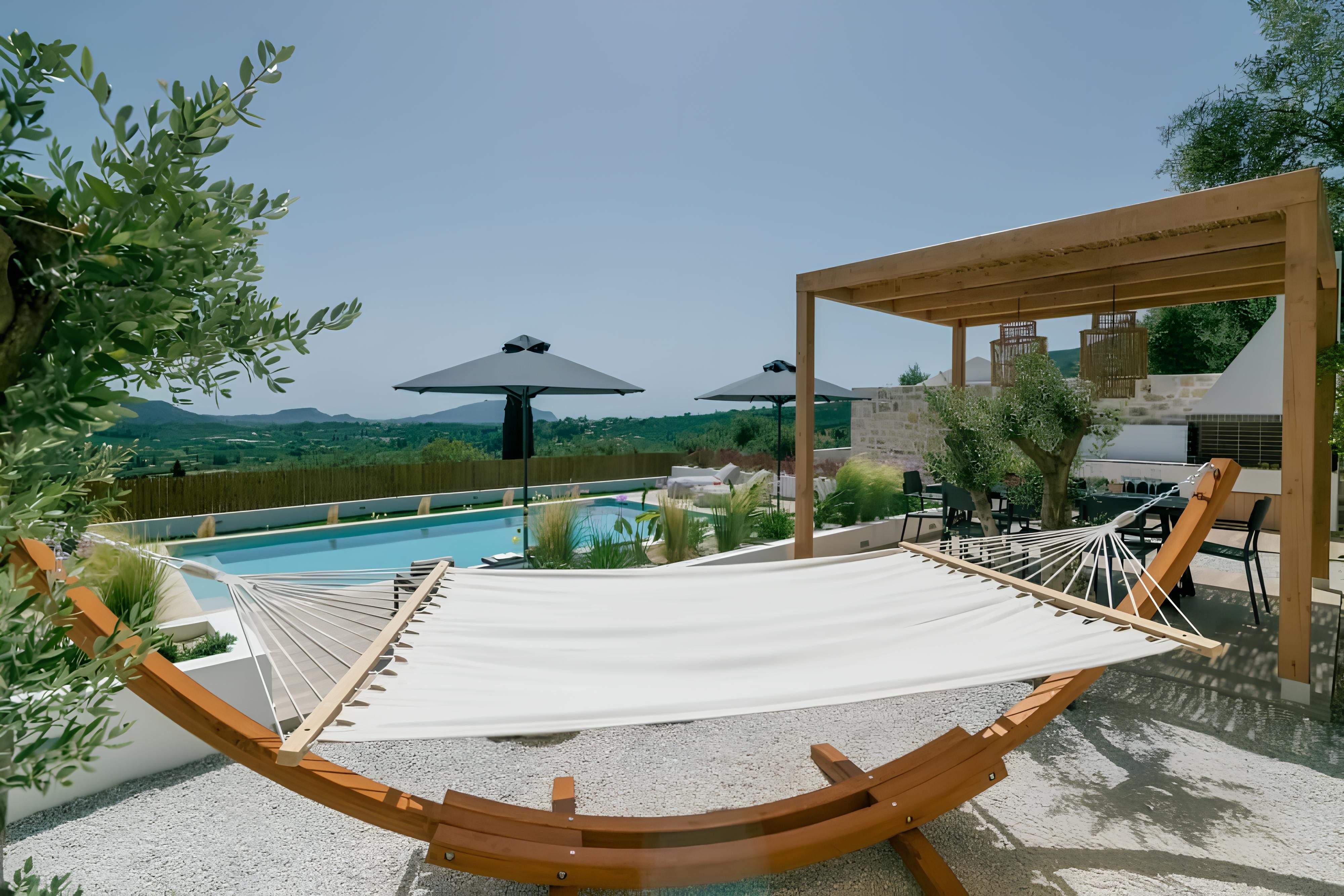 Surrounded by greenery in Kallithea, this villa comes with wide views across the hills and out to sea. The pool is the main event, paired with a barbecue and outdoor dining spot that’s made for long, easy meals in the sun. Two bedrooms open onto a shared balcony – a good spot to start the day if you’re quick to claim it. You’re around 15 kilometres from Zante Town, while Alykes’ beach, tavernas and cafés are a short drive away. It’s a peaceful base rather than a walk-everywhere location – you’ll want a car to get around.