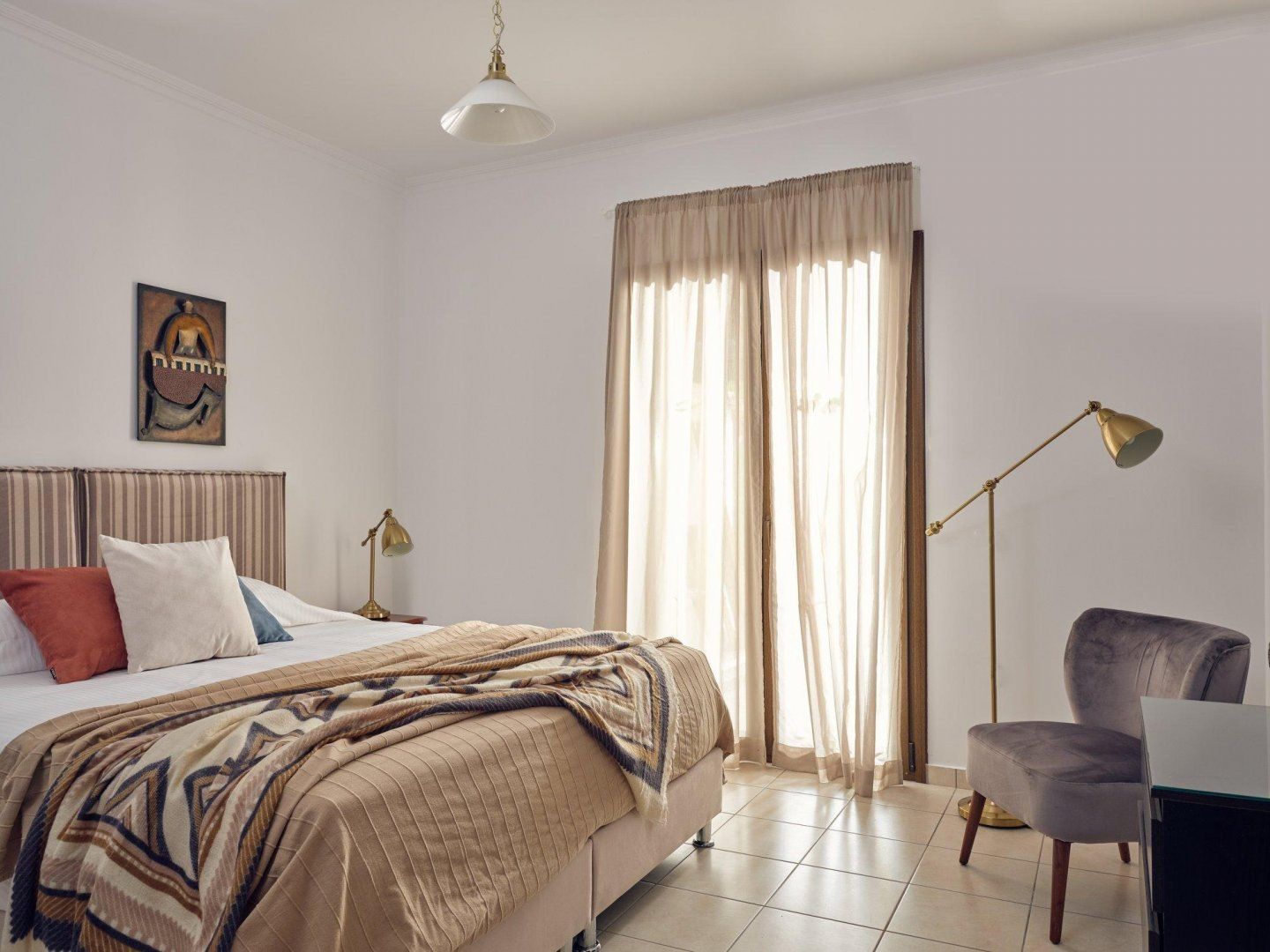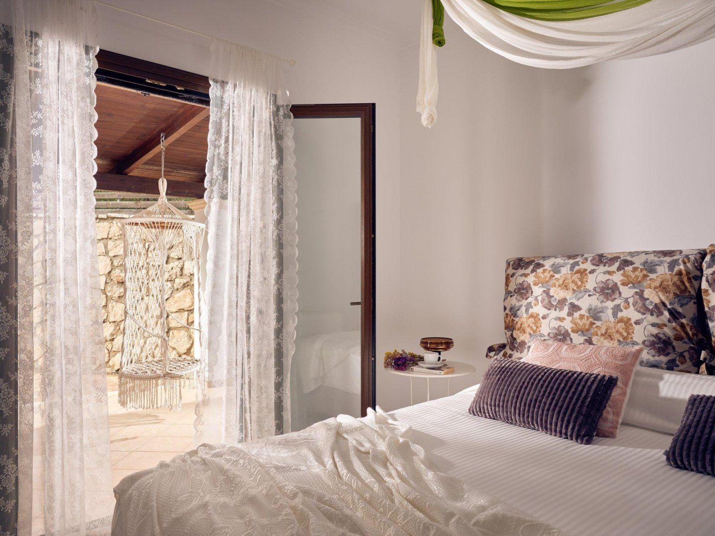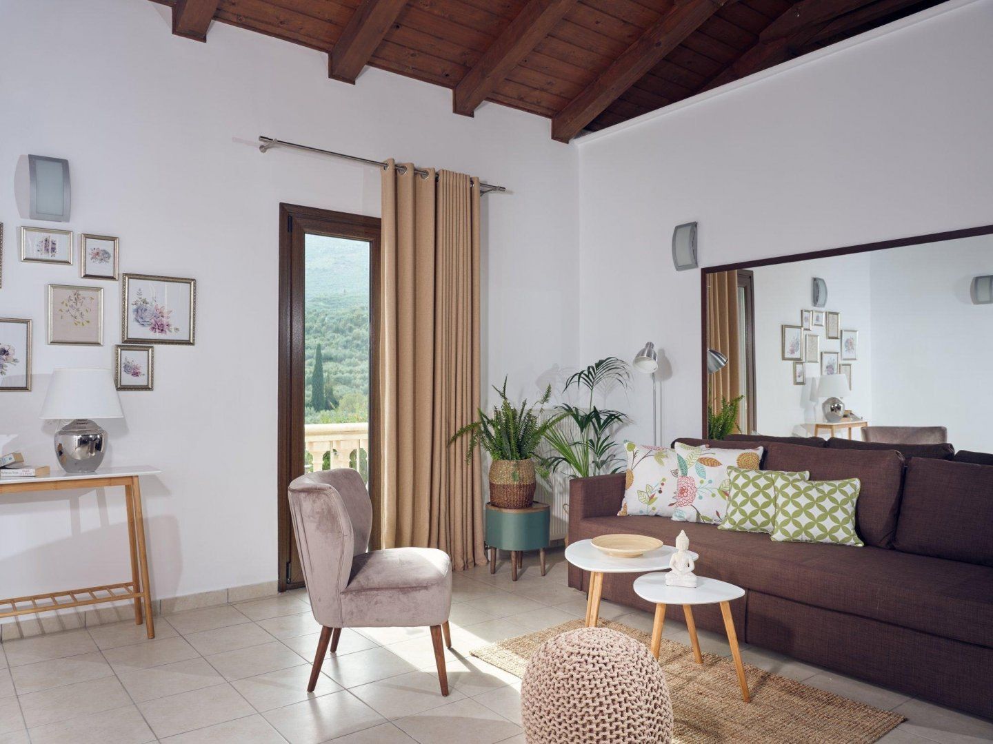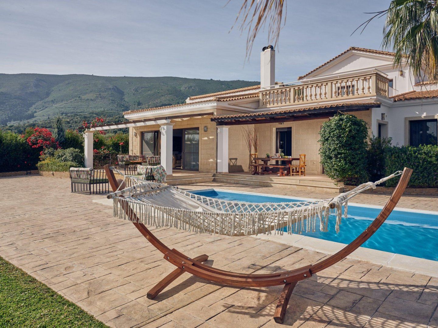 Inside, a modestly traditional and thoughtfully modern interior awaits. Floor-to-ceiling windows allow the Ionian Ocean light to flood into the traditional-beamed space and neutral tones reflect the calm island disposition. It’s easy to pass the time lost in your new summer read on the plush sofas or lounging in your poolside hammock, breathing in the salt-perfumed breeze.