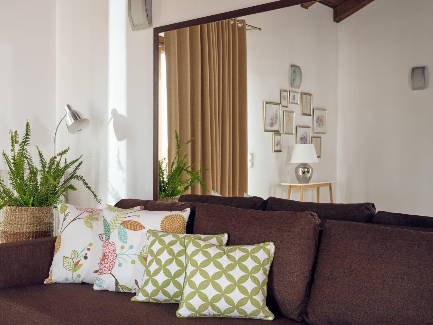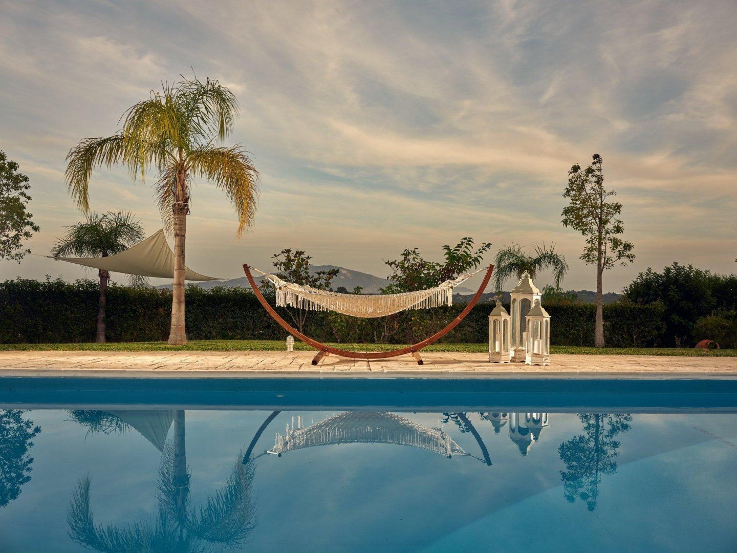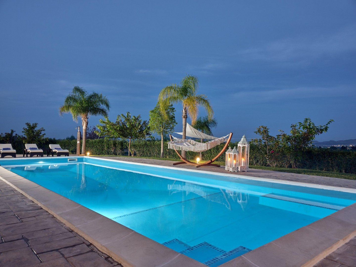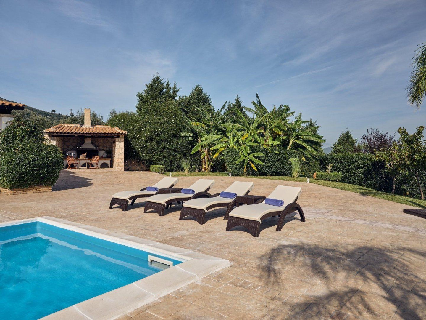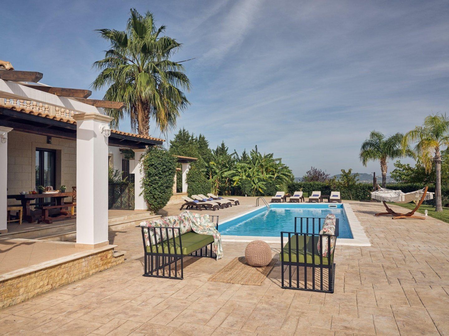 Inside, a modestly traditional and thoughtfully modern interior awaits. Floor-to-ceiling windows allow the Ionian Ocean light to flood into the traditional-beamed space and neutral tones reflect the calm island disposition. It’s easy to pass the time lost in your new summer read on the plush sofas or lounging in your poolside hammock, breathing in the salt-perfumed breeze.