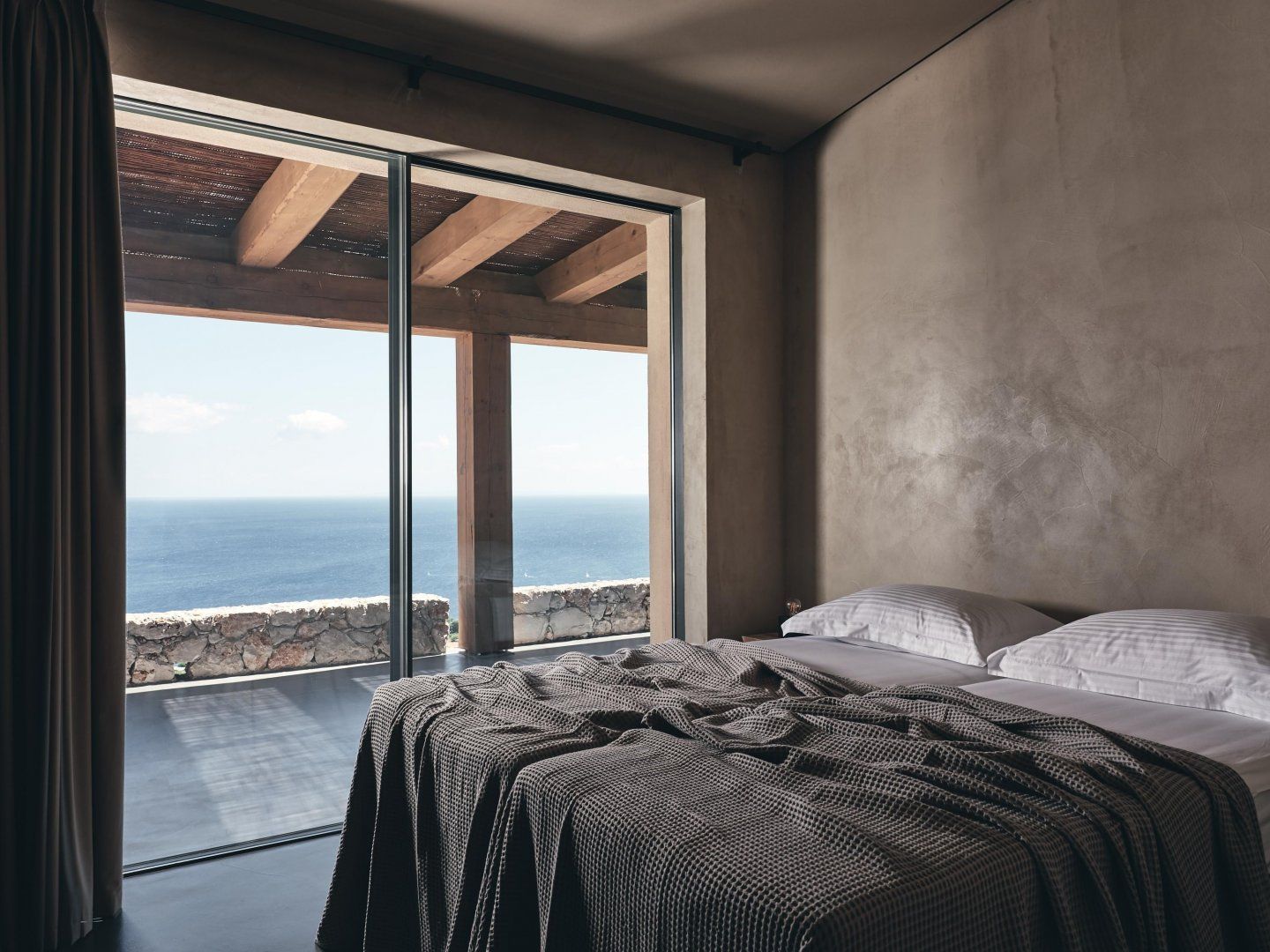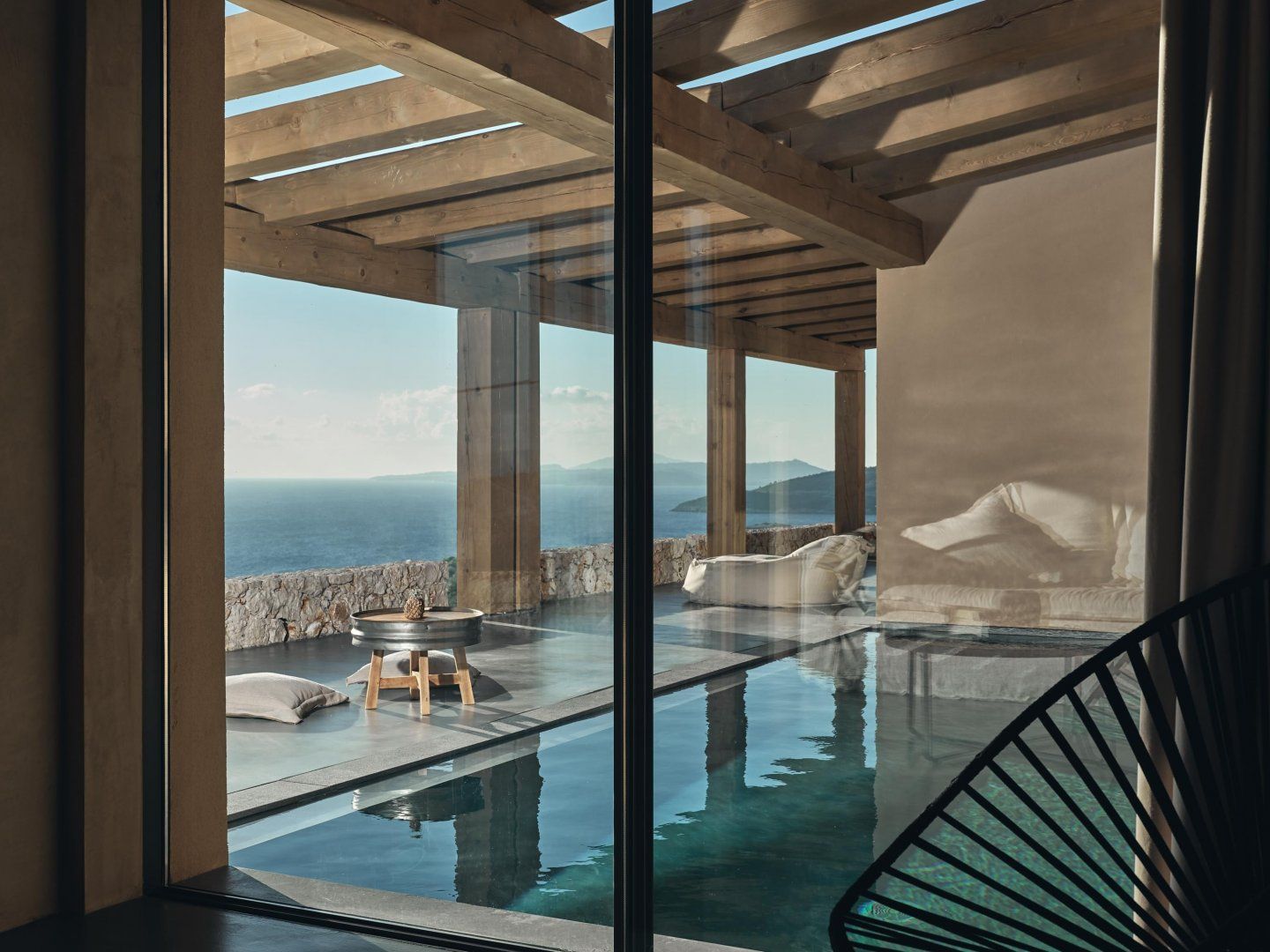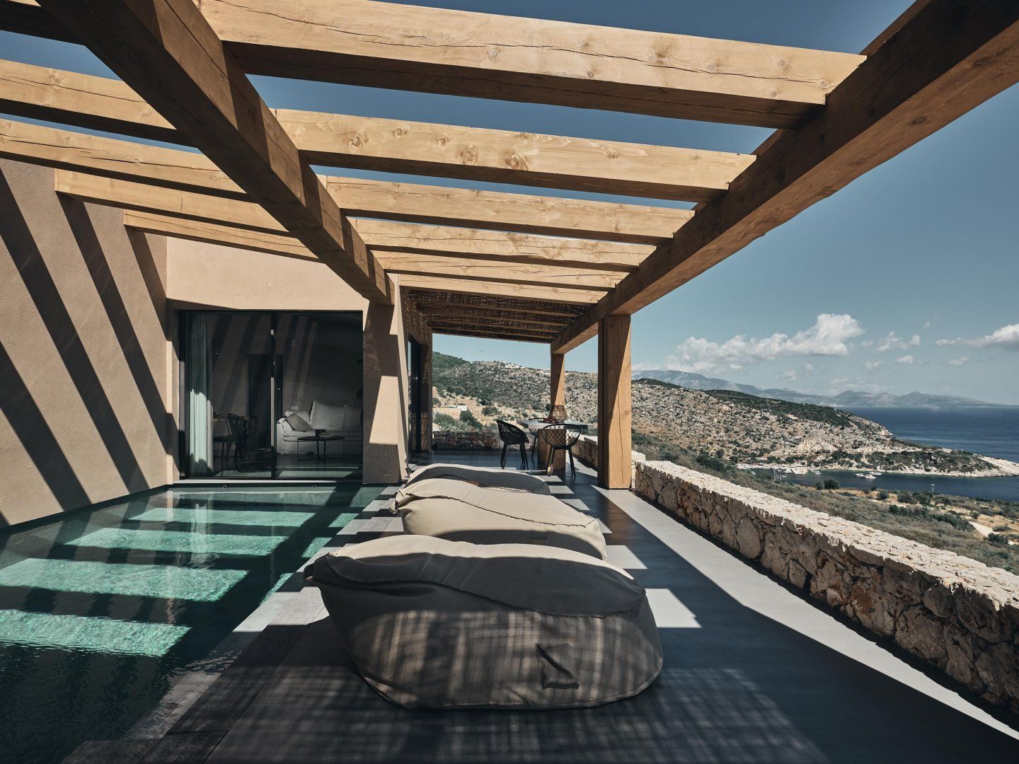 The architecture manages to delicately balance a striking example of construction, with limited impact on its surroundings. Exterior spaces flow around the coastal, hilltop setting, where natural stone walls frame a vast terrace and chunky timber beams create a pagoda. The private pool sits in an alcove between the interior and the exterior, while beanbags and dining sets line the foreground.