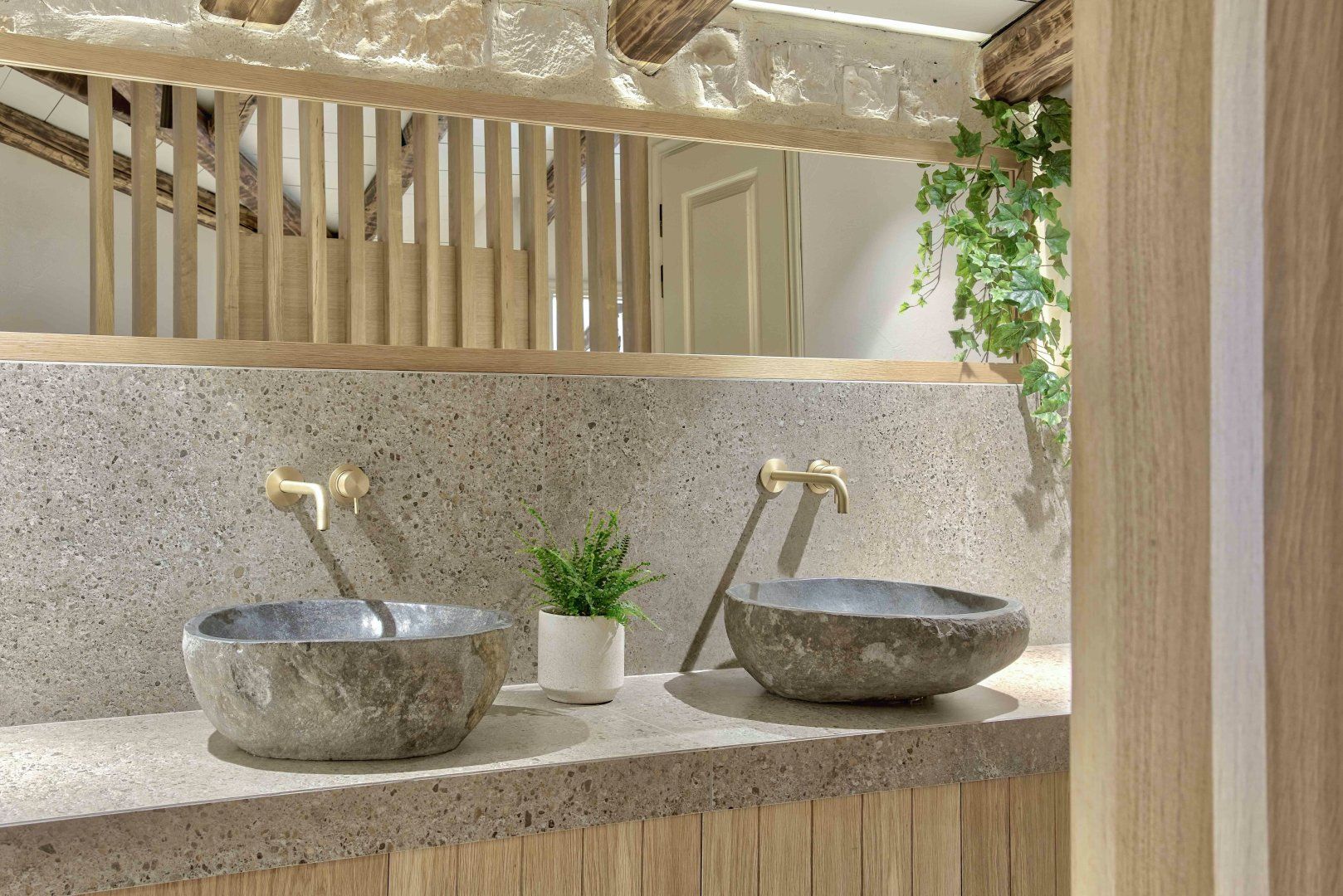 Inside the home, exposed stone walls and timber beams create a cool yet cosy atmosphere. Steal a moment for yourself with a cup of coffee on the soft sofa before heading into the garden to pick produce from the vegetable patch in preparation for lunch.