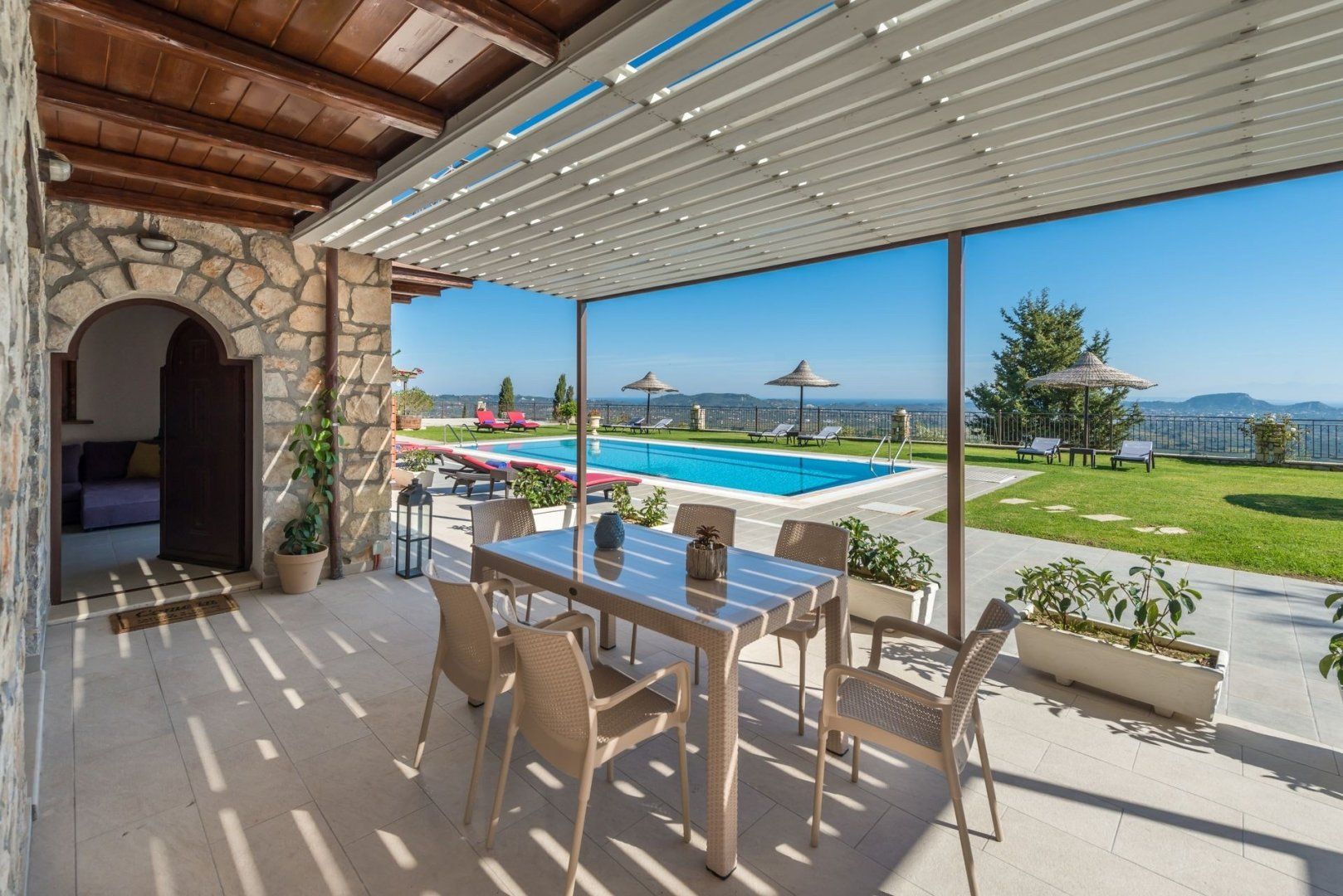 Set on a hillside, surrounded with olive and cypress trees, this impressive stone villa is split into four apartments – yours being the largest and most modern. Sharing a vast amount of outdoor space, you'll have a private section of the terrace where you can take in the incredible views over breakfast each morning and a shared pool that's surrounded by lawns dotted with sun loungers and parasols.