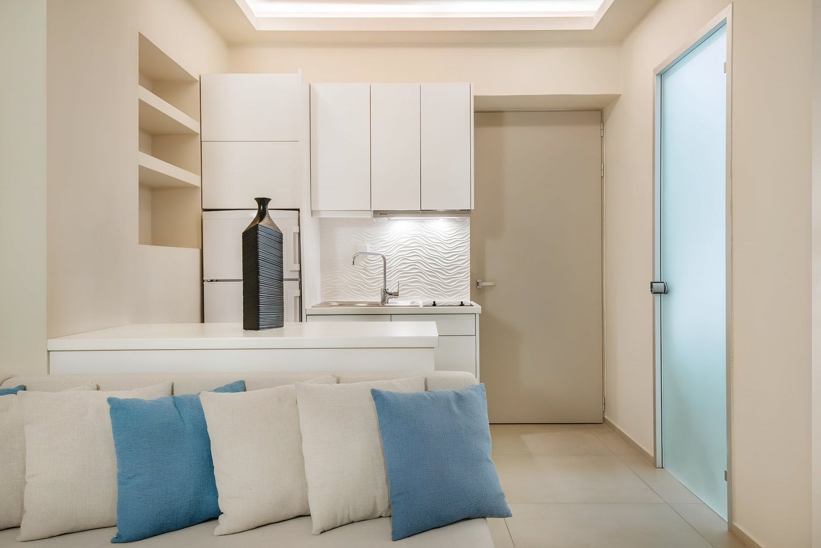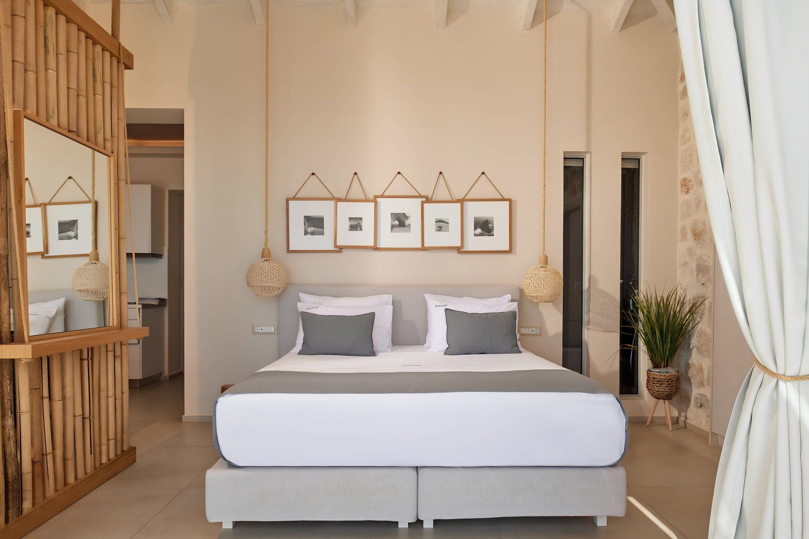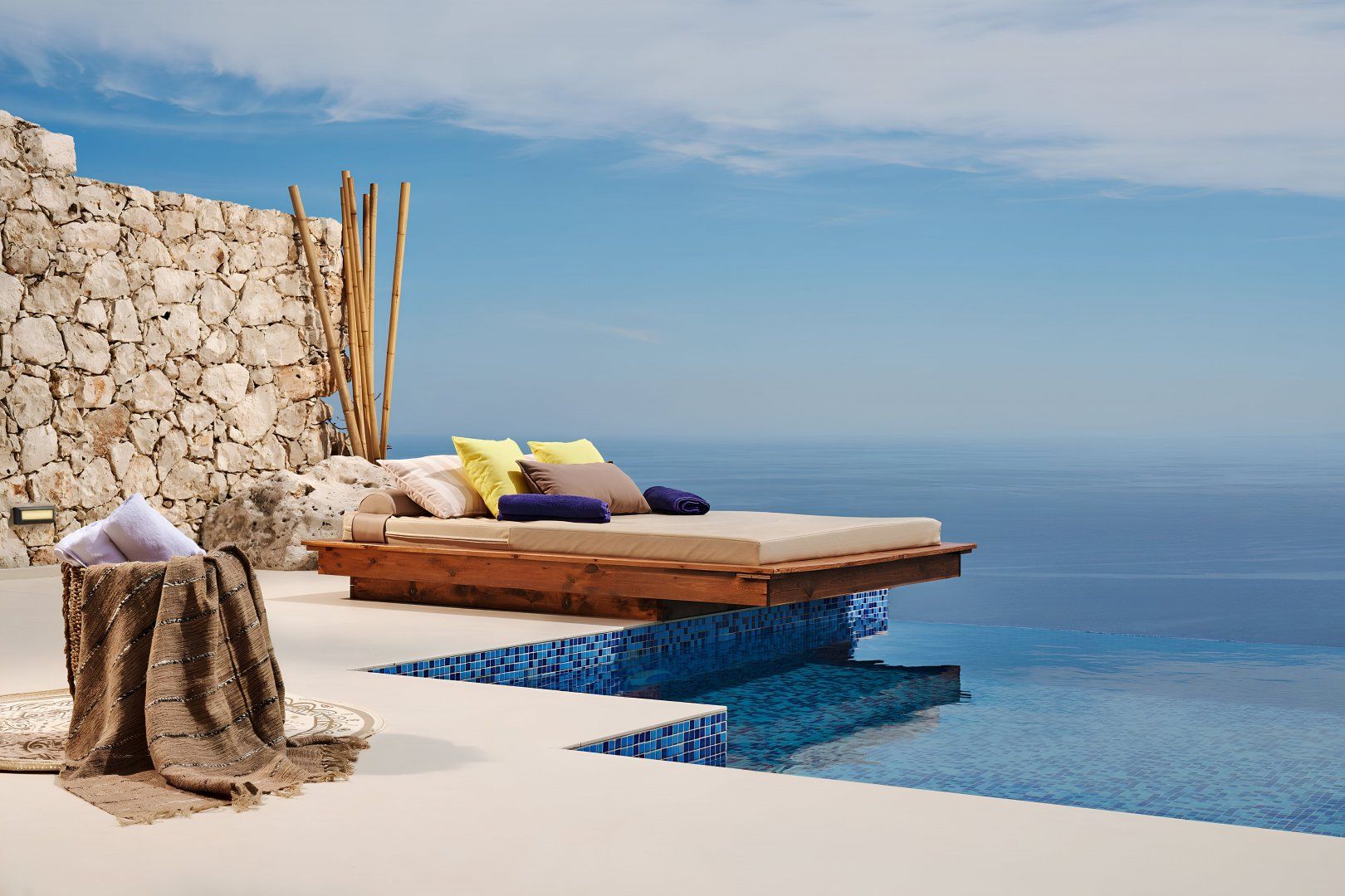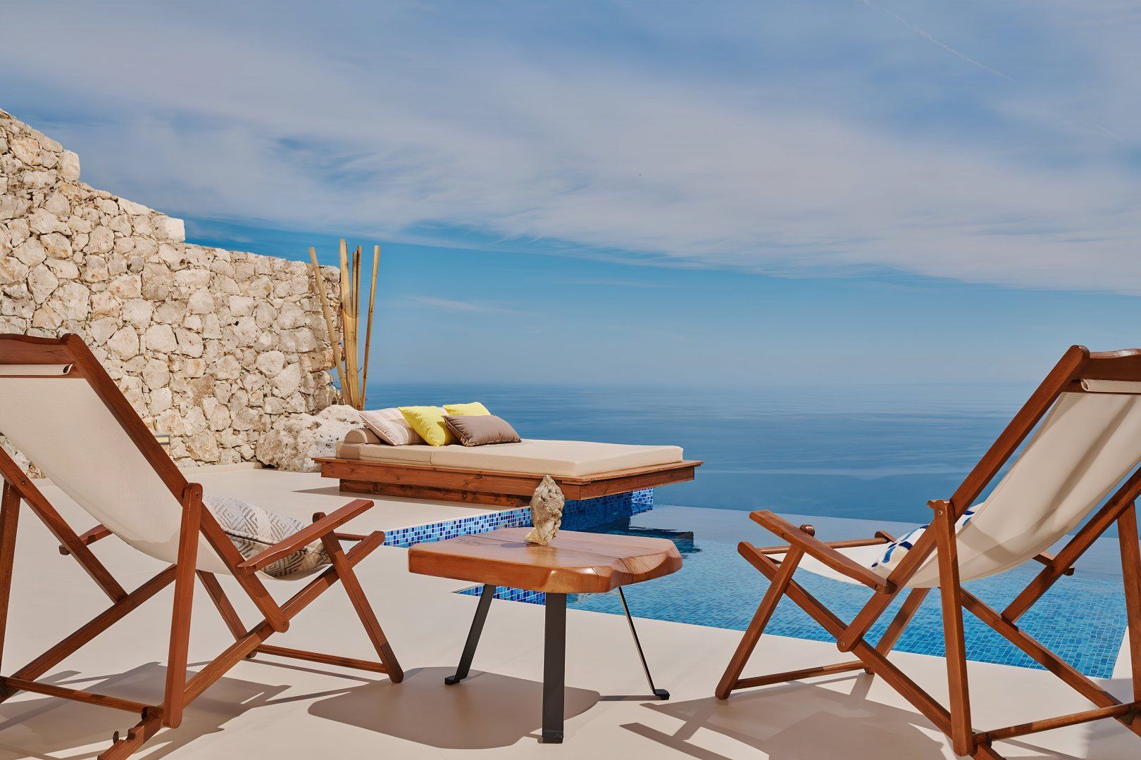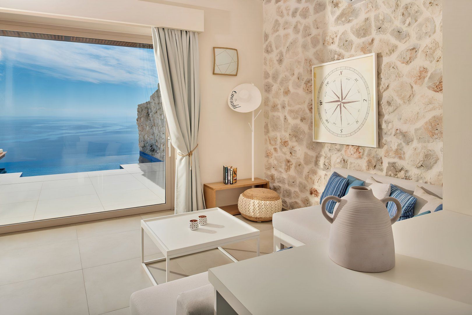 With a private infinity pool and stunning views of the Ionian Sea – this suite has been designed for outdoor living. Floor-to-ceiling sliding glass doors allow you to take in the sea vistas from both the living space and bedroom too. If you can tear yourself away, the village of Agios Nikolaos is nearby and is known for its traditional buildings and the area has some scenic drives along dramatic cliffs. Vibrant Zakynthos Town and Dionisios are 30 kilometres and 35 kilometres away respectively.