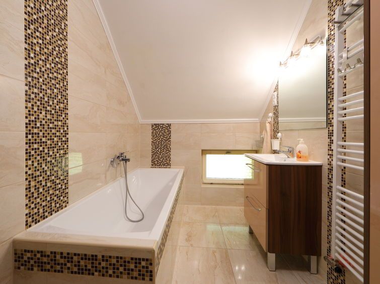 5-room house 100 m2 on 2 levels. Cosy furnishings: living room with dining nook and satellite TV (flat screen), air conditioning. Exit to the terrace. 1 room with 2 beds and air conditioning. 1 room with 2 beds. Open kitchen (3 hot plates, oven, dishwasher, microwave). Shower, sep.