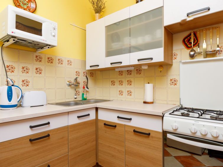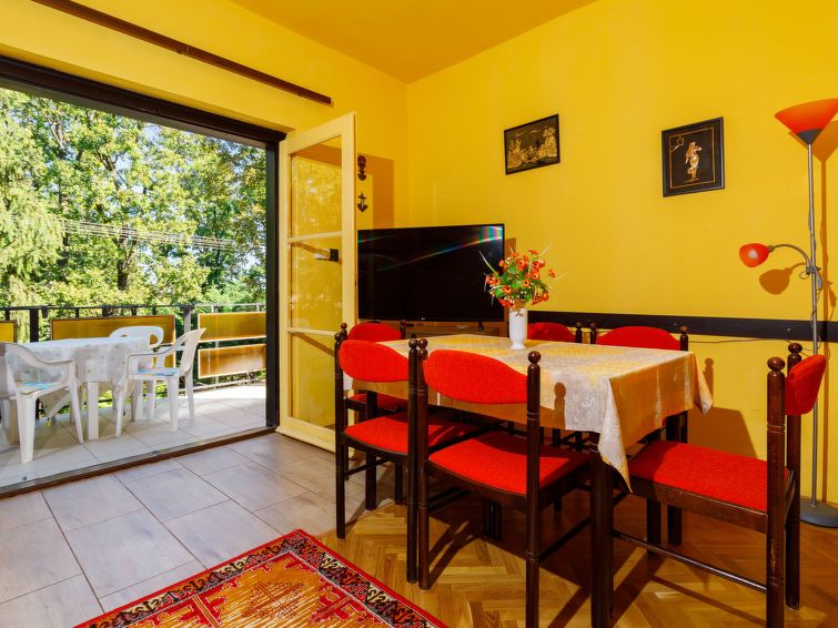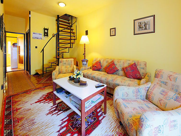 5-room semi-detached house 75 m2. Living room with satellite TV and international TV channels. Exit to the balcony. 1 room with 2 beds. Small kitchen (4 hot plates, oven, toaster, kettle, microwave, freezer). Exit to the terrace. Shower, sep. WC. No heating option. Upper floor: (steep stair), 1 room with 2 beds (180 cm, length 200 cm).