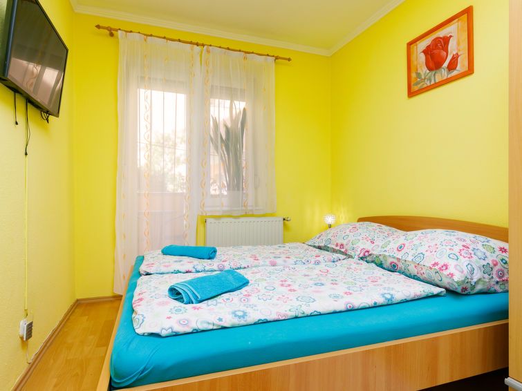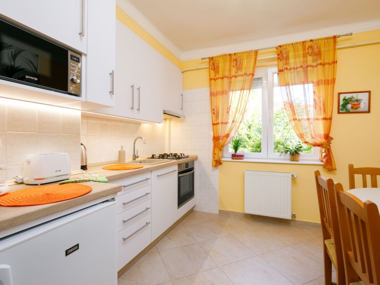 "Alice", 2-room apartment 60 m2, on the upper ground floor. In 2023, comfortable furnishings: living/sleeping room with 1 double sofabed (160 cm, length 200 cm), satellite TV. 1 room with 1 french bed (160 cm, length 200 cm), satellite TV. Exit to the balcony. Kitchen (oven, dishwasher, 4 gas rings, toaster, kettle, microwave, electric coffee machine) with dining table.
