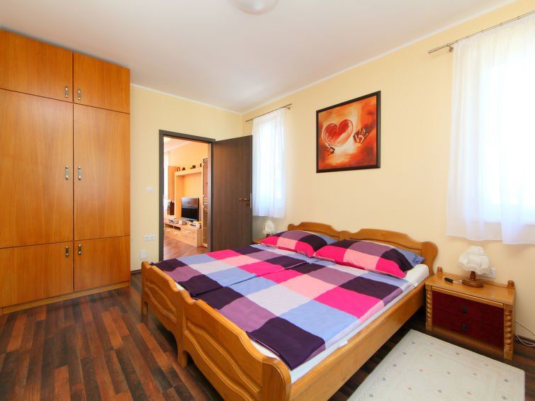 4-room apartment 110 m2, on the ground floor. Tasteful and cosy furnishings: large living/dining room with cable TV. Exit to the terrace. 1 room with 1 double bed (200 cm, length 200 cm), shower/WC. 1 room with 1 double bed (200 cm, length 200 cm), TV. 1 room with 2 beds. Open kitchen (4 hot plates, oven, dishwasher).