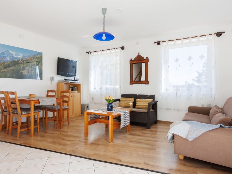 "Dul", 3-room house 80 m2 on 2 levels. Practical furnishings: living room with dining table, satellite TV and DVD. Small kitchen (4 gas rings, toaster, kettle, microwave, electric coffee machine). Bath/WC. No heating option. Top floor: with sloping ceilings, 1 room with 2 beds. 1 small room with 2 beds.